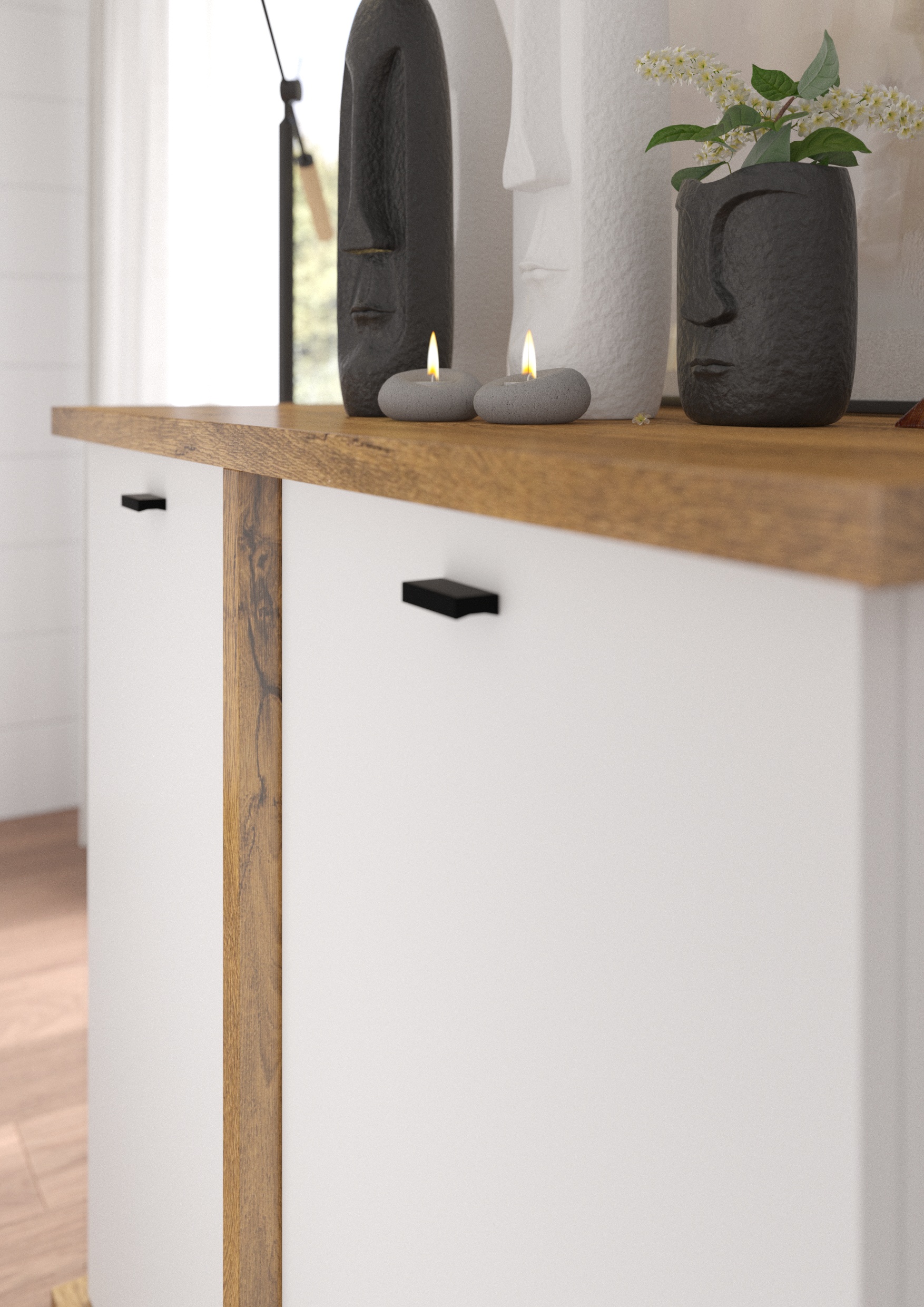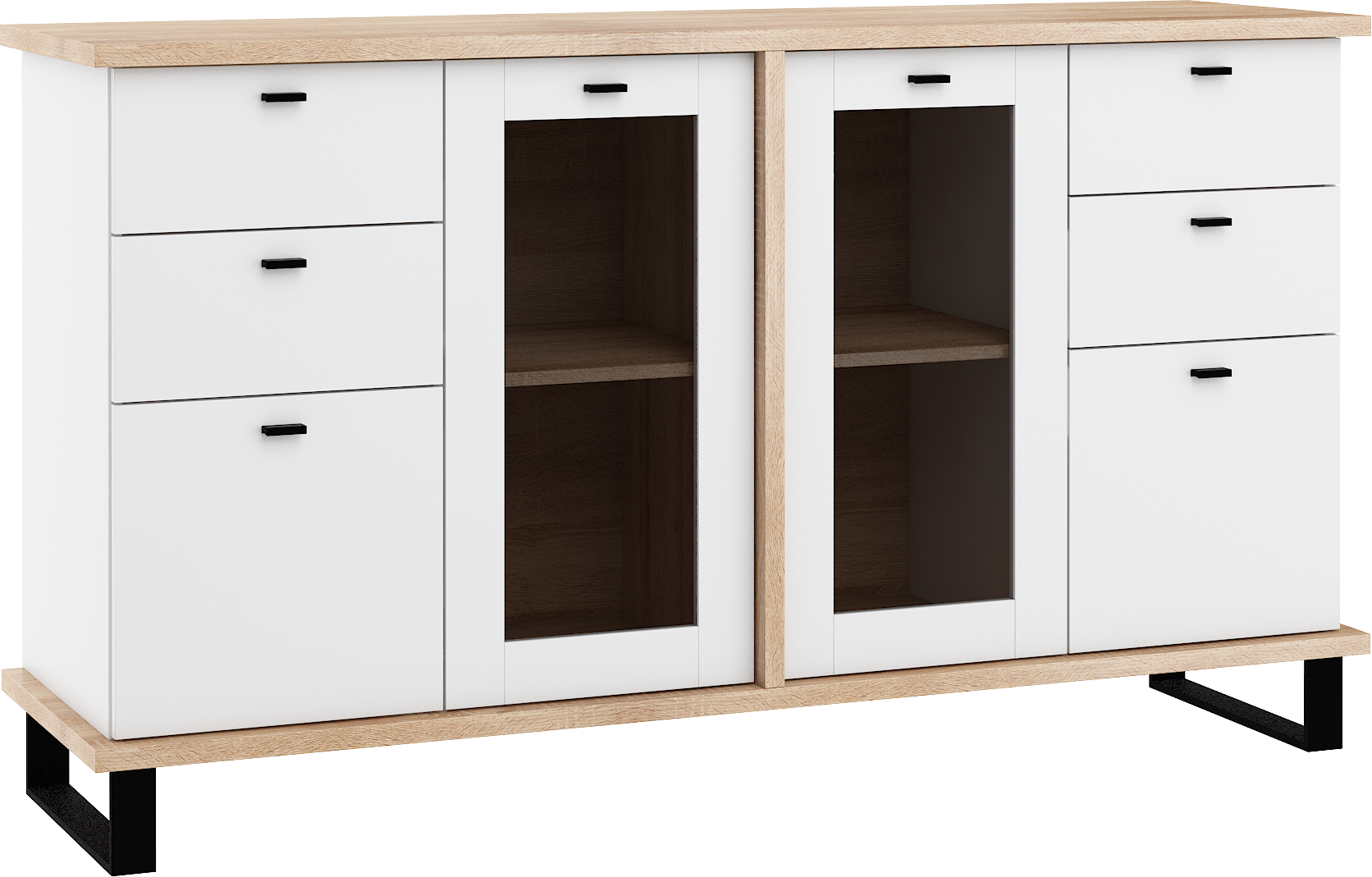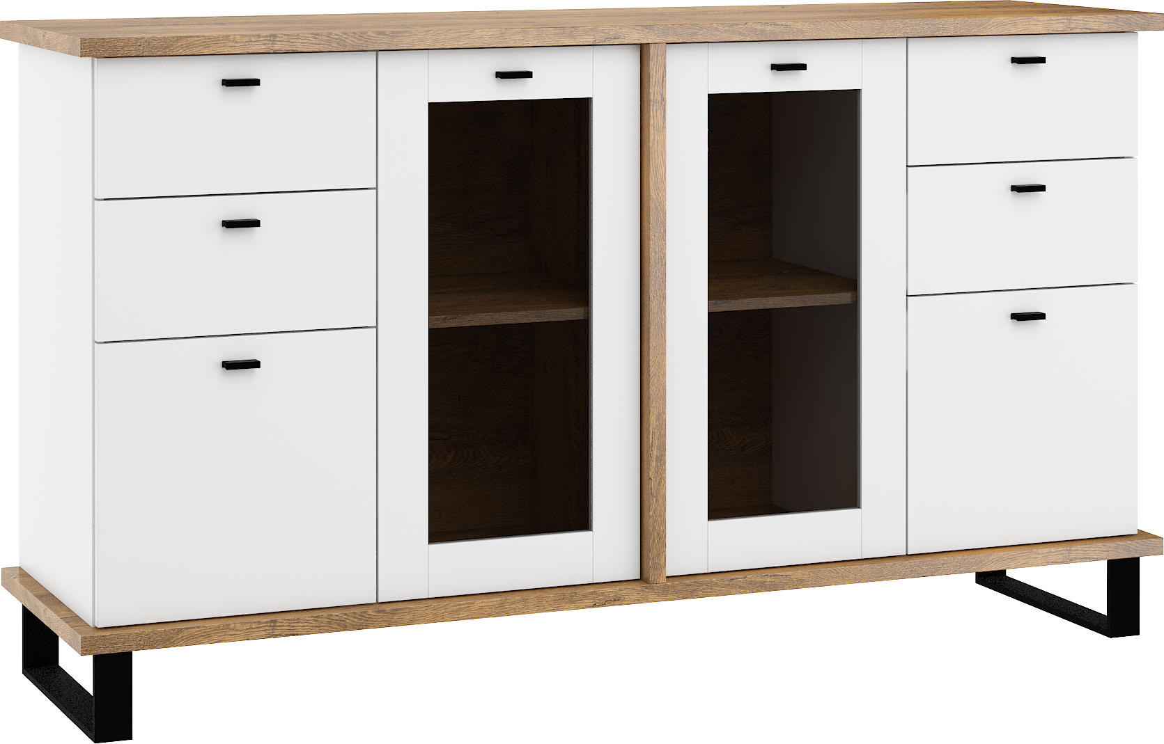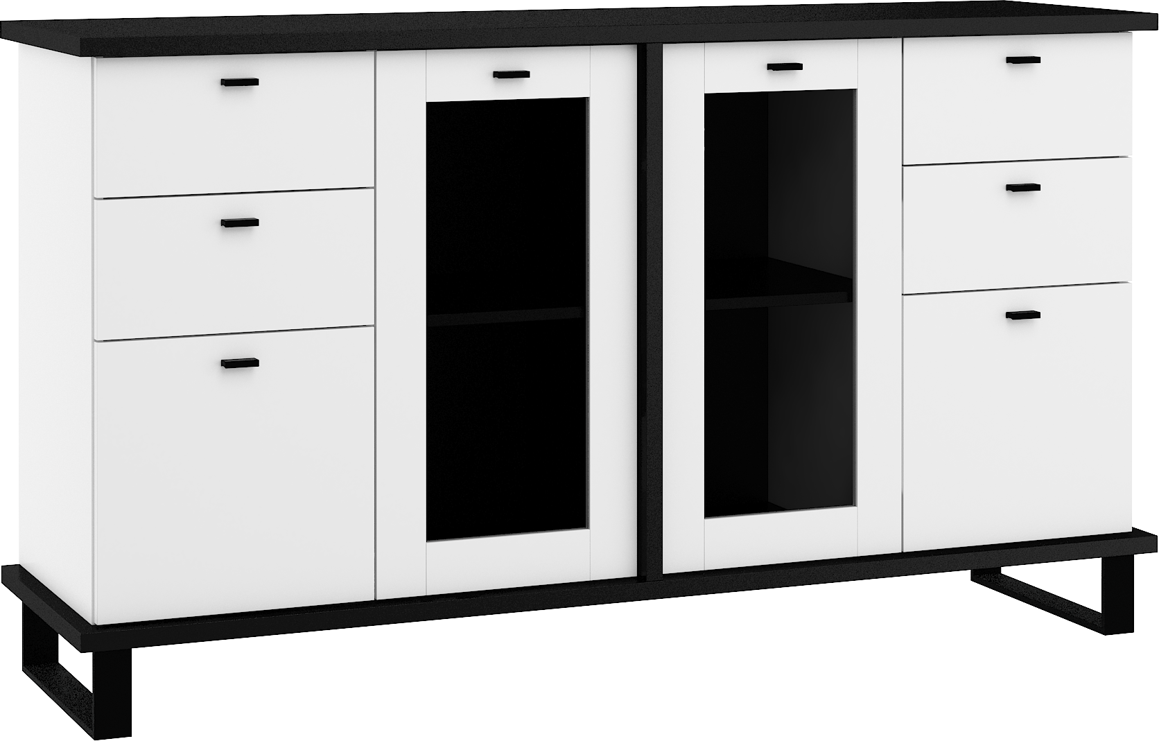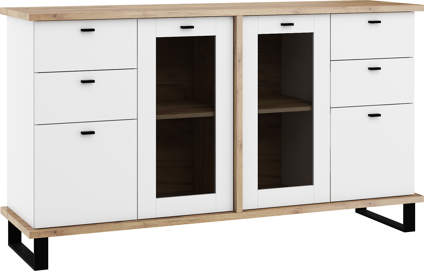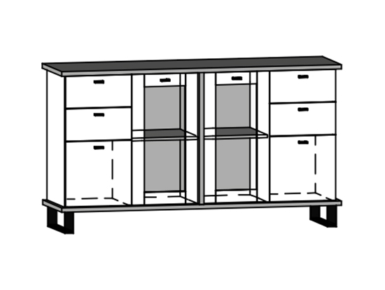 Komoda Cross 08 disponuje 4 zásuvkami, pod zásuvkami najdete na každé straně menší skříňku a uprostřed jsou 2 prostory s prosklenými dvířky. Uvnitř naleznete celkem 2 skleněné poličky (viz obrázek v galerii). Nožky jsou vysoké 12 cm.