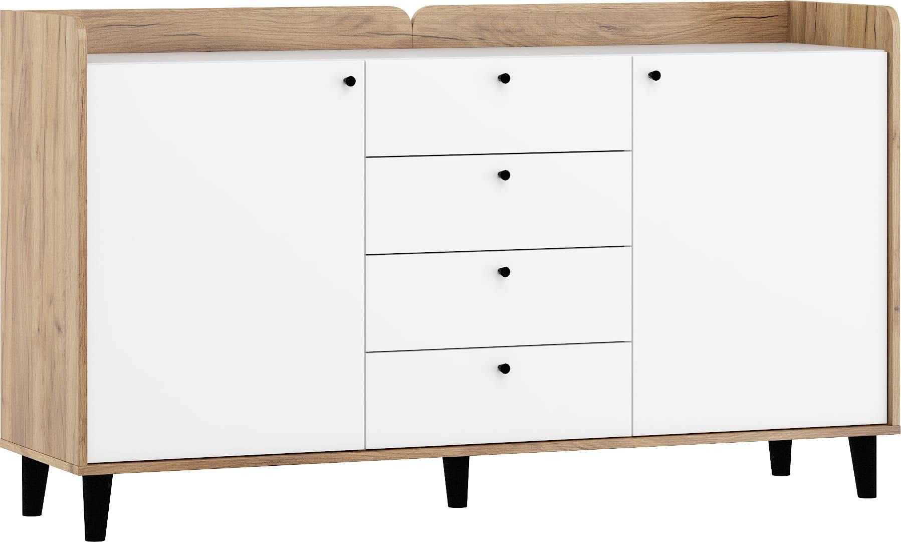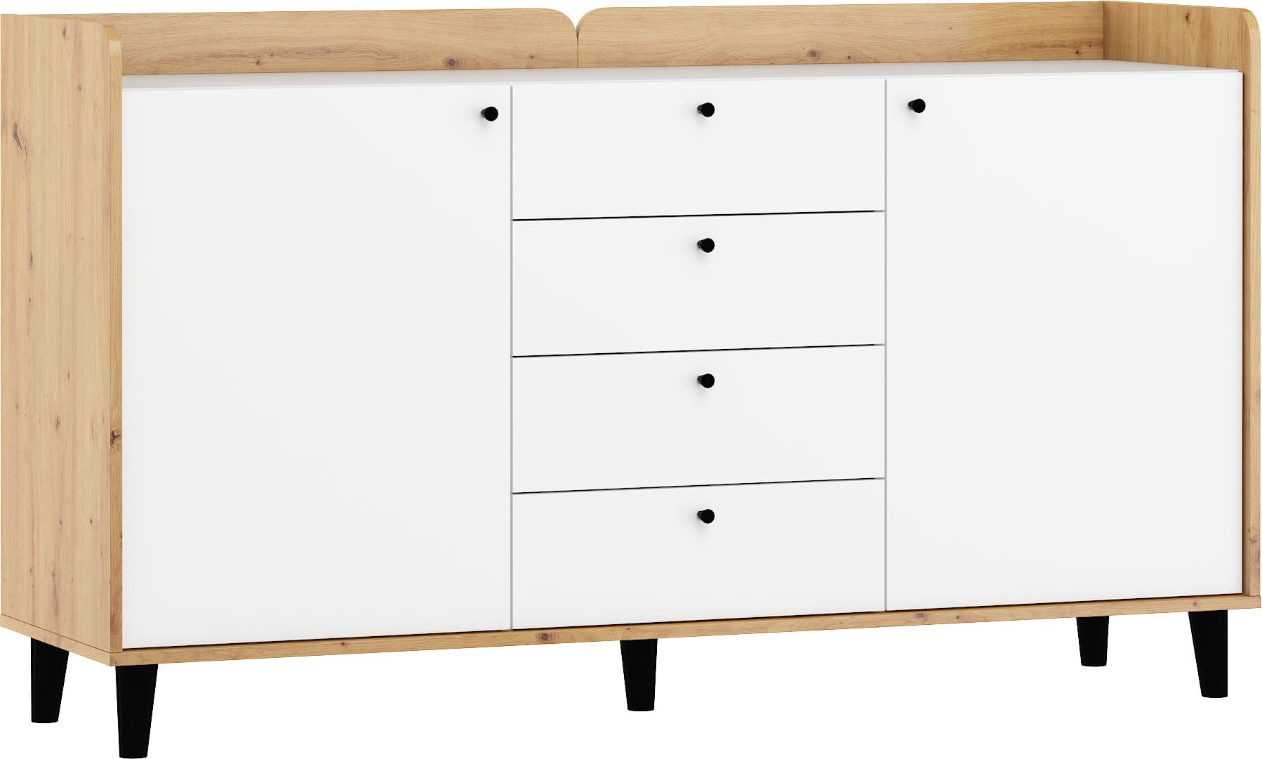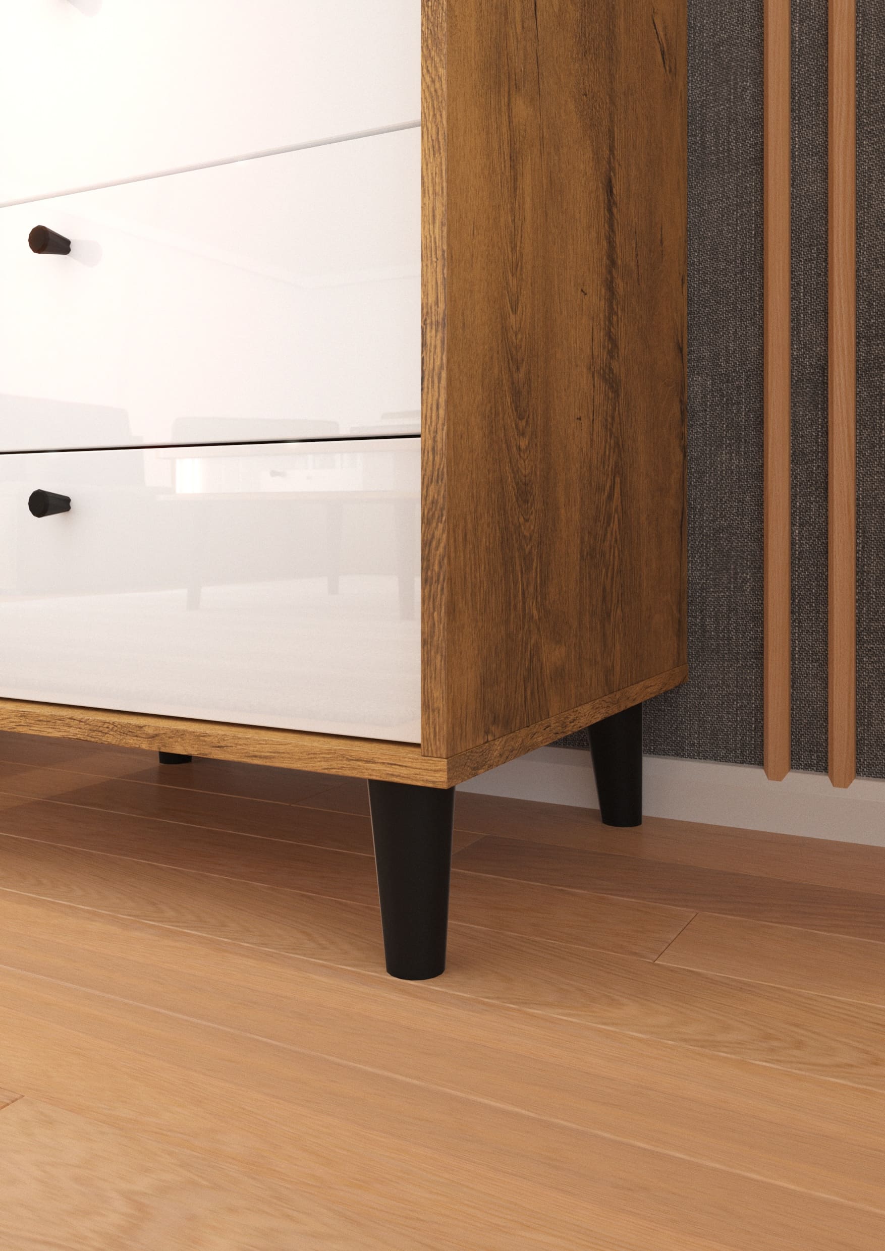 Kombinovaná komoda Dolce 06 disponuje 4 zásuvkami a 2 skříňkami s plnými dvířky. Uvnitř skříněk naleznete 1 poličku. Nožky jsou vysoké 12 cm.