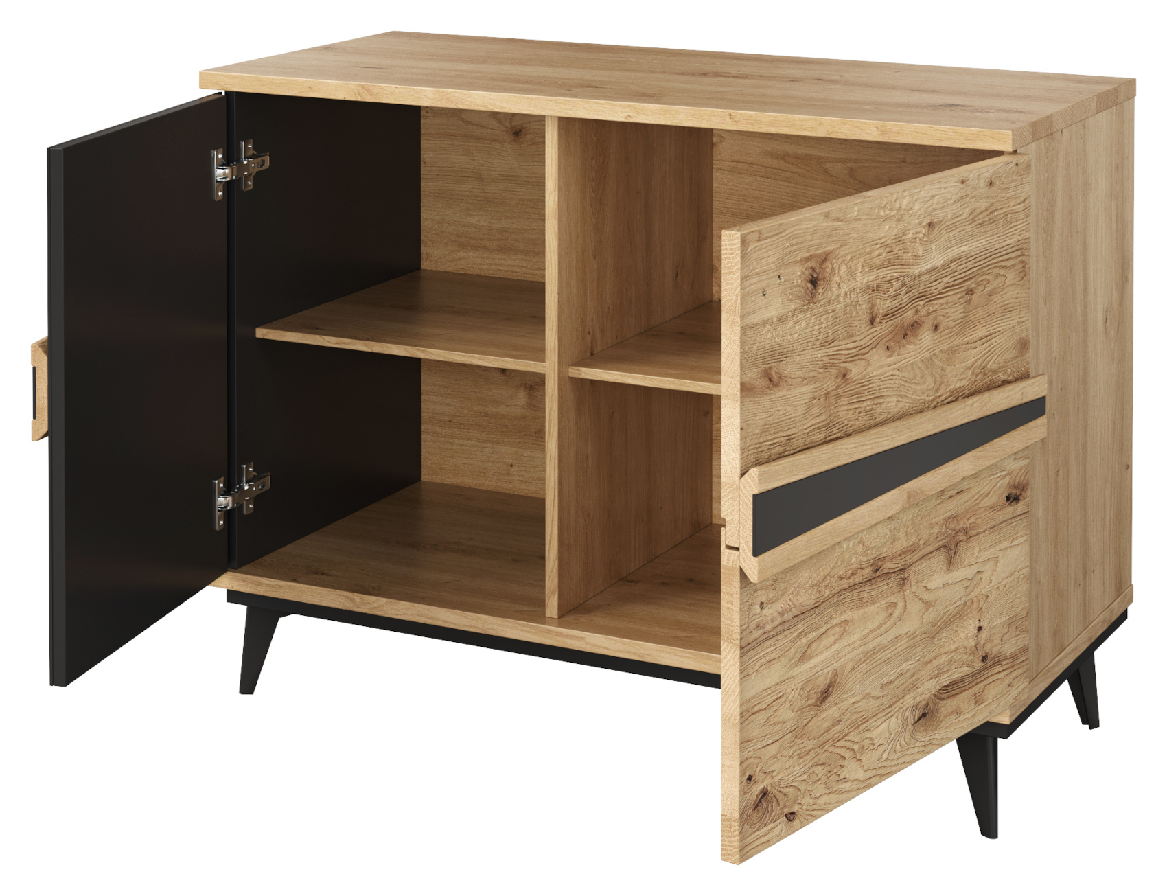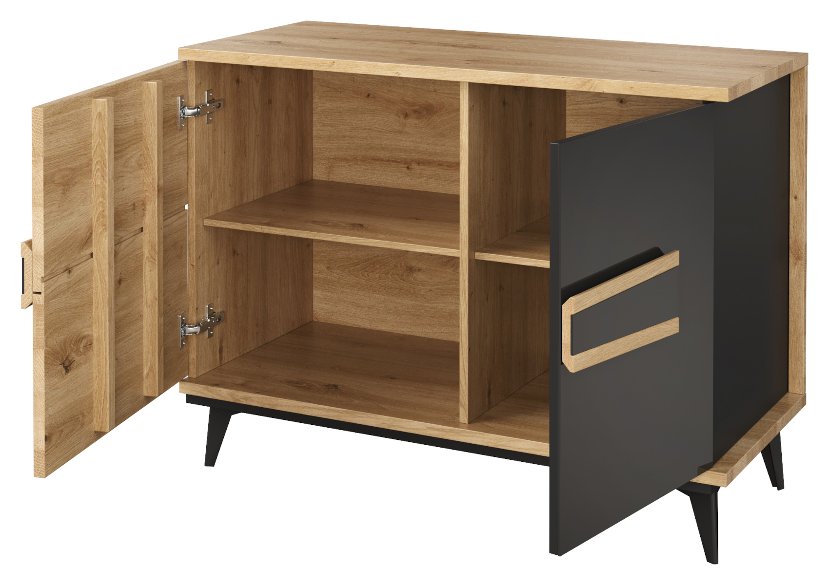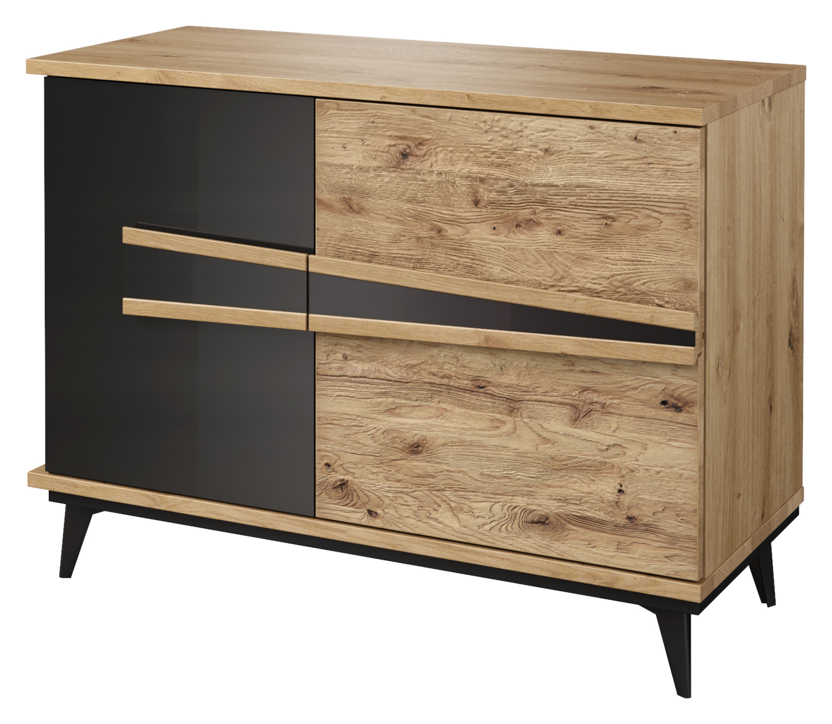 Moderní komoda Etna 2D vás zaujme svým industriálním designem. Jedinečným prvkem jsou zvláštní rukojeti na dvířkách, které dodají nábytku nádech elegance. Komoda je vyrobena z masivního dubového dřeva a přírodní dubové dýhy s černými skleněnými prvky a dvířky. Kvalitní technologie lakování a moření navodí přírodní vzhled dřeva a zvýrazní tak jeho léta. Nábytek stojí na černých kovových nožkách, které provzdušní váš celkový prostor. Dvířka i zásuvky v celém systému mají jednoduchý systém tichého dovírání.