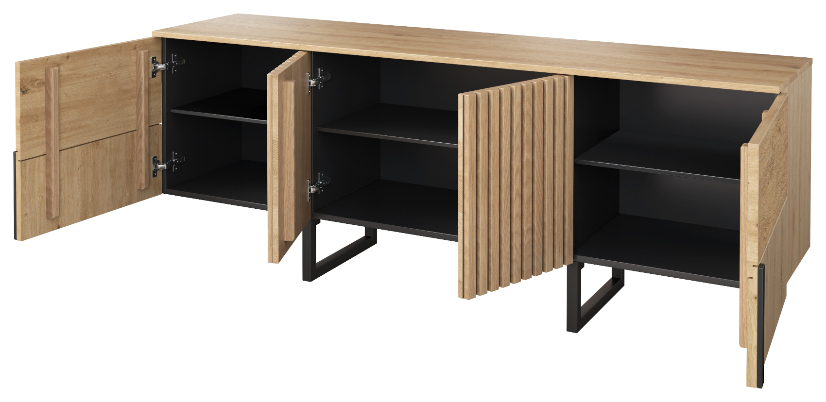 Komoda má 4 dvířka, za kterými jsou vloženy 3 lakované police.