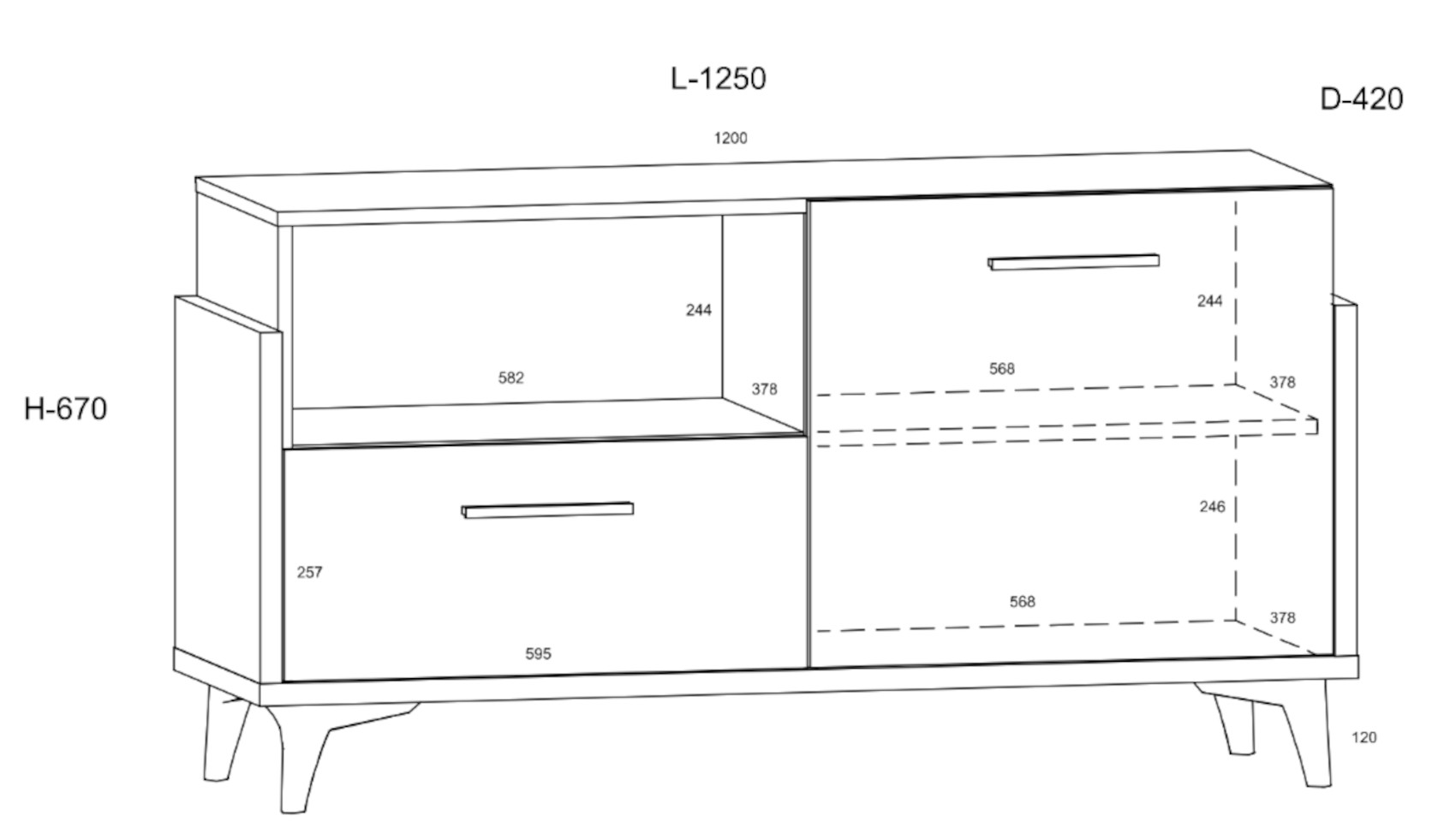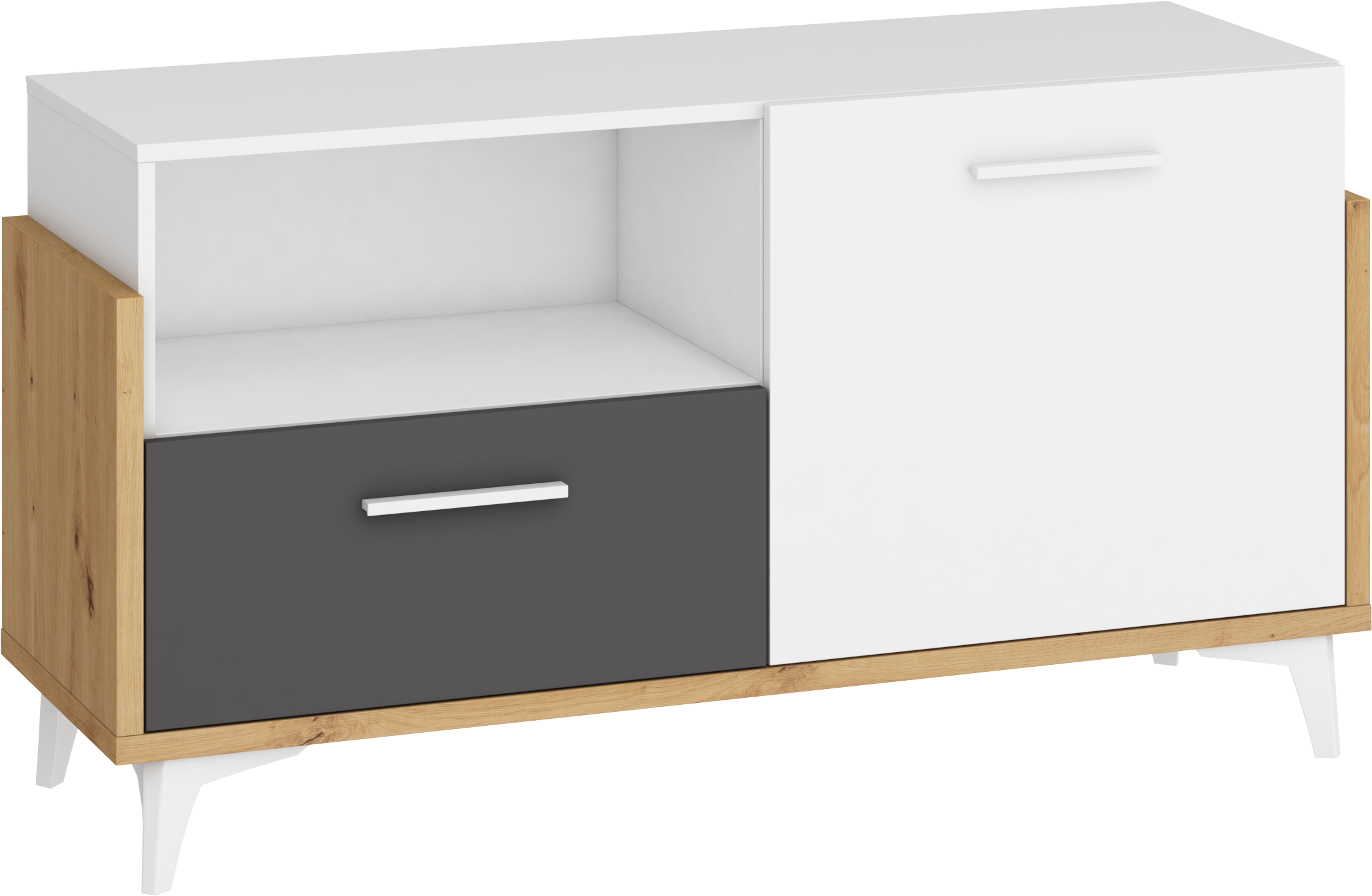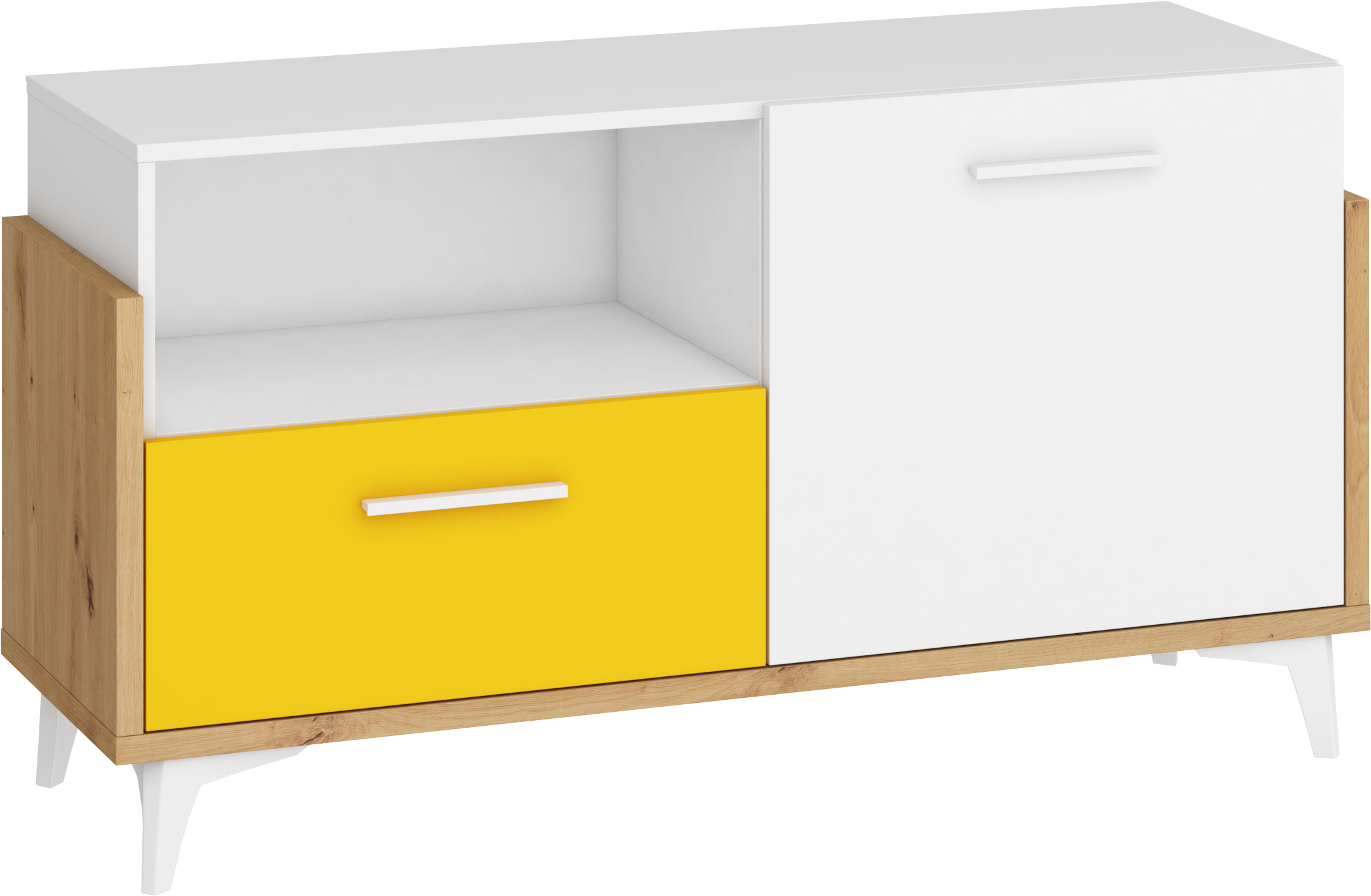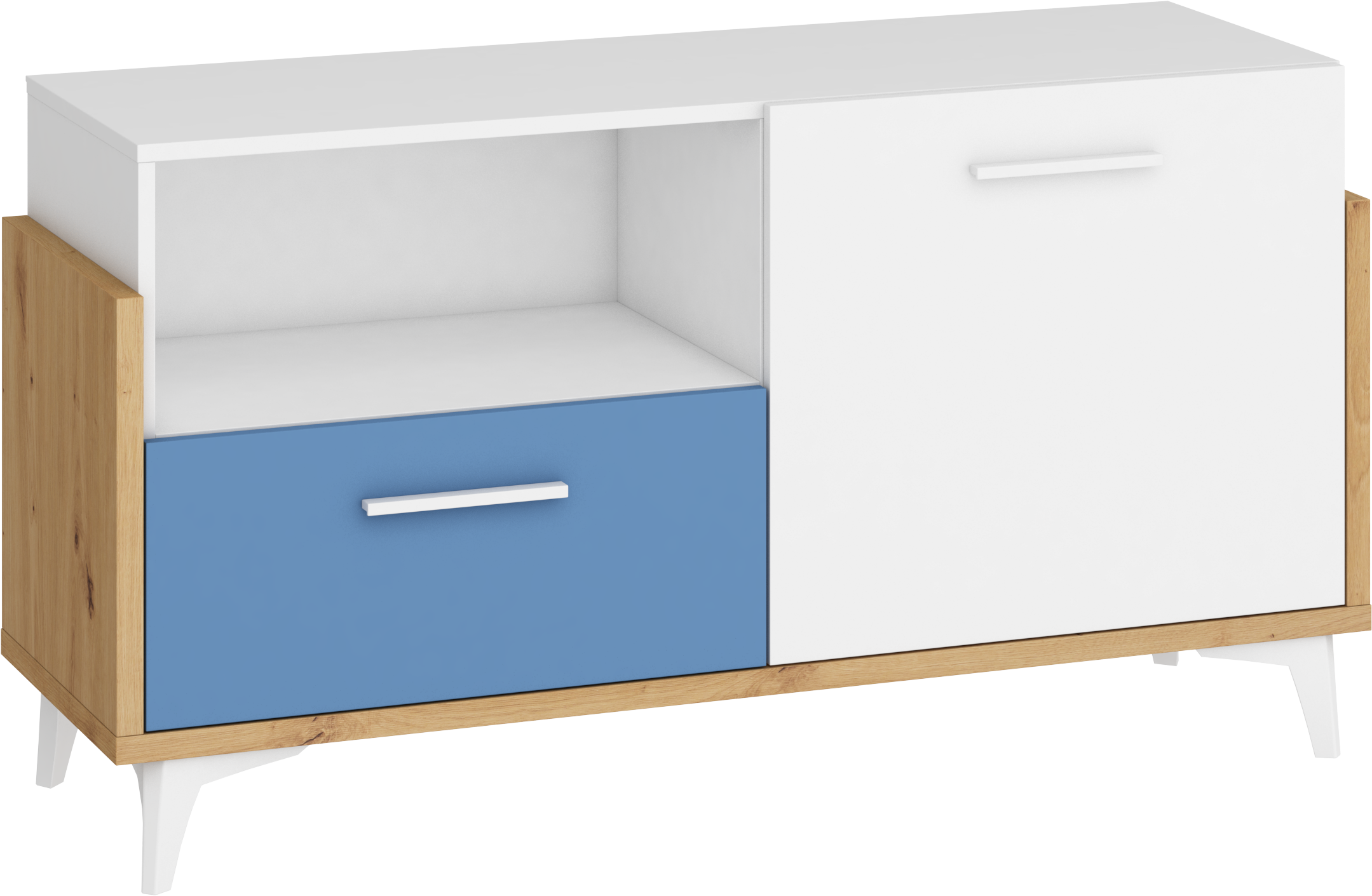 Součástí komody jsou 1 dvířka, za kterými je vložena 1 lakovaná polička. Ve spodní části je prostorná zásuvka na kovových pojezdech a nad ní otevřená nika.