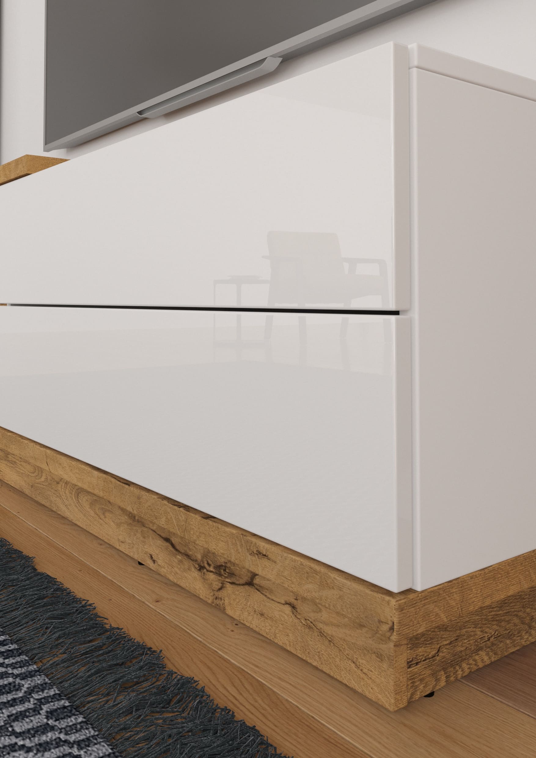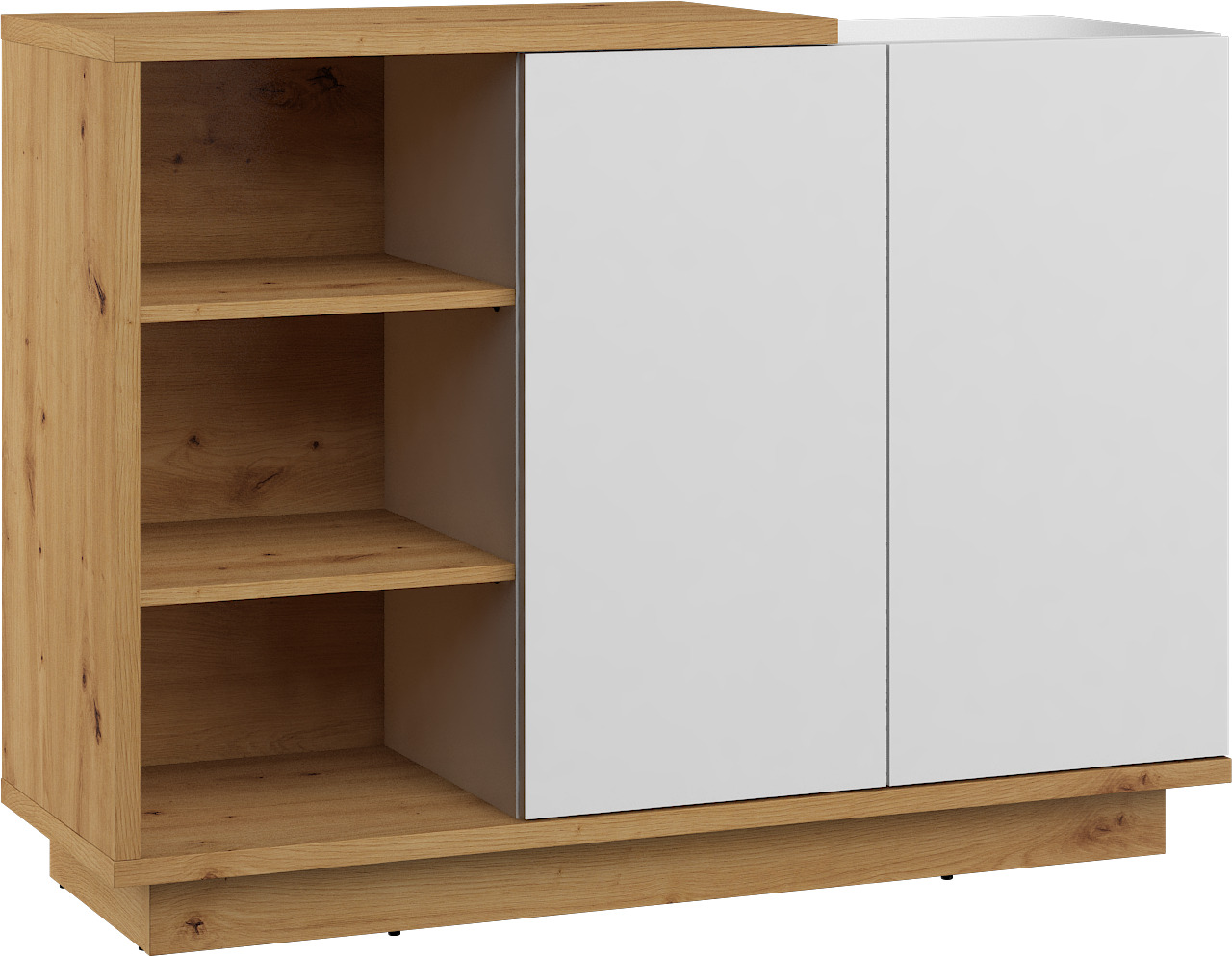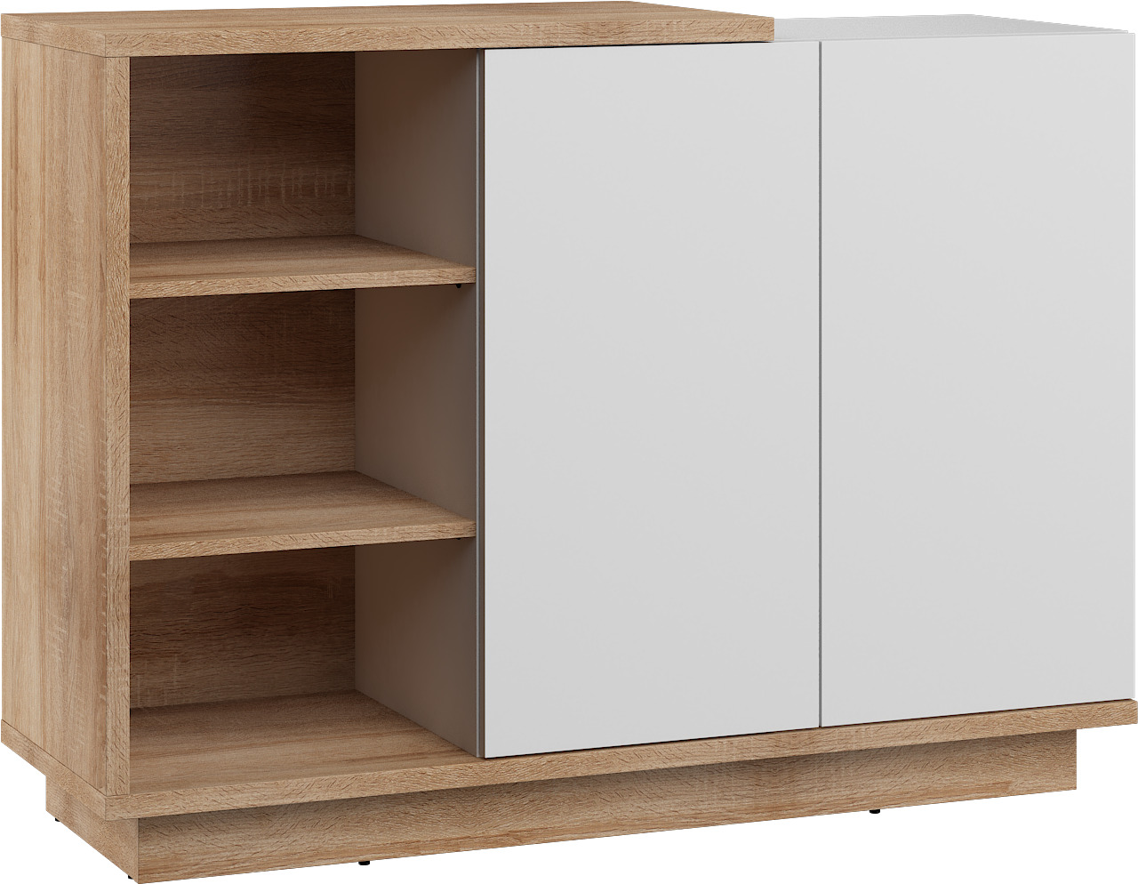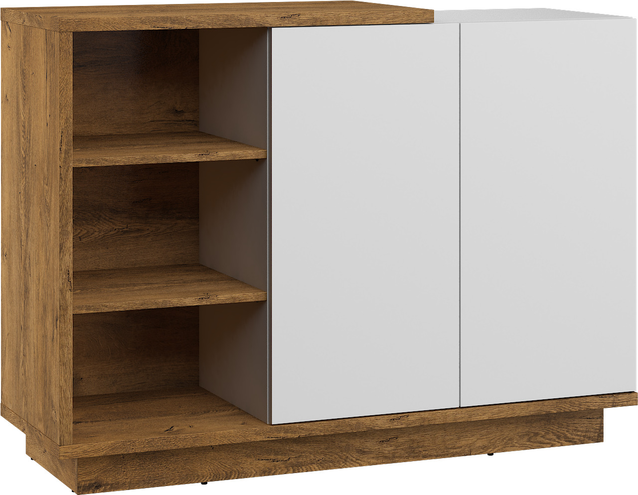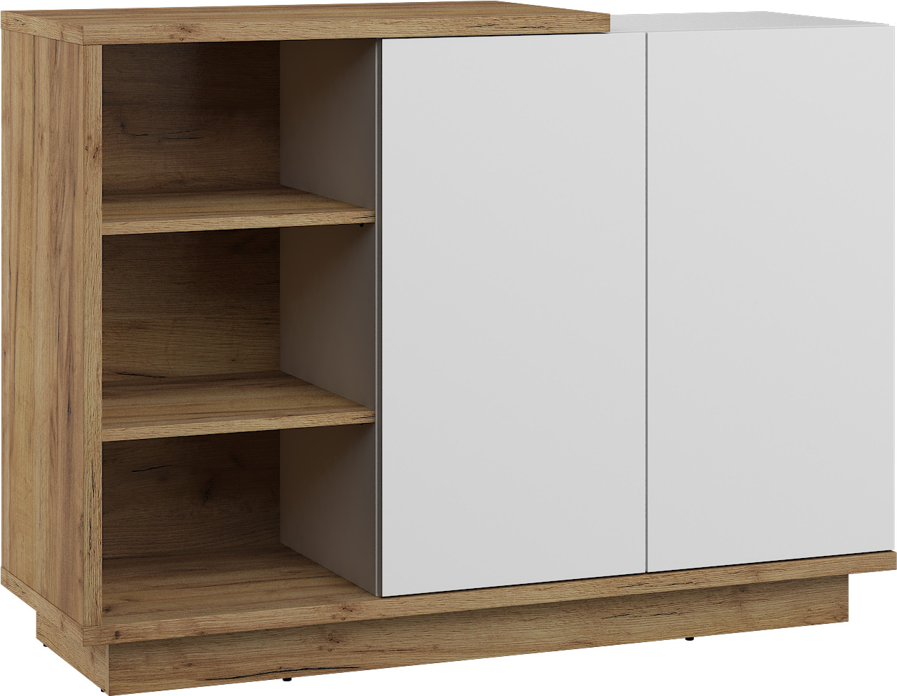 Komoda Hybrid 05 disponuje 3 otevřenými policemi a skříňkou s poličkou uvnitř. Dodáváme v demontu.