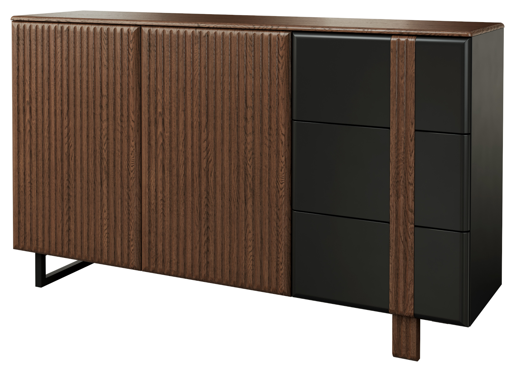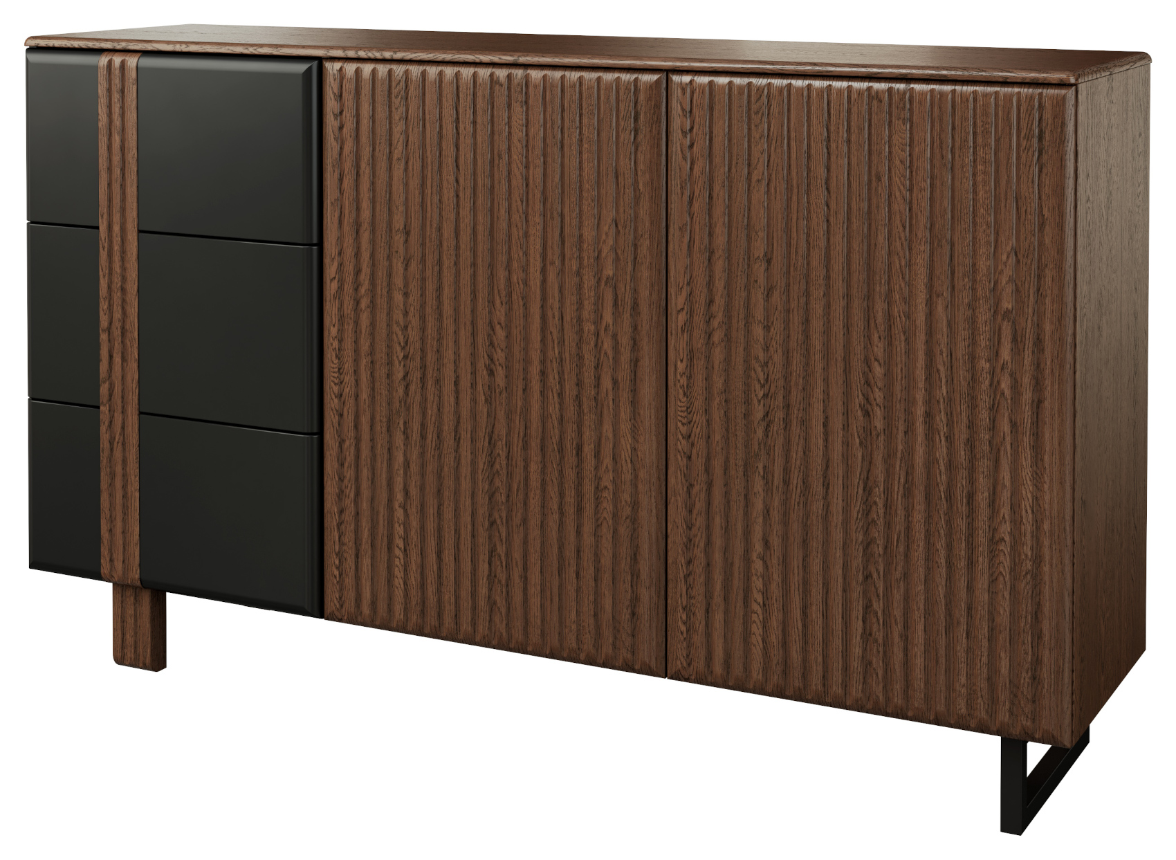 Moderní vysoká komoda Isla 3D vás zaujme svým jedinečným a elegantním designem. Komoda je vyrobena z masivního dubového dřeva a přírodní dubové dýhy s černými detaily. Kvalitní technologie lakování a moření navodí přírodní vzhled dřeva a zvýrazní tak jeho léta. Nábytek stojí na hnedých nožkách, které provzdušní váš celkový prostor. Dvířka i zásuvky v celém systému mají jednoduchý systém otevírání - Push to open. Máte možnost si vybrat ze 2 barevných variant - rustikální/notte nebo rustikální/bílá.