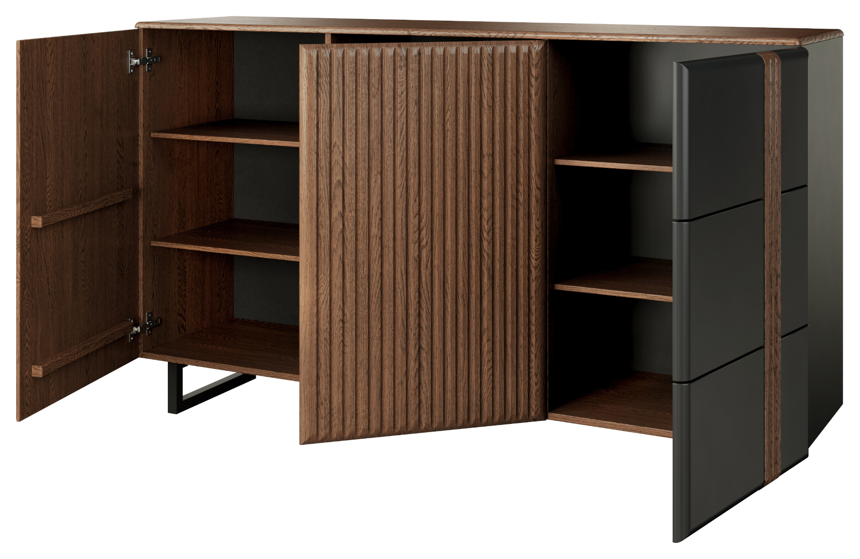 Komoda má 3 plná dvířka, za kterými je vloženo 6 lakovaných polic.