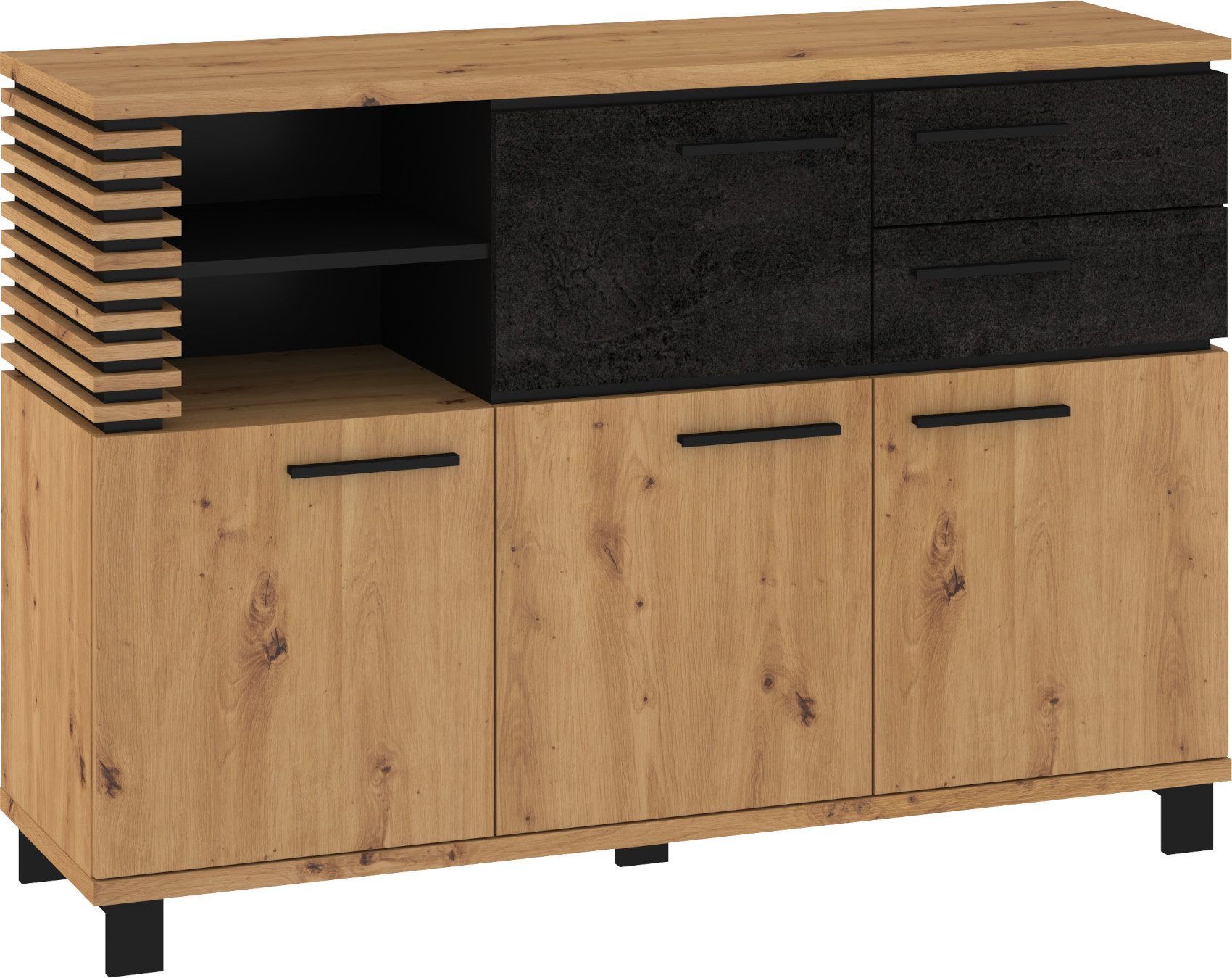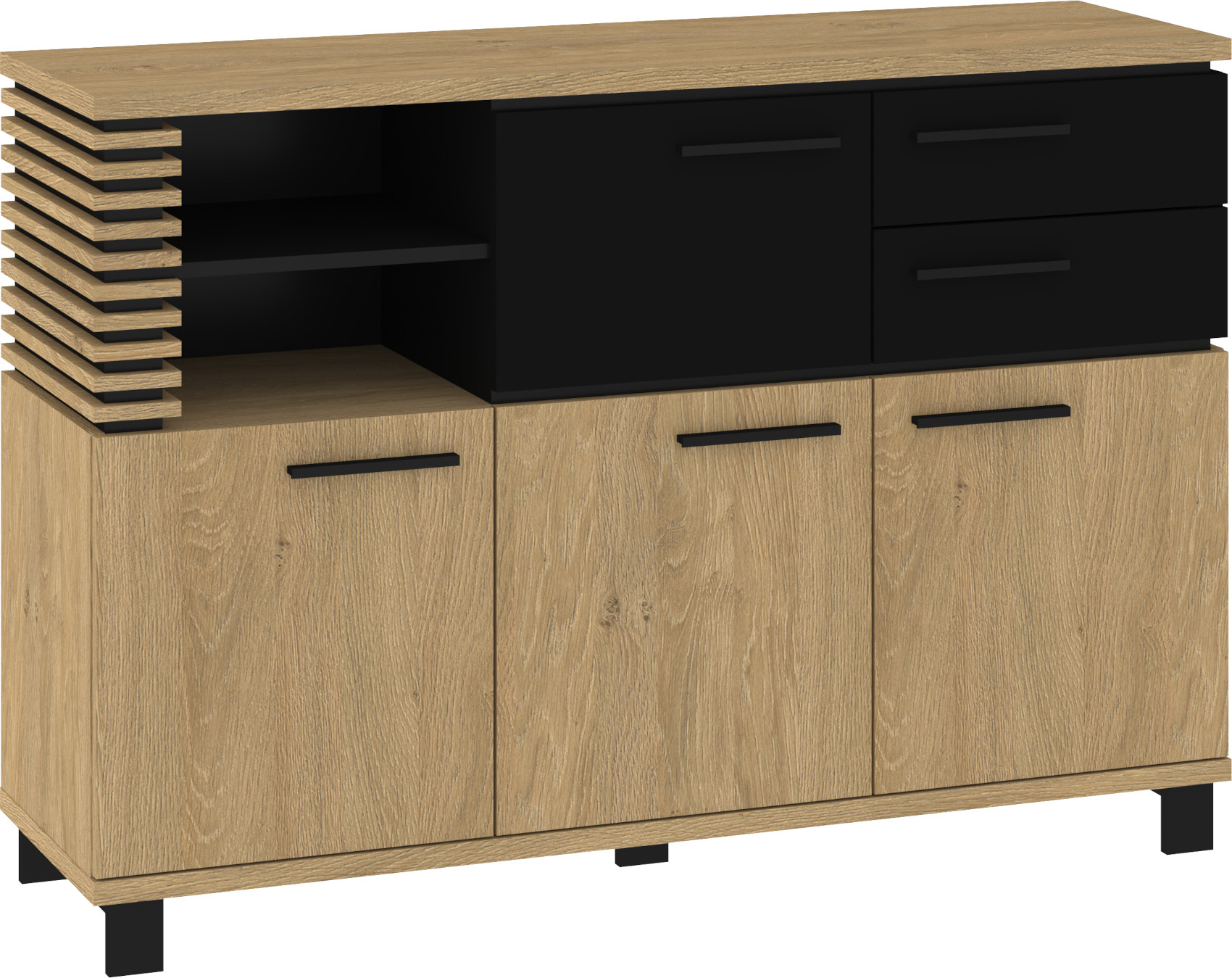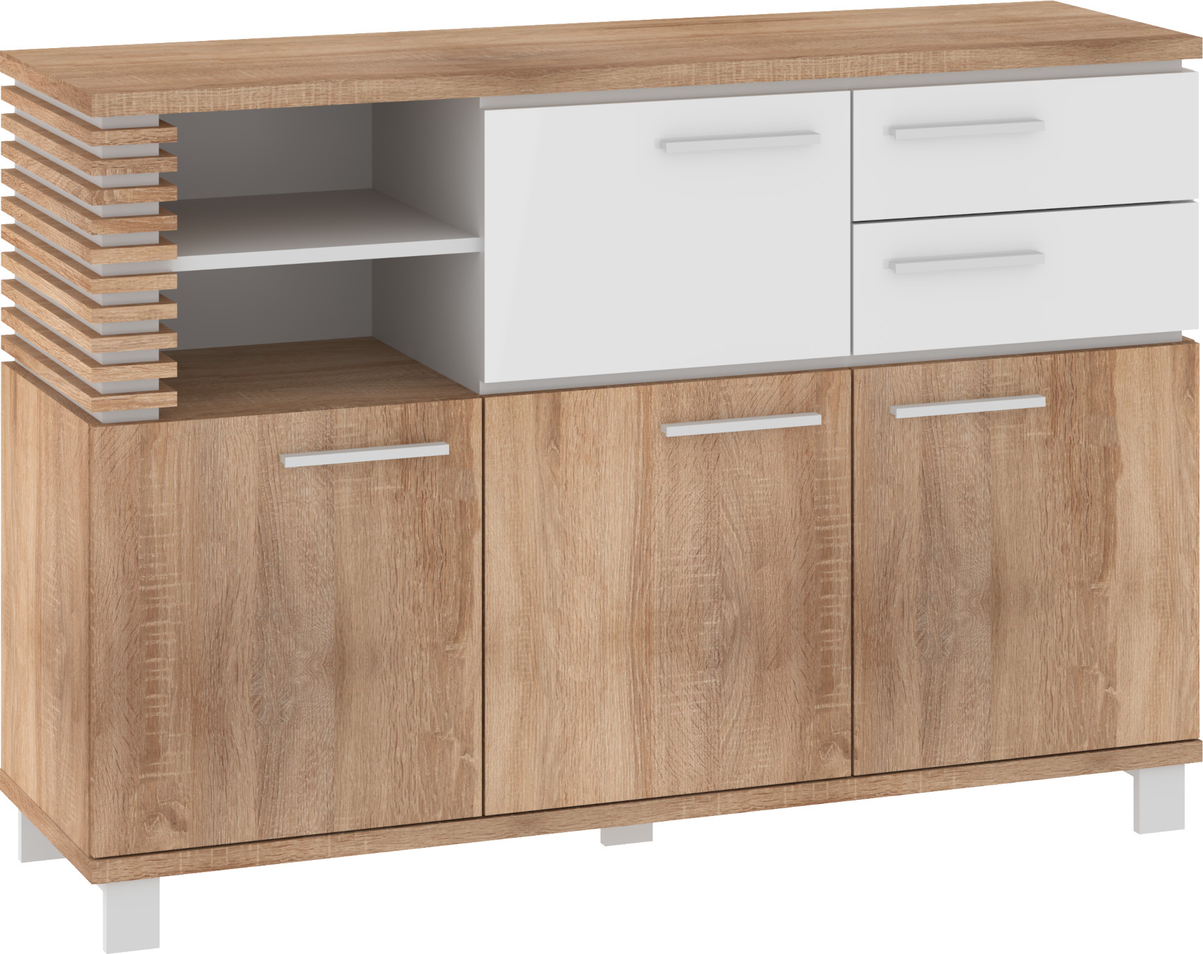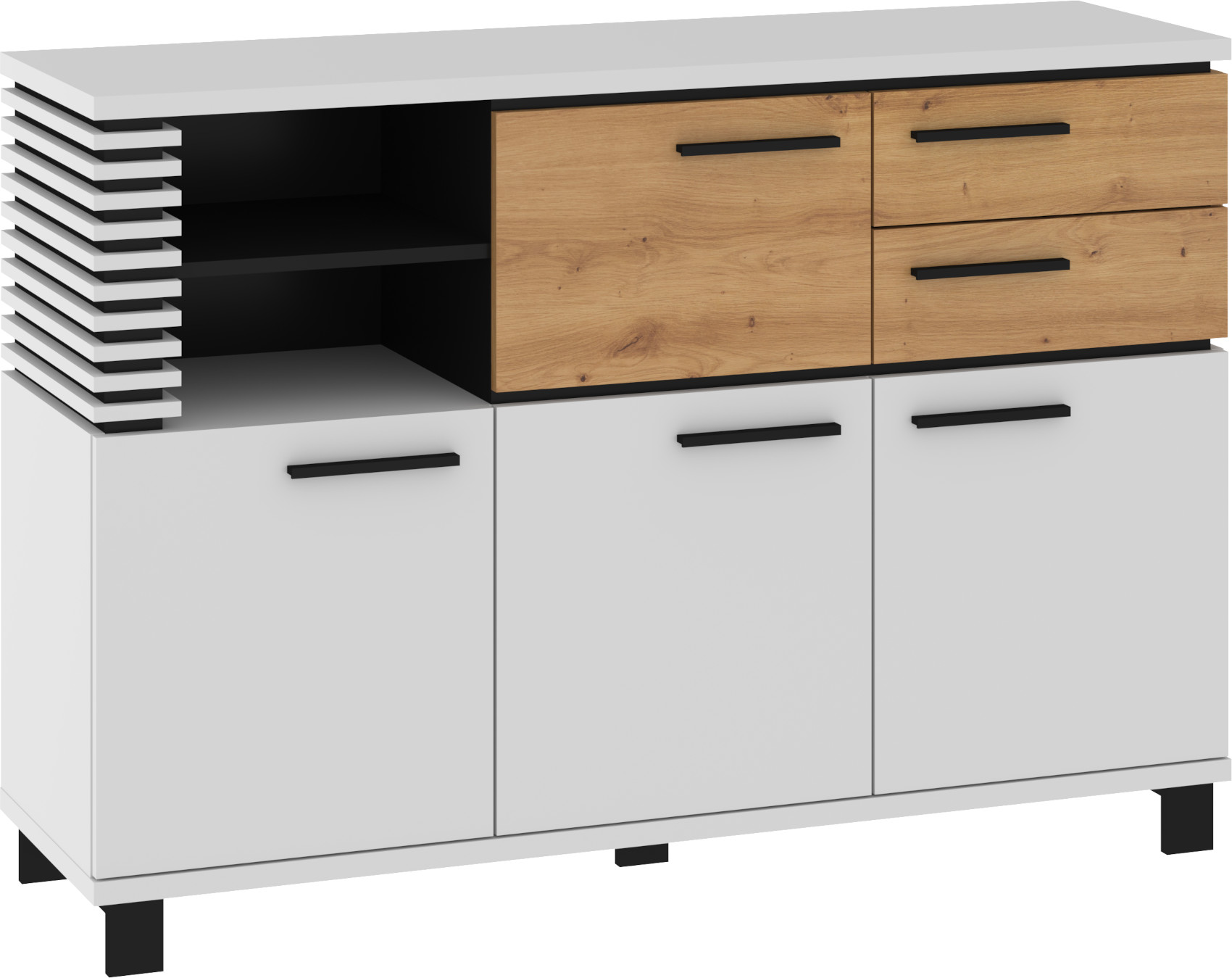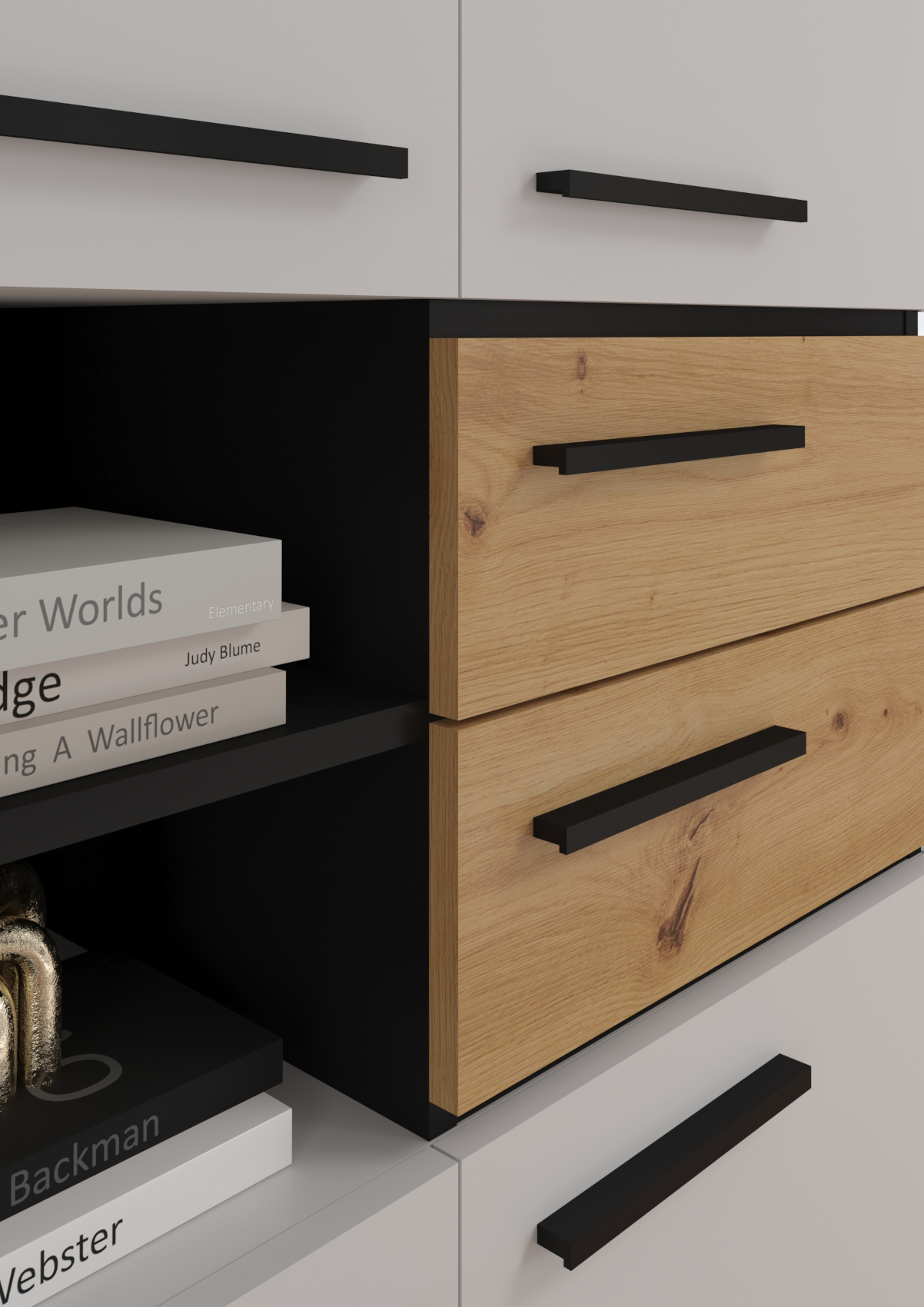 Součástí komody jsou 4 dvířka s 3 lakovanými policemi a 2 zásuvky na kovových pojezdech. Nad levými dvířky je police k vystavení vašich oblíbených dekorací nebo knih.