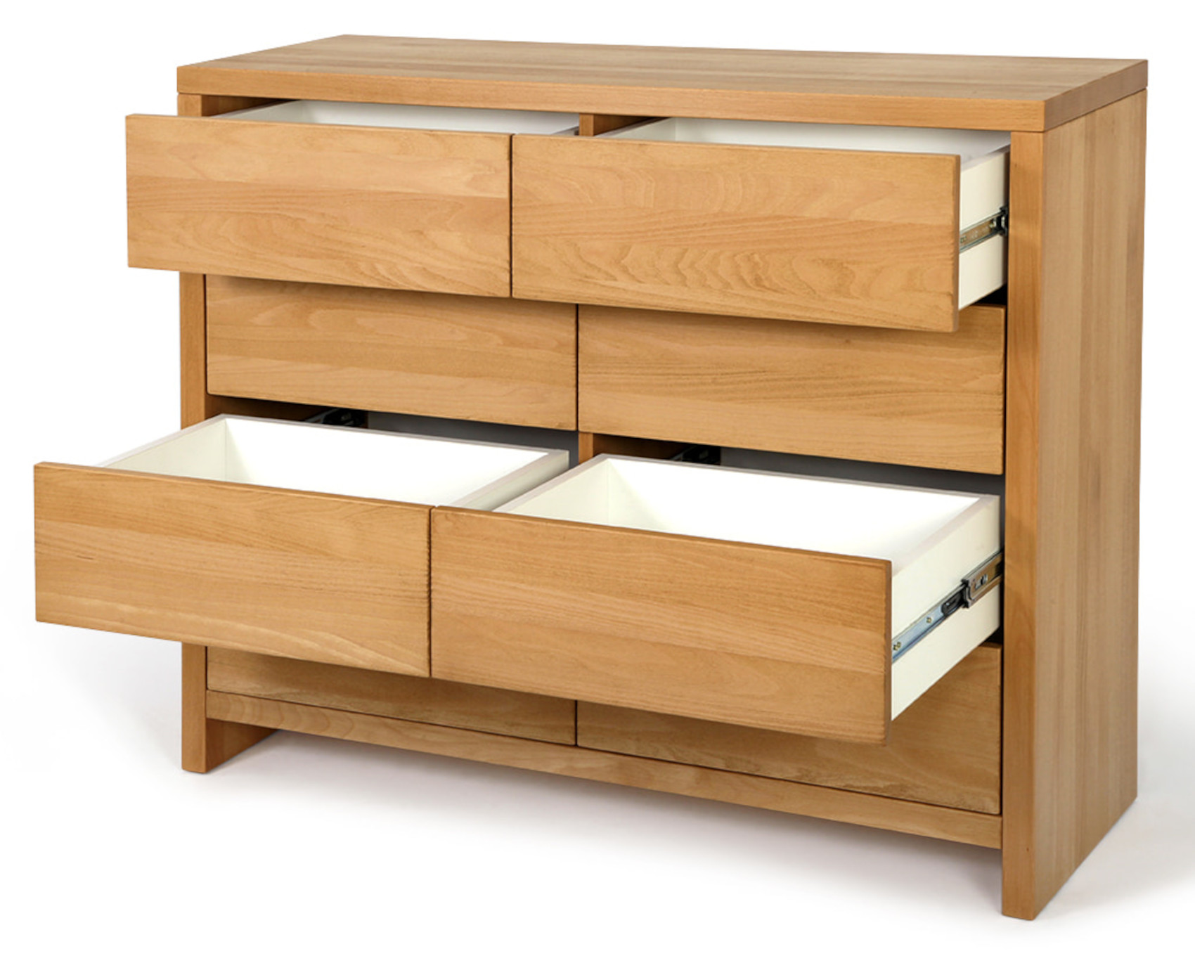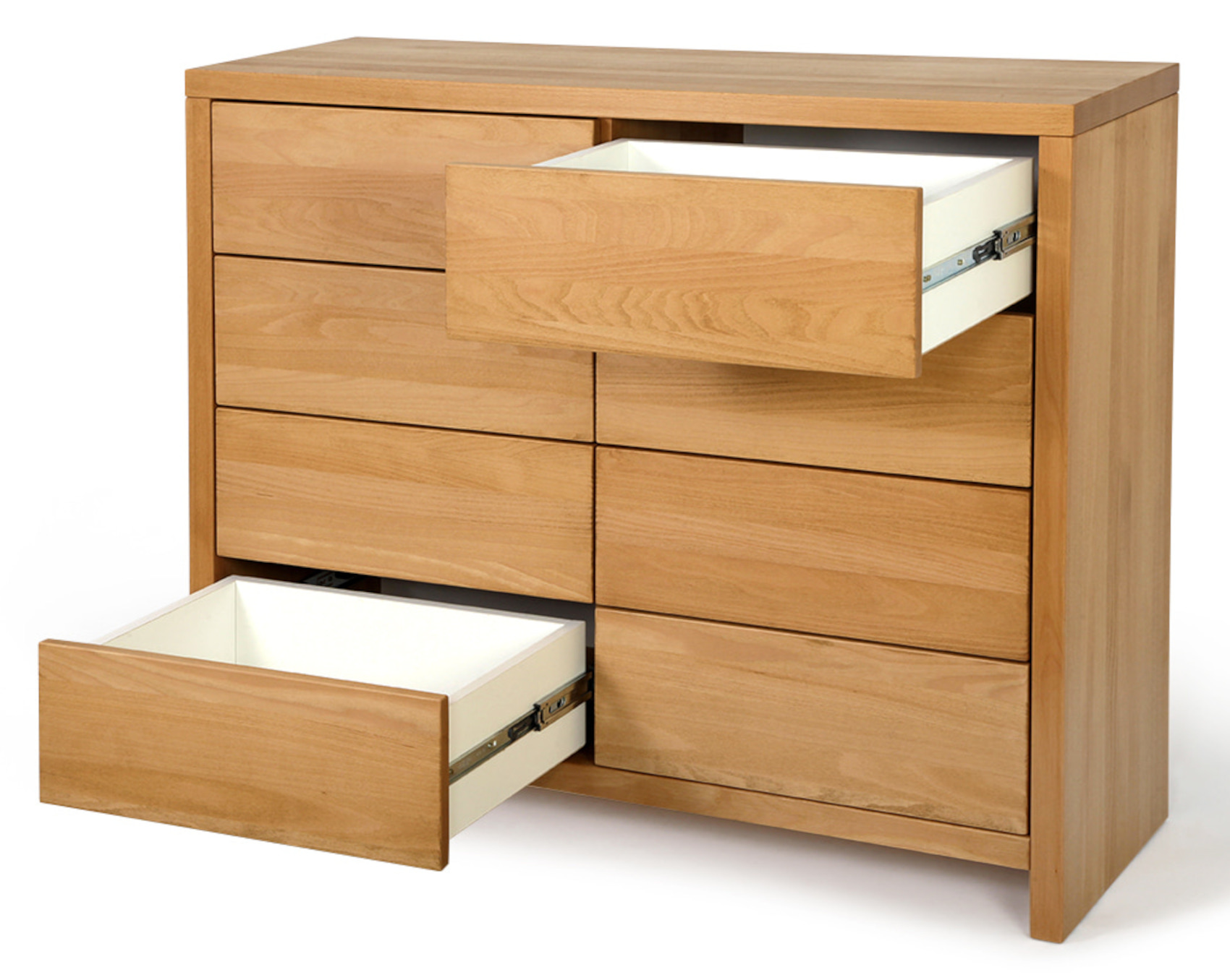 Moderní komoda LEVITTA vás zaujme svým jednoduchým a elegantním designem. Je vyrobena z masivního bukového dřeva o síle 4 cm, které vám zaručí kvalitu, odolnost a stabilitu. Součástí komody jsou 4 prostorné zásuvky na kovových pojezdech (široká varianta komody má 8 zásuvek). Zásuvky mají zabudovaný jednoduchý dotykový systém otevírání Push to open.