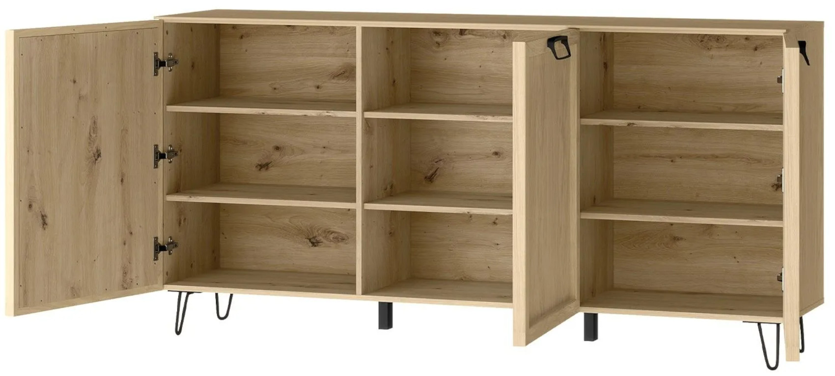 Komoda má 3 dvířka, za kterými jsou vloženy vždy 2 lakované police.