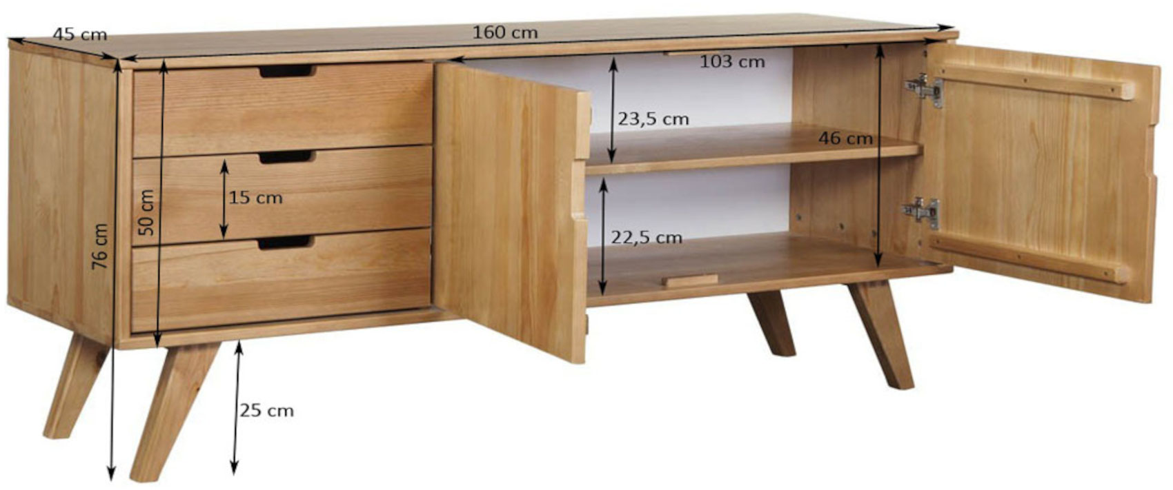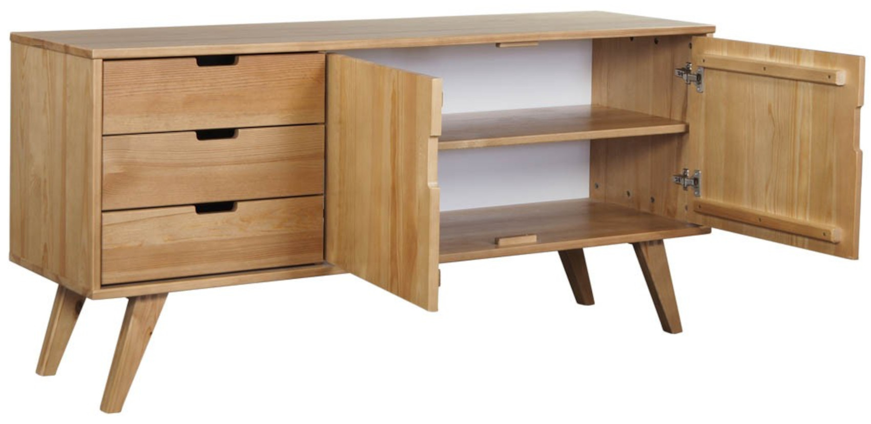 Komoda má 3 prostorné zásuvky na kovových pojezdech se zabudovaným systémem tichého dovírání. Na pravé straně jsou 2 dvířka, za kterými je vložena 1 police.