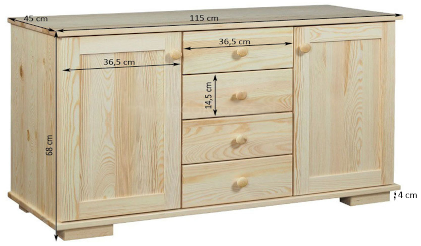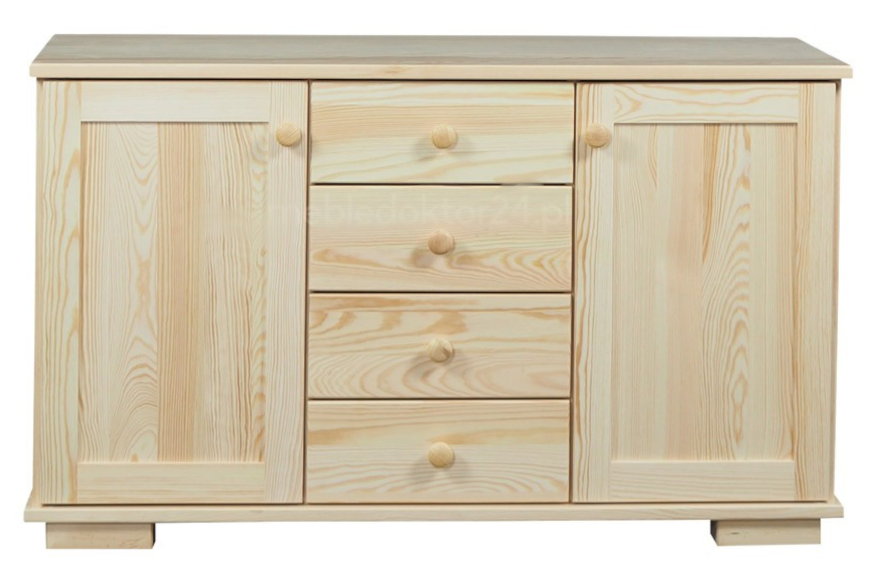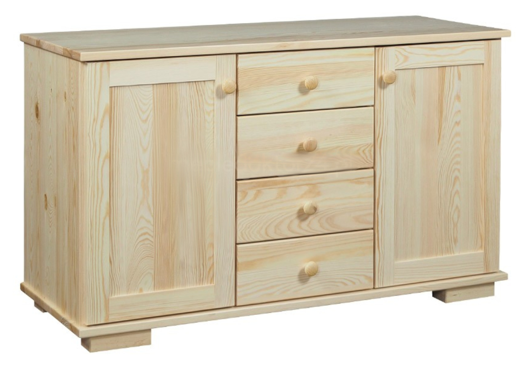 Komoda má 2 krajní dvířka a mezi nimi 4 zásuvky na kovových pojezdech.