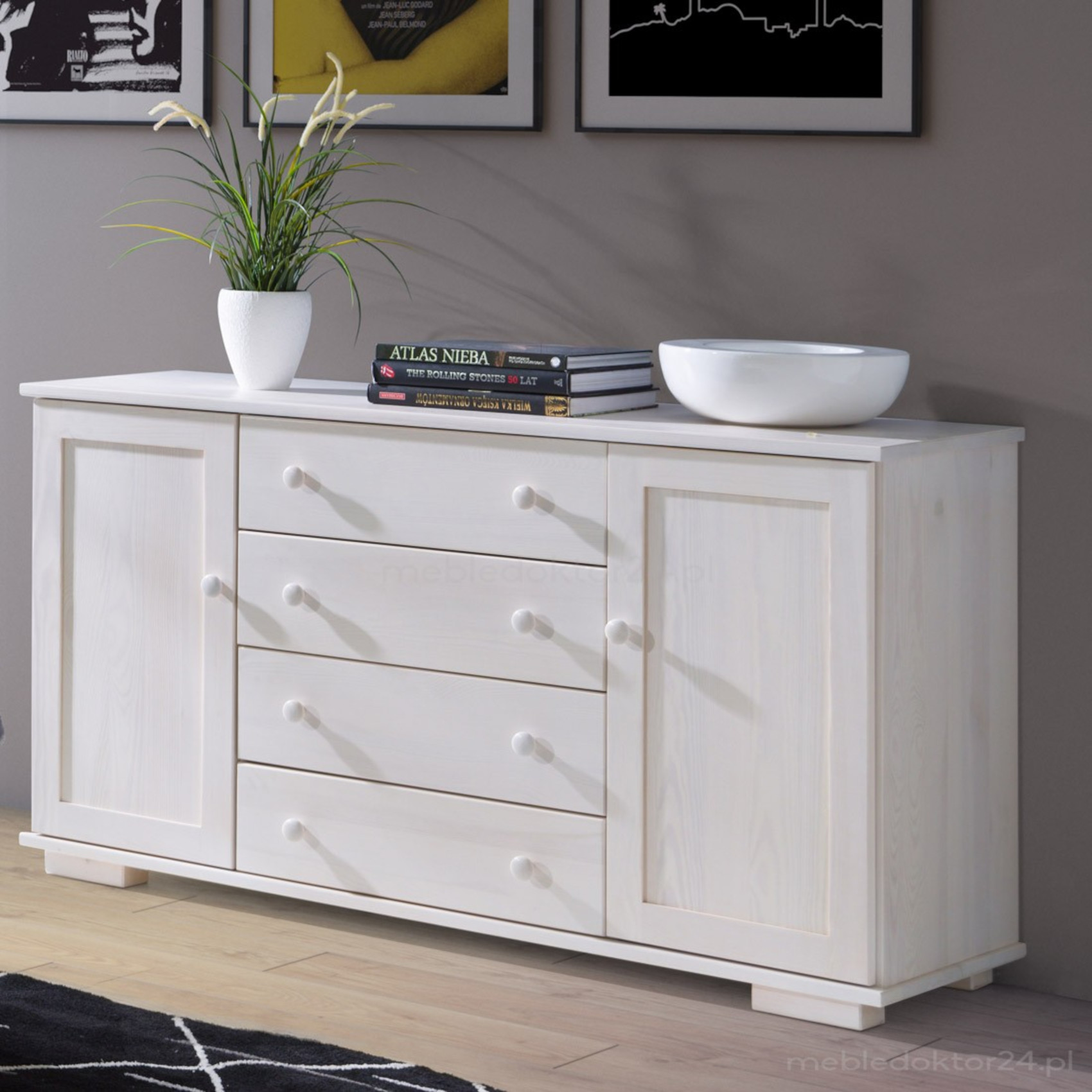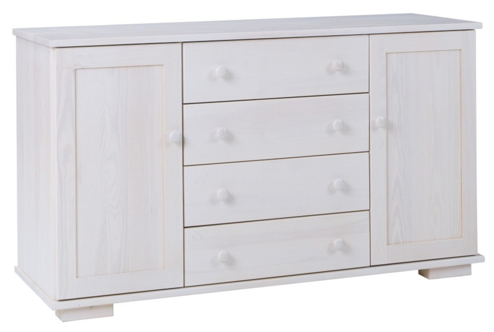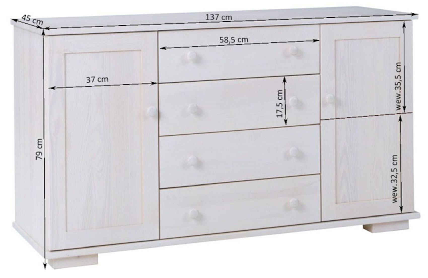 Komoda má 2 krajní dvířka a mezi nimi 4 zásuvky na kovových pojezdech.