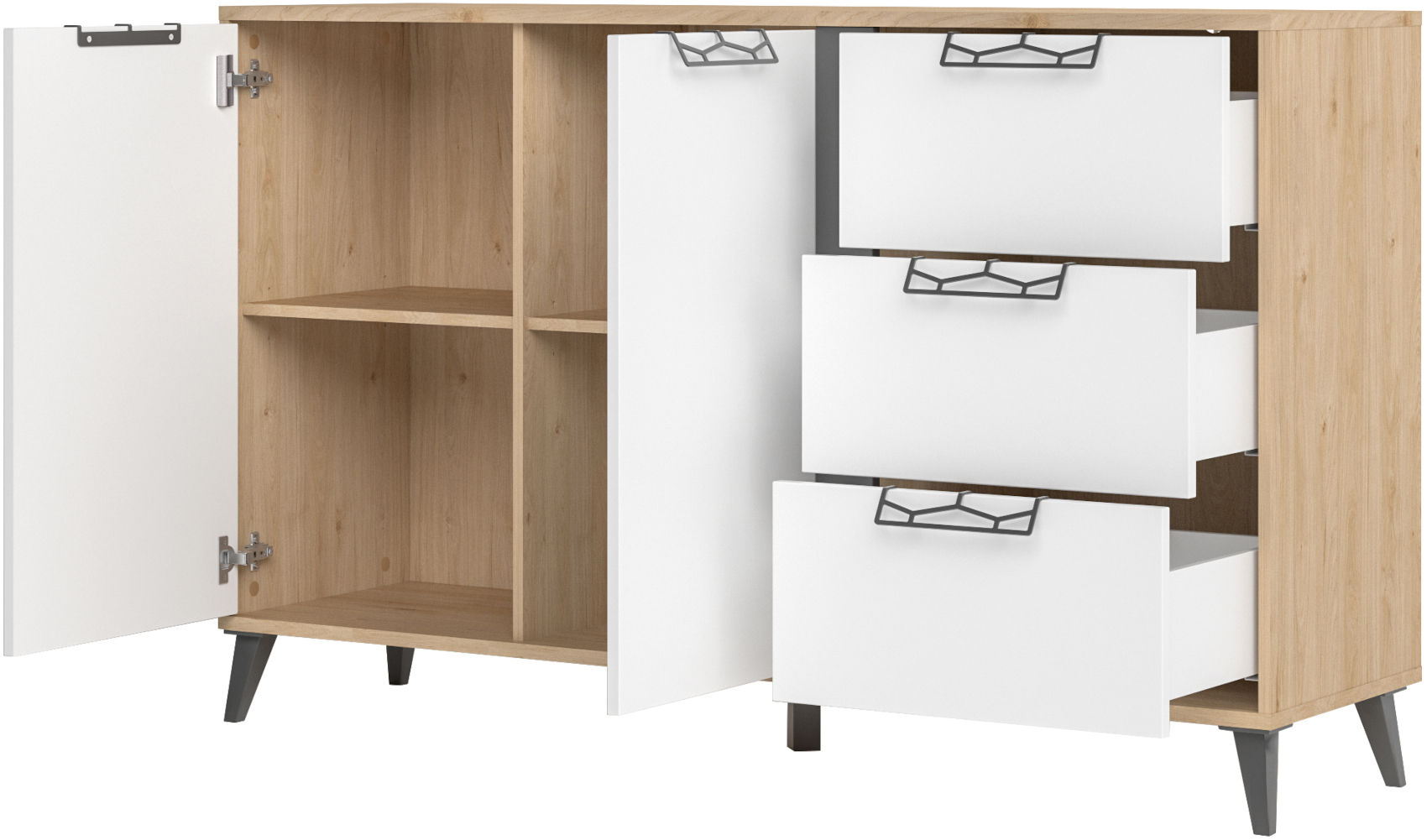 Součástí komody jsou 2 dvířka, za kterými jsou vloženy 2 police. Na pravé straně jsou 3 zásuvky na kovových pojezdech.