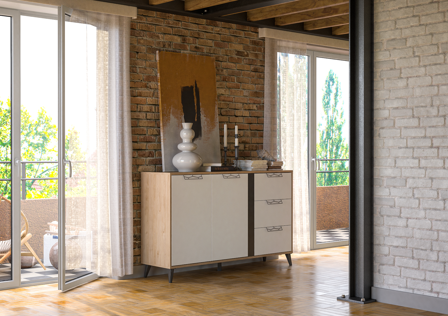 Moderní komoda Moet 45 vás zaujme svým prostým, ale zároveň luxusním designem. Je vyrobena z kvalitního odolného lamina potaženého speciální fólií, která vám navodí dojem přírodního masivního dřeva. Úzké nožky dodají nábytku nádech retro stylu a provzdušní váš celkový prostor. Jedinečným prvkem jsou speciálně tvarované úchyty vyrobené z oceli v šedém odstínu. Dvířka mají zabudovaný systém tichého dovírání.
