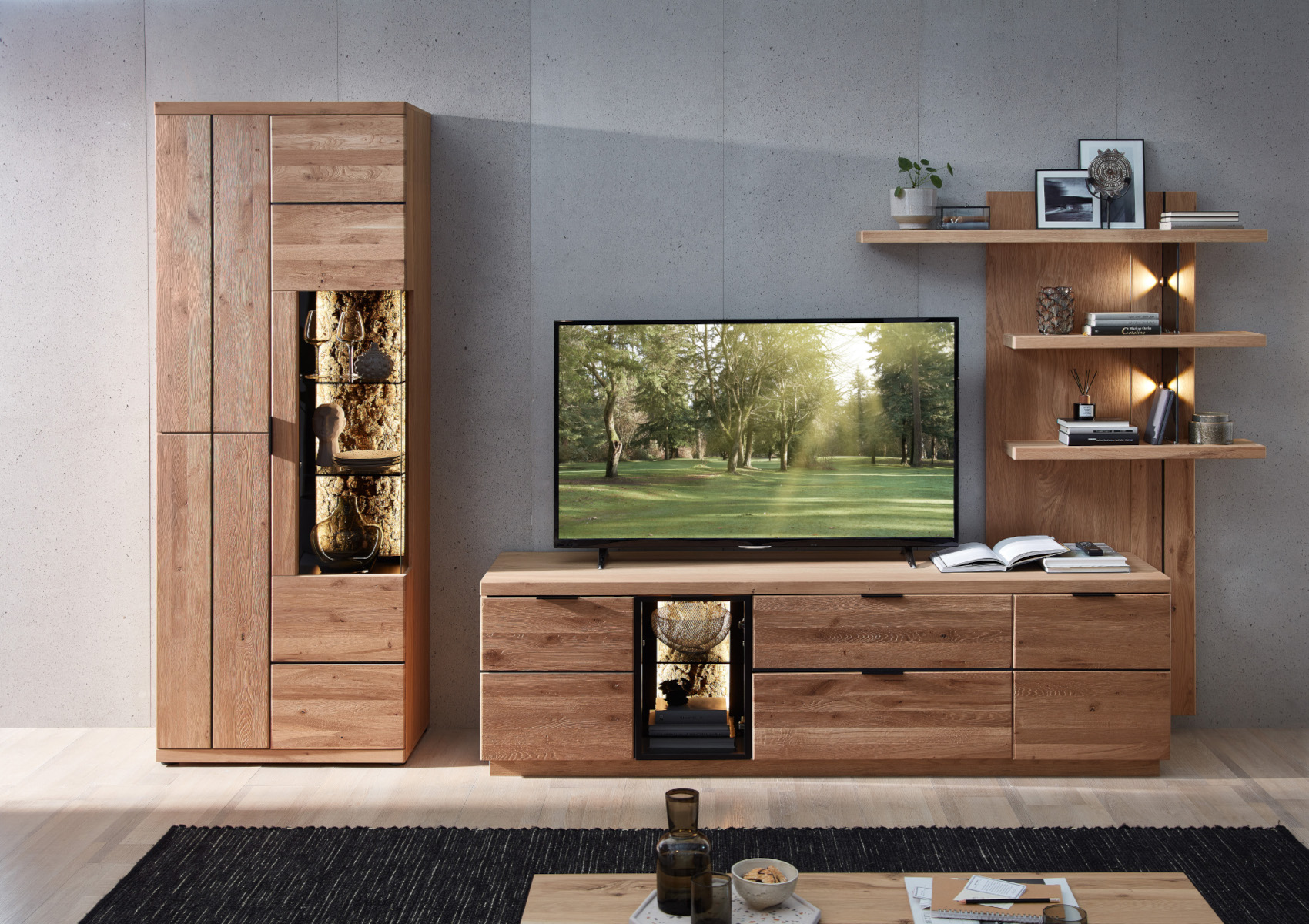 Třídveřová moderní komoda Napoli 20 vás zaujme svým přírodním designem s viditelnou strukturou dřevěných lét. Přední dvířka a zásuvky, se systémem tichého dovírání, jsou vyrobeny z masivního dubového dřeva a korpus z přírodní dubové dýhy, která je potažena fólií. Součástí komody jsou kovové černě lakované úchyty, které dodají nábytku nádech elegance. Nábytek stojí na velmi nízkých černých plastových nožkách.