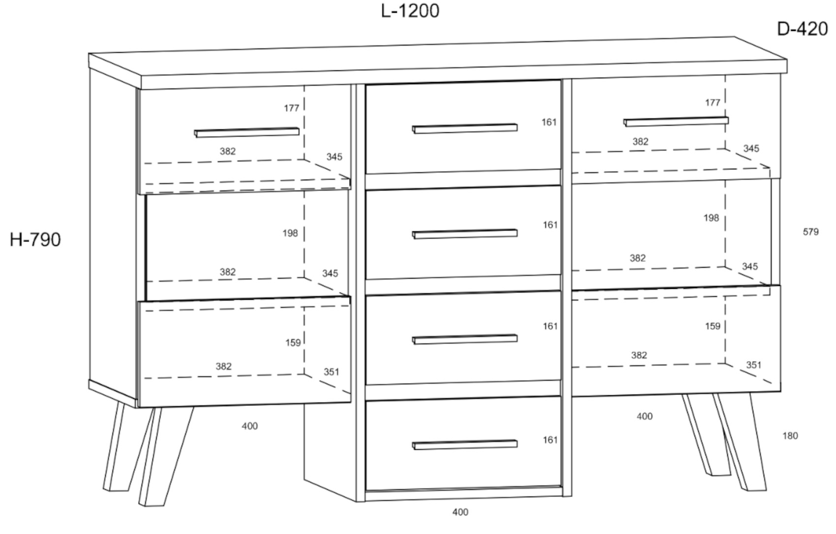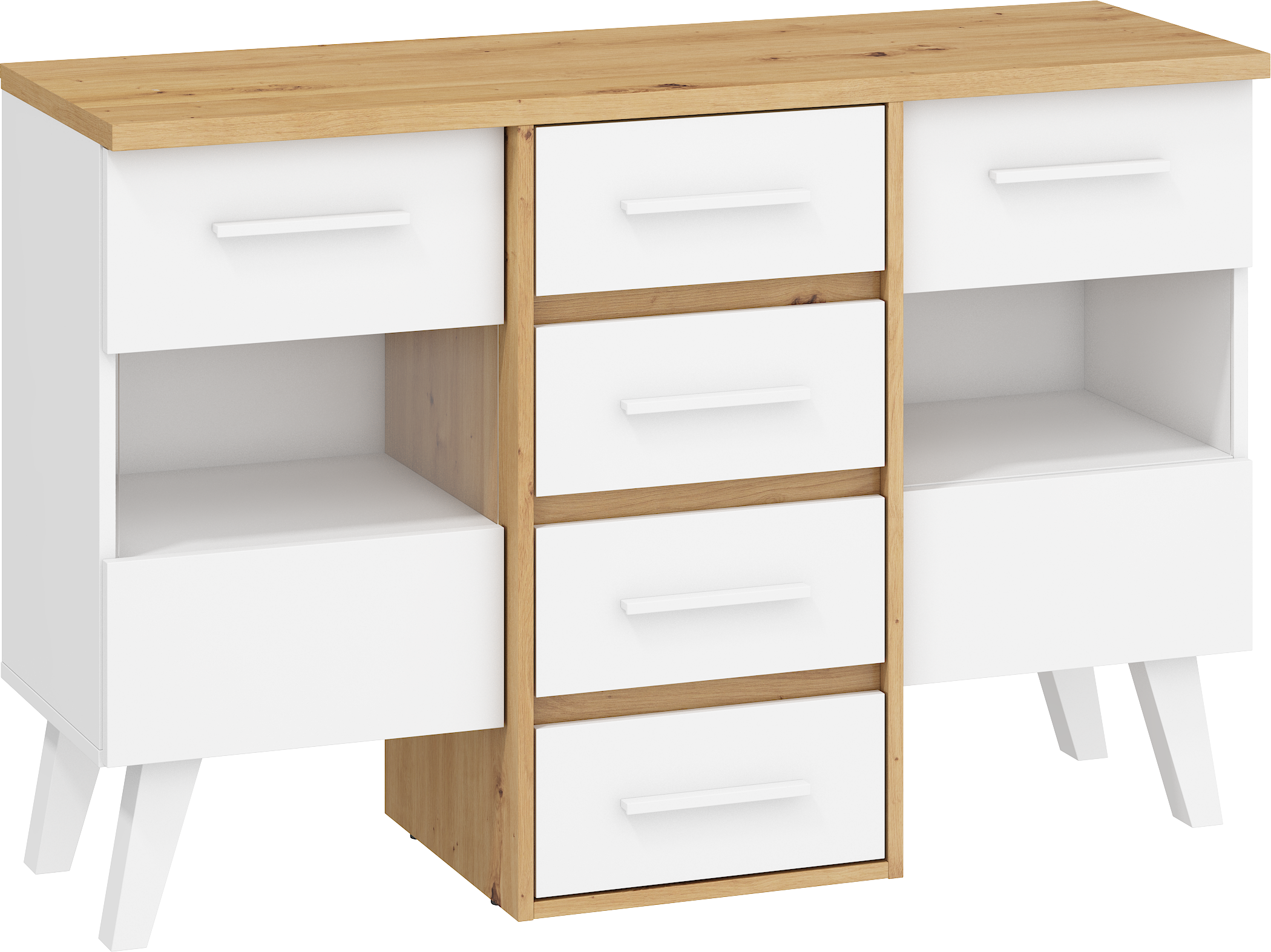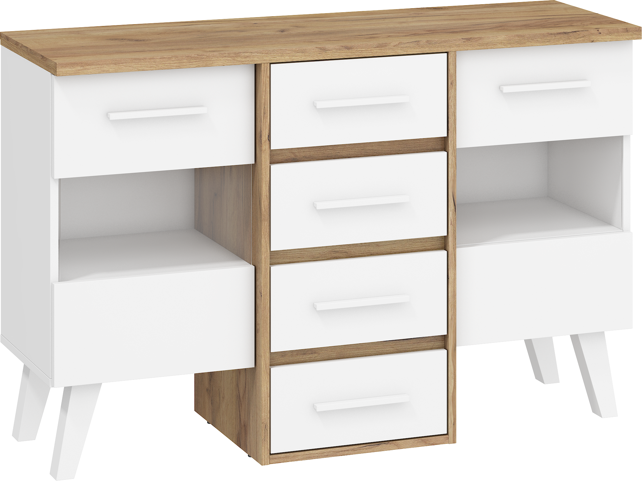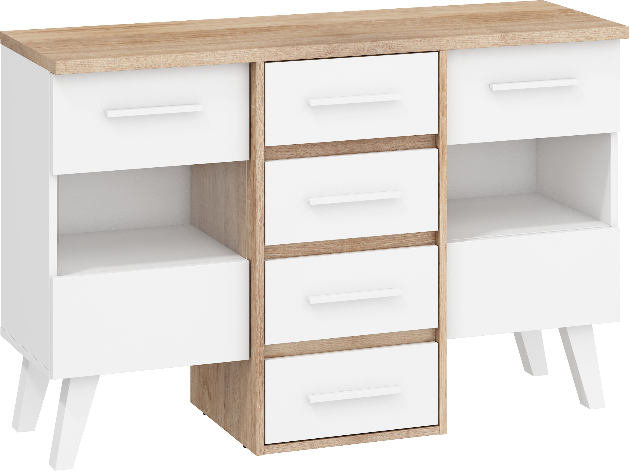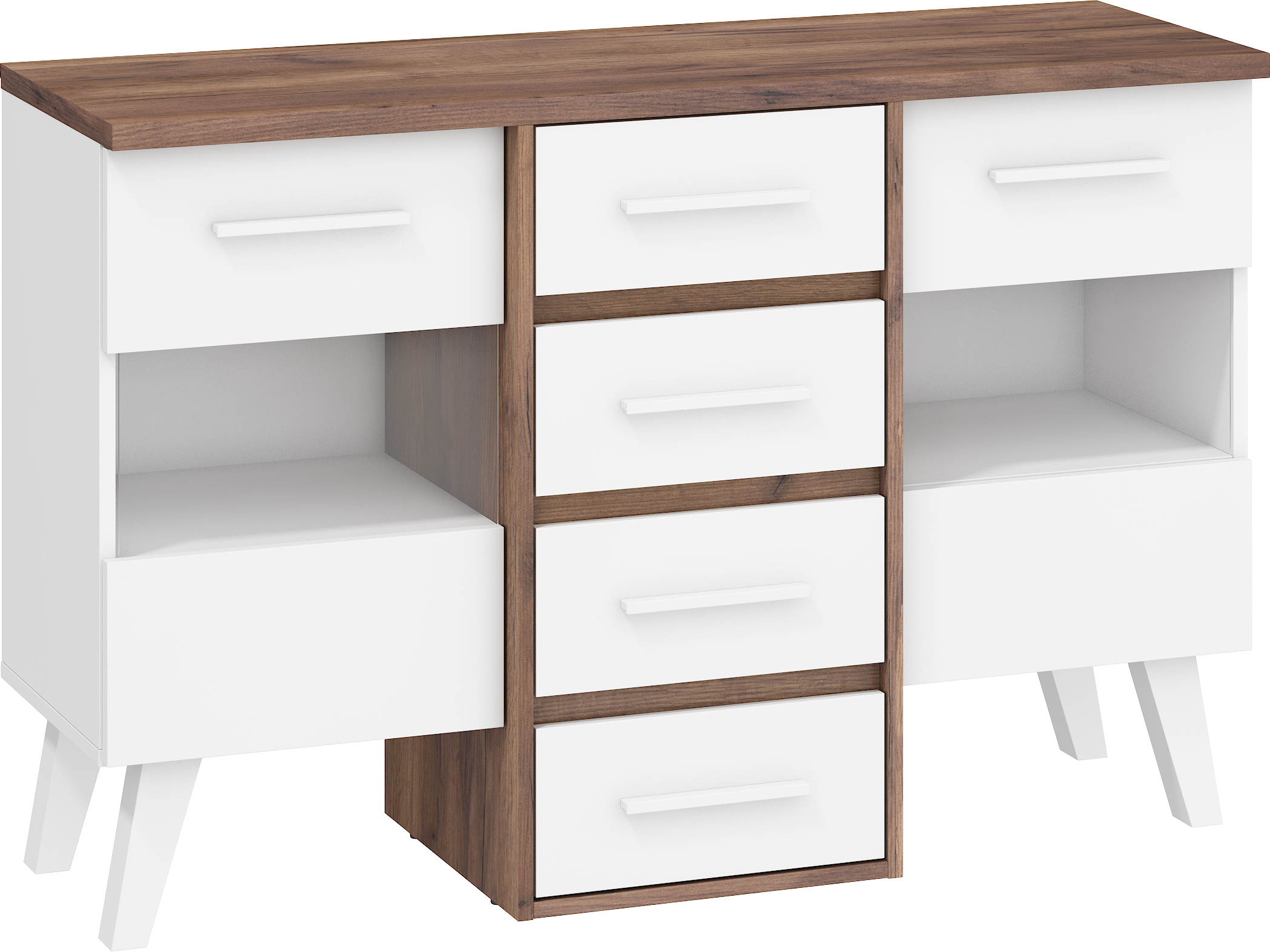 Komoda Nordis 05 stylově doplní vaši domácnost. 4 praktické zásuvky a 2 částečně prosklené skříňky se 2 poličkami vám poskytnou dostatek úložného prostoru.