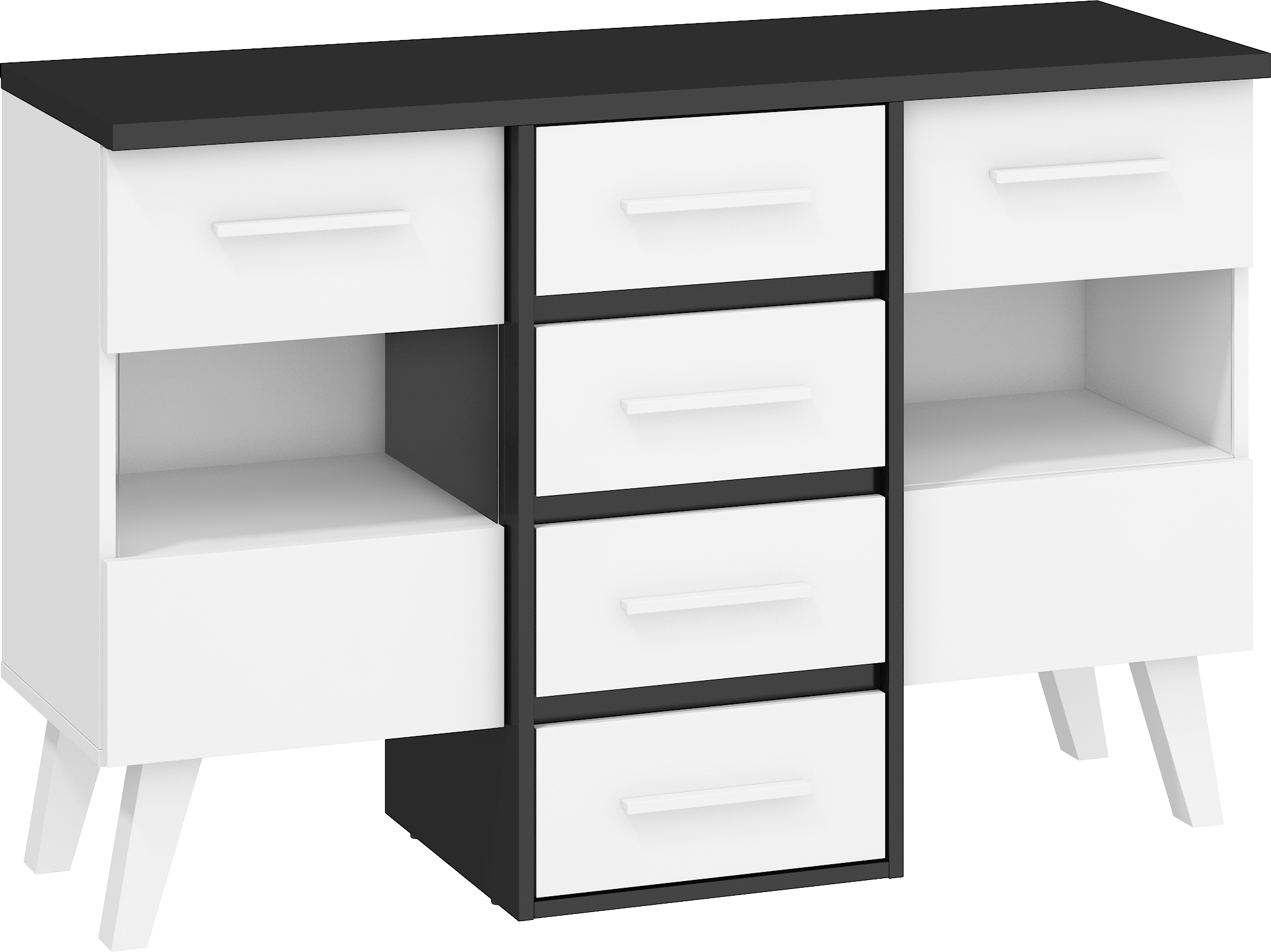 Komoda patří ke kolekci systémového nábytku Nordis, kterou si můžete vybavit nejen pracovnu, ale i obývací pokoj nebo předsíň. Nordis má nadčasový design, který sází na čistou bílou barvu, jíž vkusně doplňují dřevodekory v přírodním odstínu. Nebo si můžete systém vybrat v nestárnoucí klasické bílo-černé kombinaci. Materiál je kvalitní lamino o síle 25 mm na korpusech nábytku, dvířka a čela zásuvek jsou z 16 mm silných desek. Samozřejmostí jsou ABS hrany, které váš nový nábytek ochrání před odštípnutím či mechanickým poškozením. Skříňky disponují tichým dovíráním.