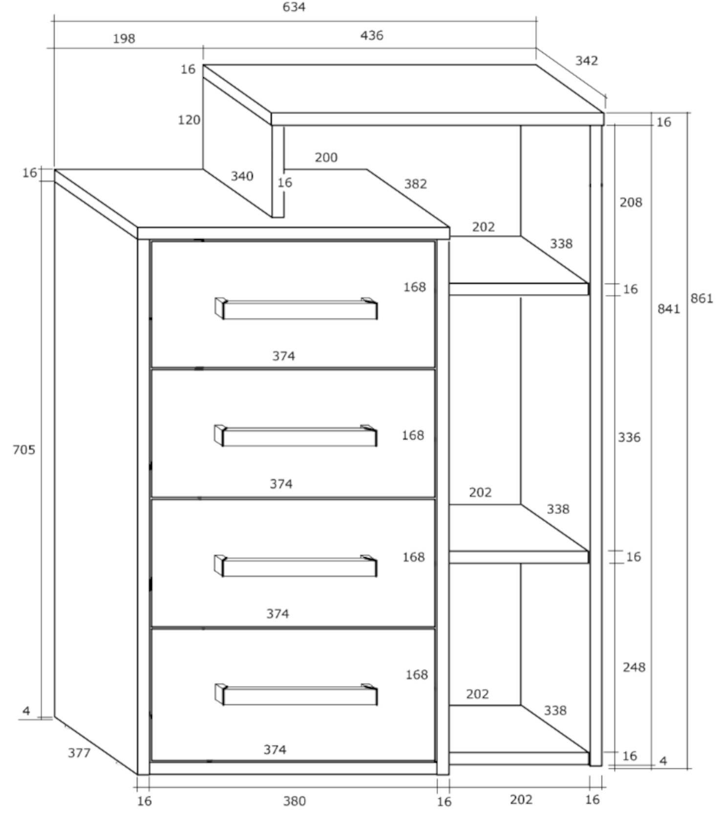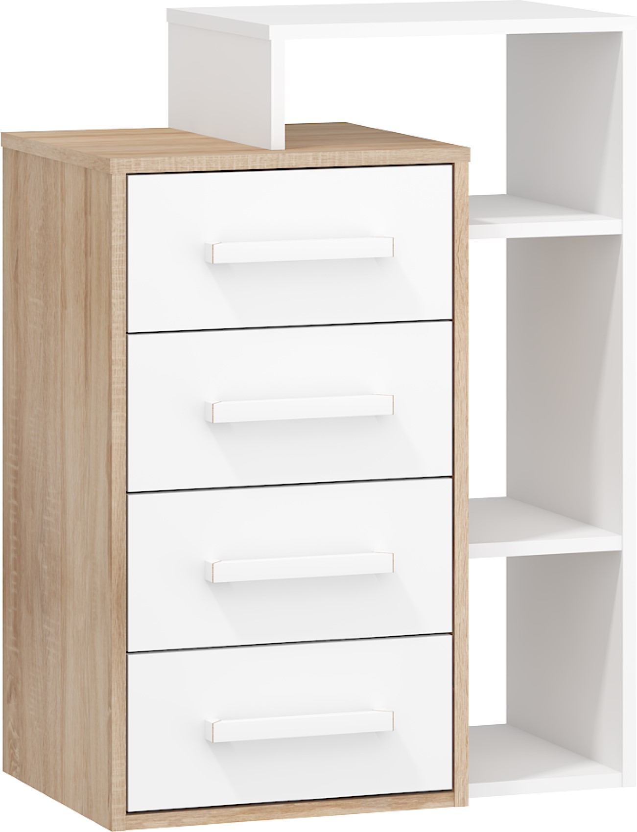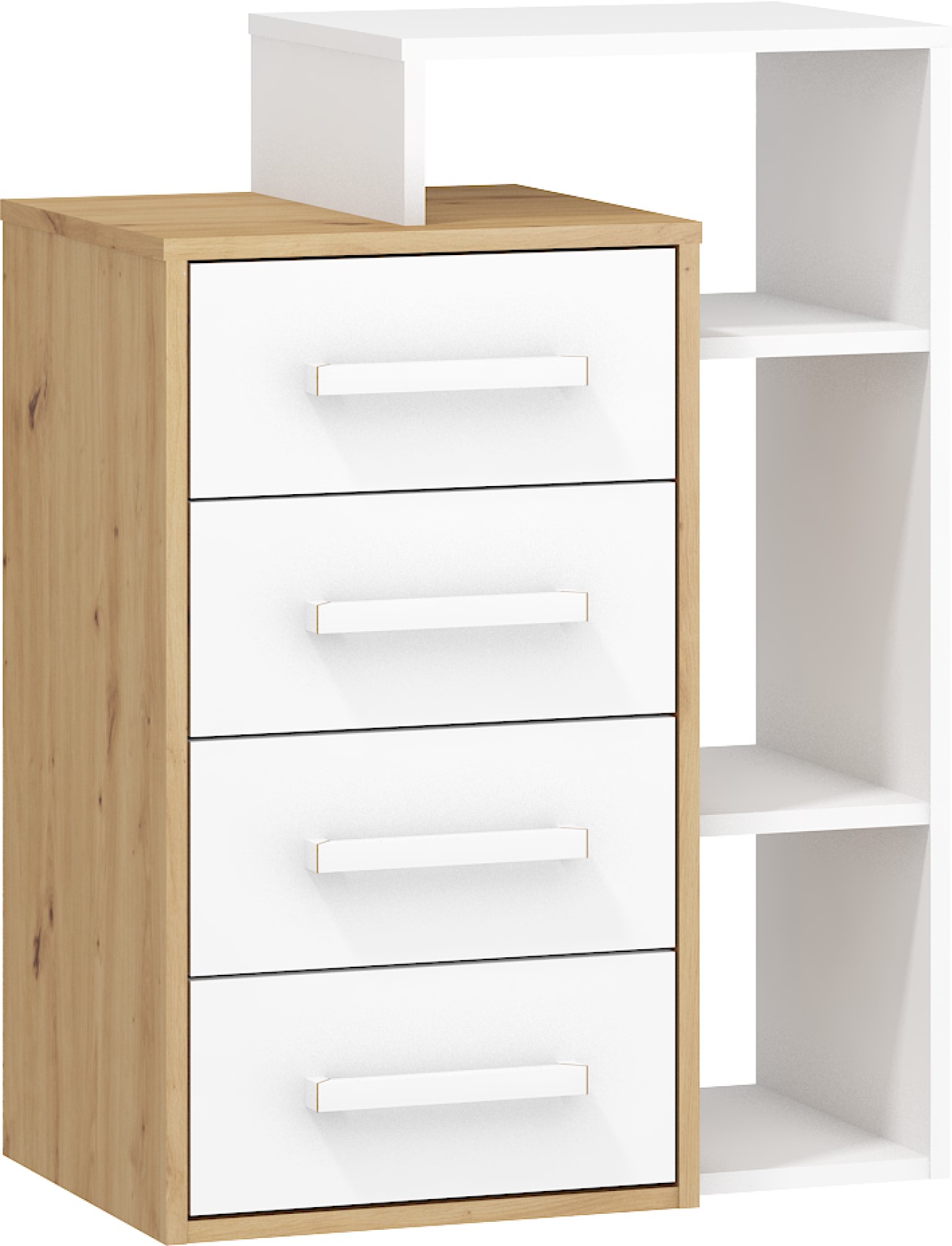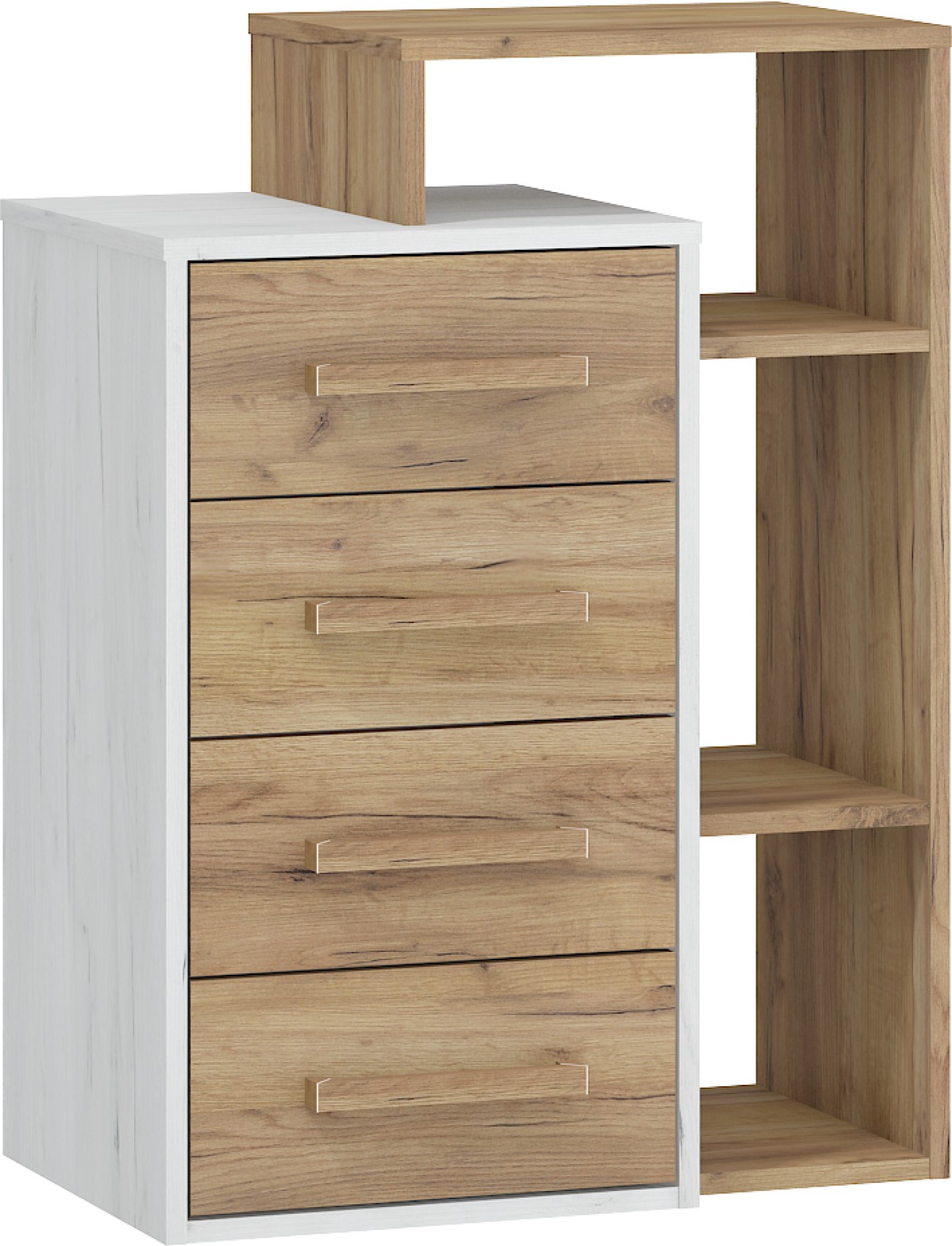 Součástí jsou 4 zásuvky na kovových pojezdech. Na pravé straně jsou 3 otevřené niky k vystavení vašich oblíbených dekorací.