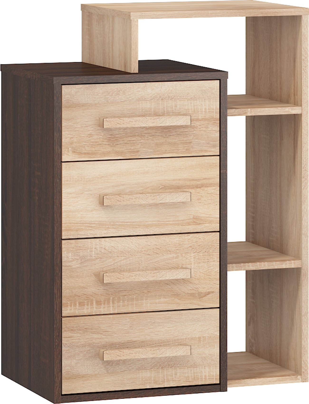 Komoda P4S Rio 09 se skvěle hodí do moderně zařízených interiérů zejména předsíní. Zaujme vás svým neobvyklým avšak moderním designem a přírodním provedením. Je vyrobena z kvalitních lamino desek o síle 16 mm a 25 mm. Desky mají ABS hranění, které zvyšuje odolnost pro odštípnutí hran. Součástí zásuvek a dvířek je zabudovaný systém tichého dovírání. Nabízíme vám několik barevných variant. Zajímavý design barev dodává skříni ještě více na luxusu a nadčasovosti.
