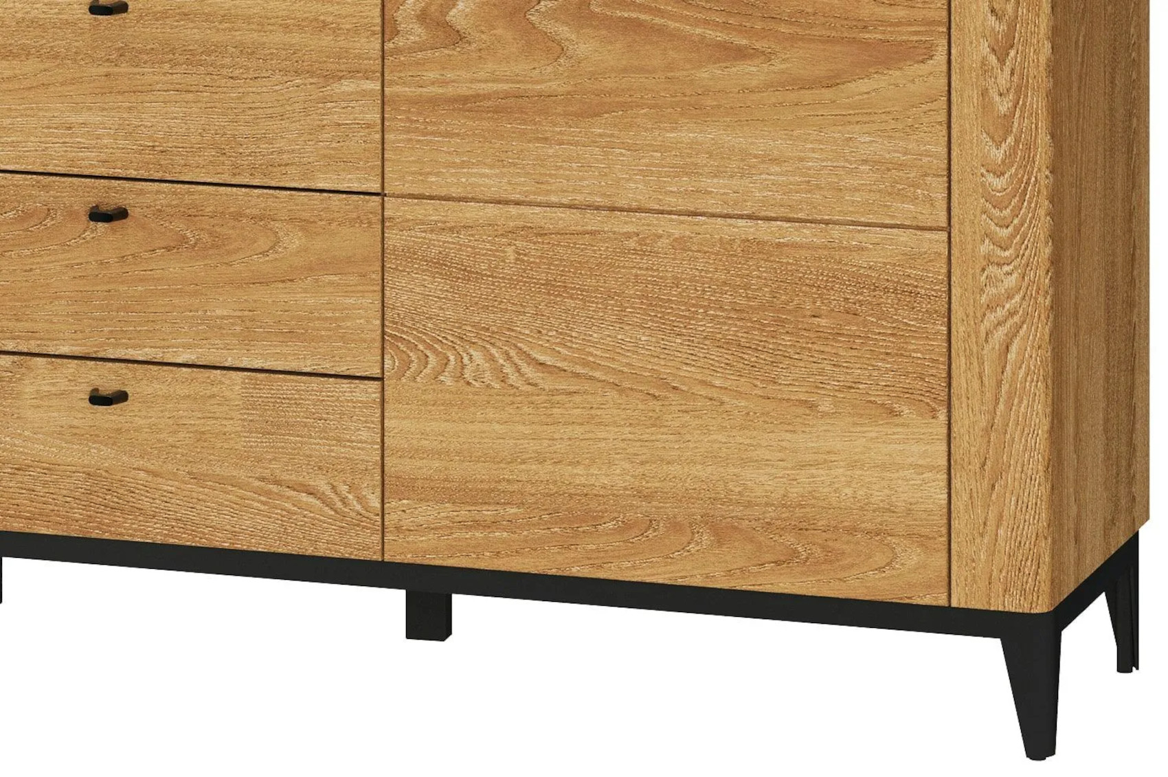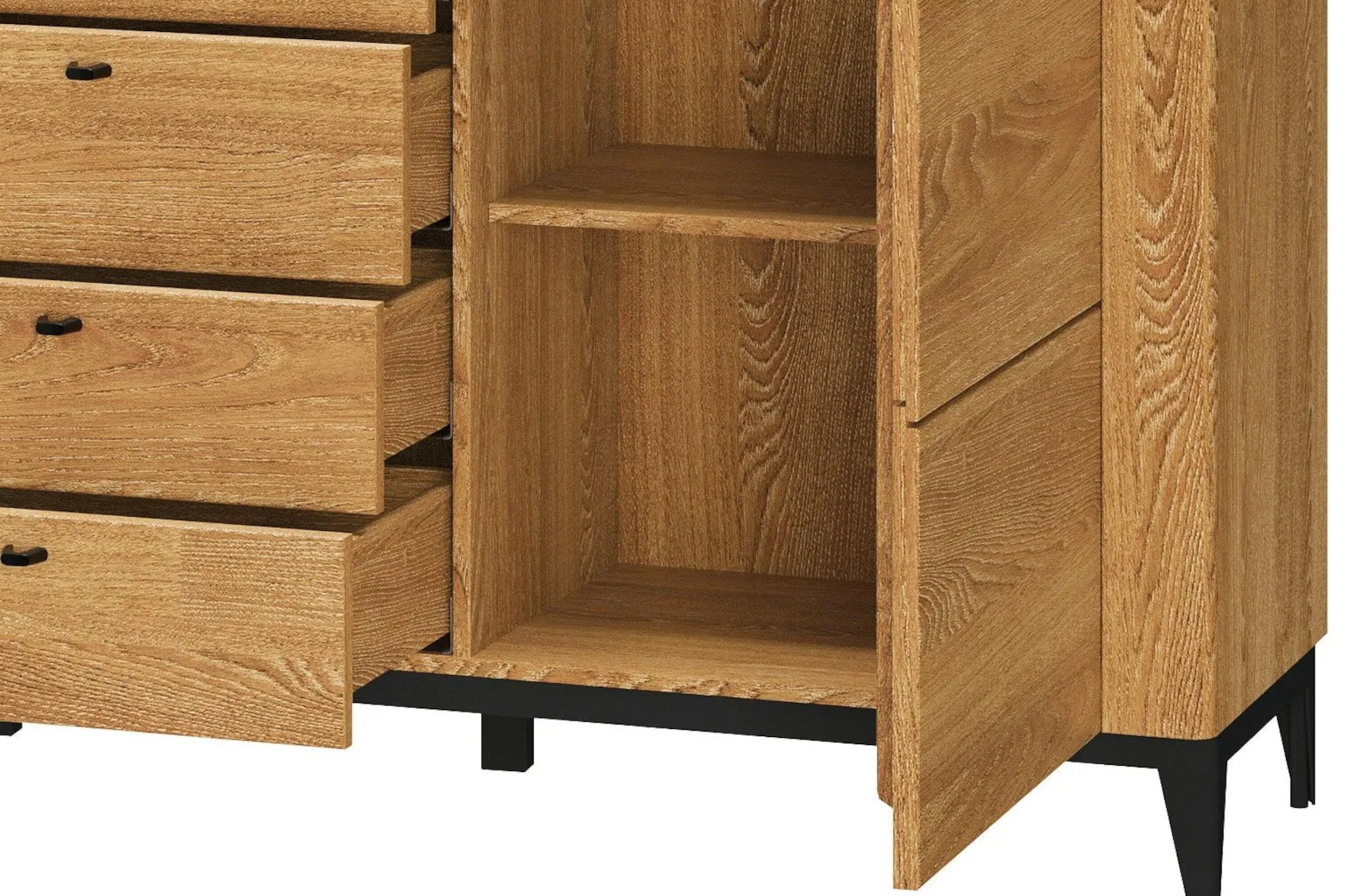 Komoda Porto 45 vás zaujme svým přírodním designem s viditelnou strukturou dřevěných lét. Je vyrobena z masivního dubového dřeva a přírodní dubové dýhy zaručující kvalitu a odolnost. Součástí komody jsou kovové úchyty a nožky v odstínu černý mat, které dodají nábytku nádech elegance a provzdušní váš celkový prostor. Dvířka a zásuvky v celém systému mají zabudovaný systém tichého dovírání.
