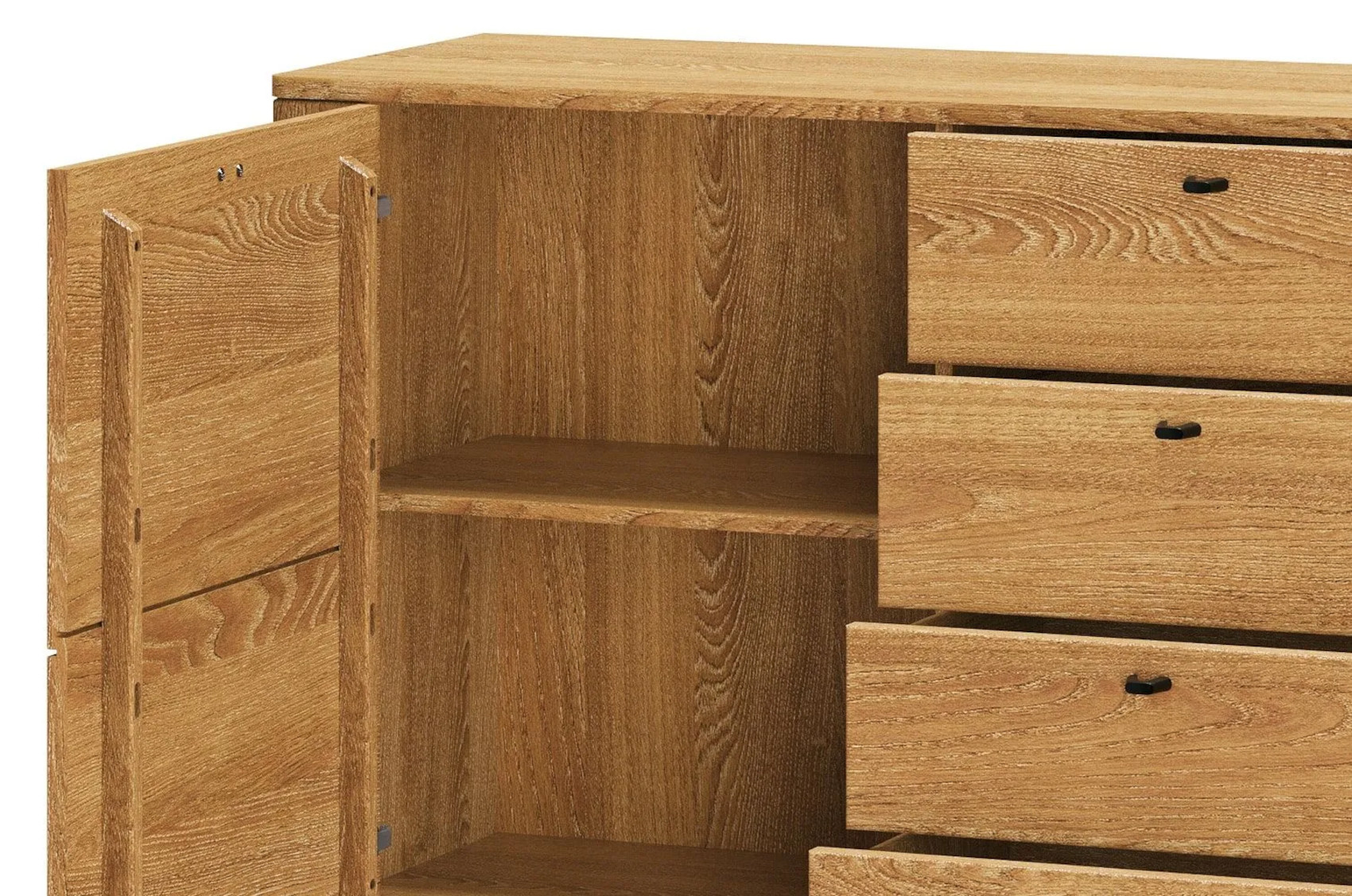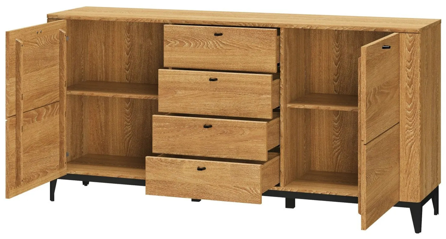 Komoda má 2 krajní dvířka, za kterými jsou vloženy 2 lakované police. Uprostřed jsou 4 prostorné zásuvky na kovových pojezdech.