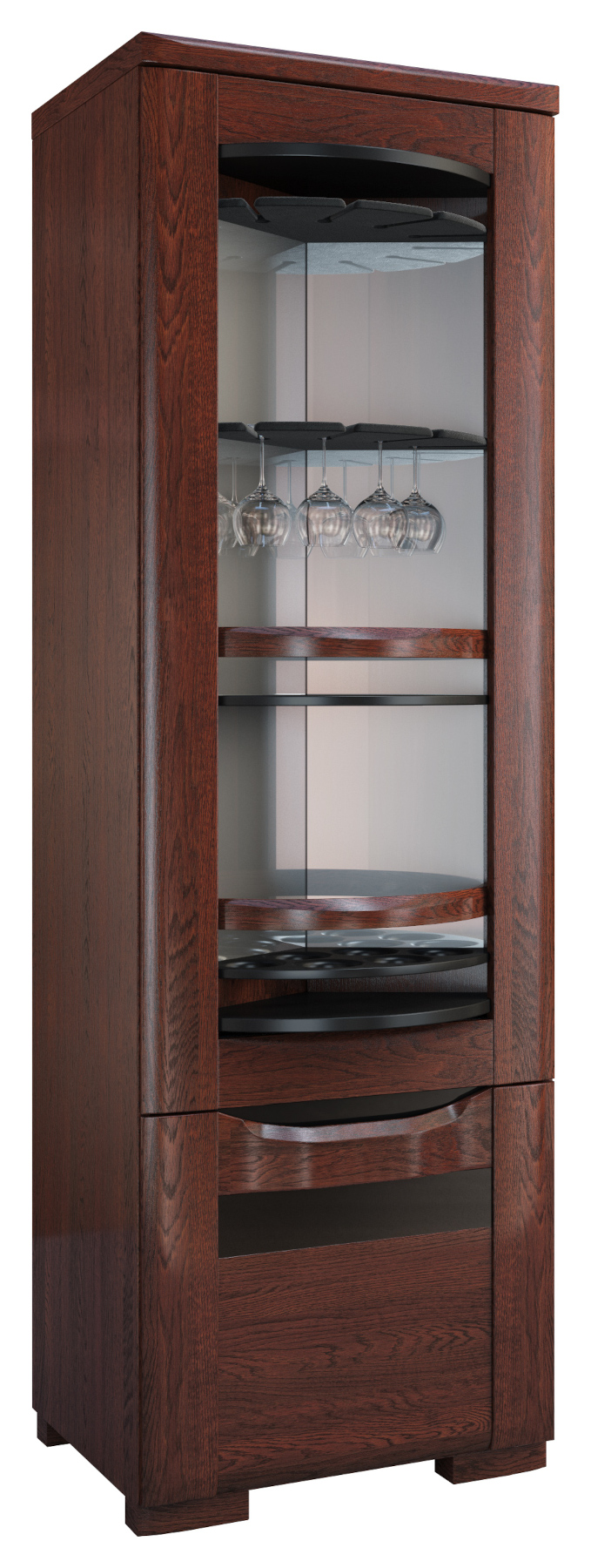 Komoda je rozdělena do 2 částí. V horní části se nachází bar na rotačním kloubu, díky kterému můžete pouhým otočením změnit vnitřní uspořádání komody. Z jedné strany je dřevěný policový systém a z druhé strany je vinný bar. Součástí baru jsou závěsy na sklenice a držáky k uložení vína. Spodní část má plná dvířka, za kterými je vložena 1 lakovaná police. Za příplatek si můžete zvolit variantu s LED podsvícením, které dodá nábytku nádech luxusu a jedinečnosti.