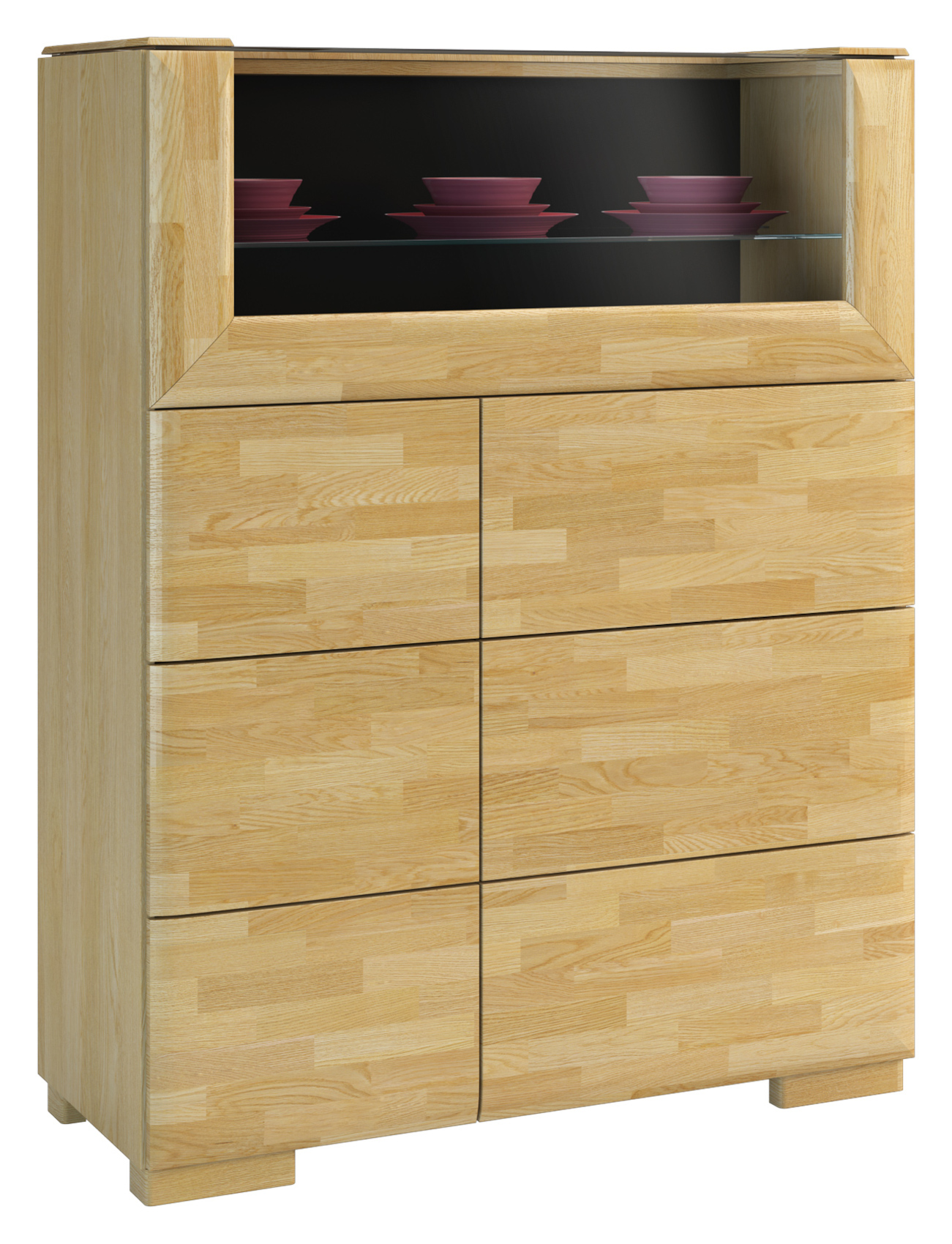 Komoda Rossano 2D s proskleným barem vás zaujme svým moderním a jednoduchým designem. Je vyrobena z masivního dubového dřeva a skla Antisol. Kvalitní technologie lakování a moření dodává nábytku přirozený vzhled a zvýrazňuje jeho strukturu lét. Za příplatek si můžete zvolit horní desku s masivní dubovou hranou. Celkový systém má jednoduchý dotykový systém otevírání dvířek - Push to open. Máte na výběr ze 2 barevných variant.