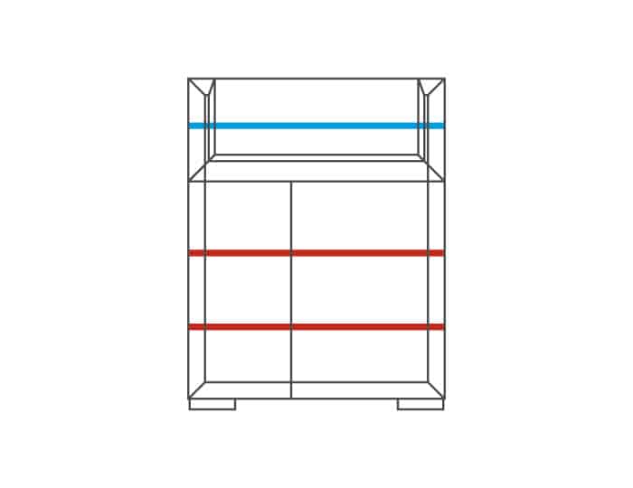 Horní část komody je prosklená s 1 skleněnou policí a LED podsvícením, které dodává nábytku nádech elegance a luxusu. Ve spodní části jsou 2 plná dvířka se 4 lakovanými policemi.