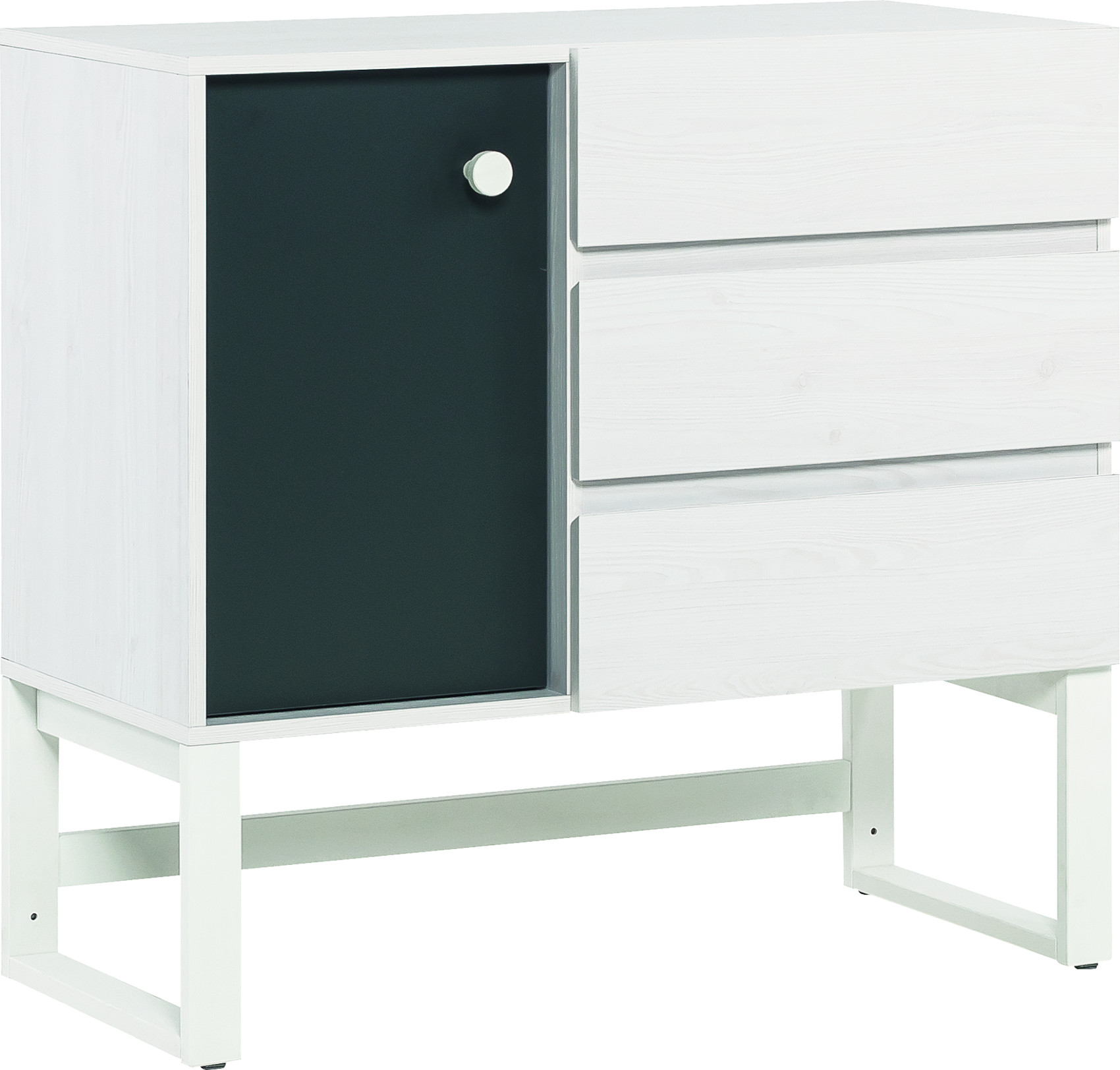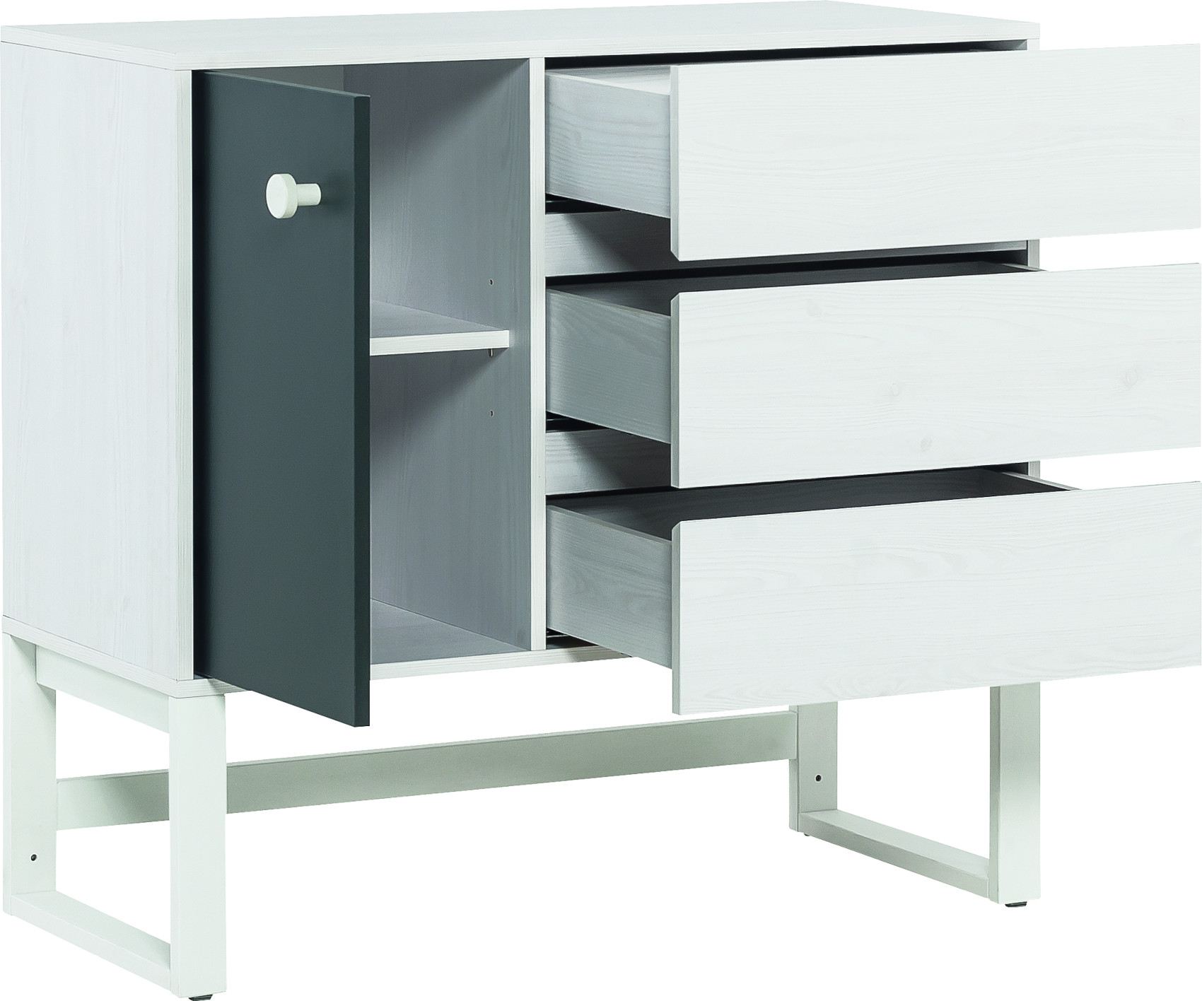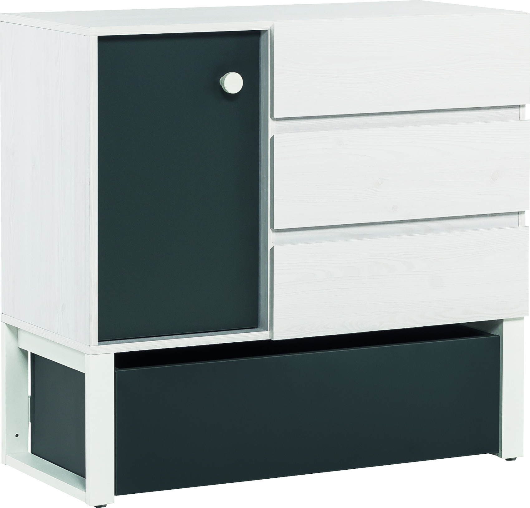 Za levými dvířky je vložena police s libovolně nastavitelnou výškou. Pravá část je sestavena ze 4 zásuvek na kovových pojezdech.