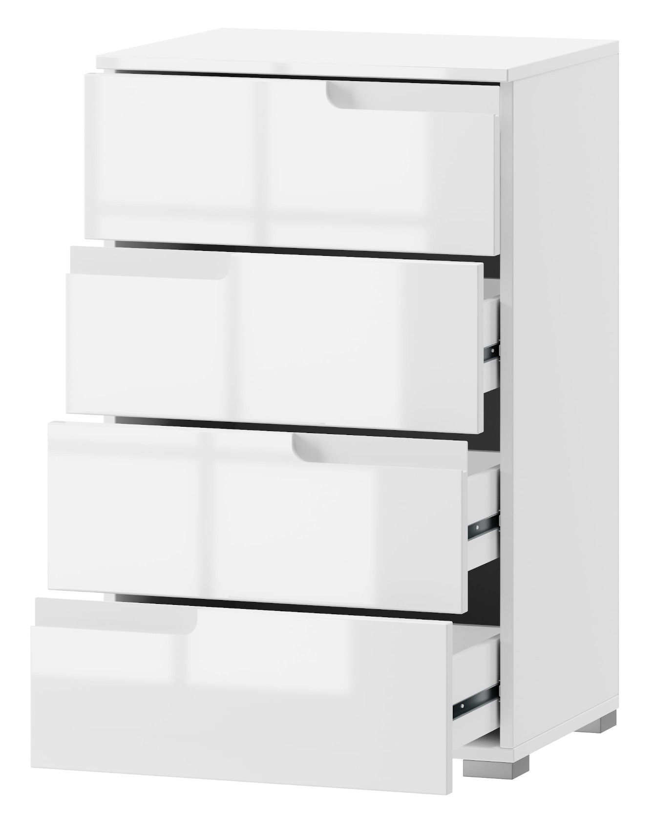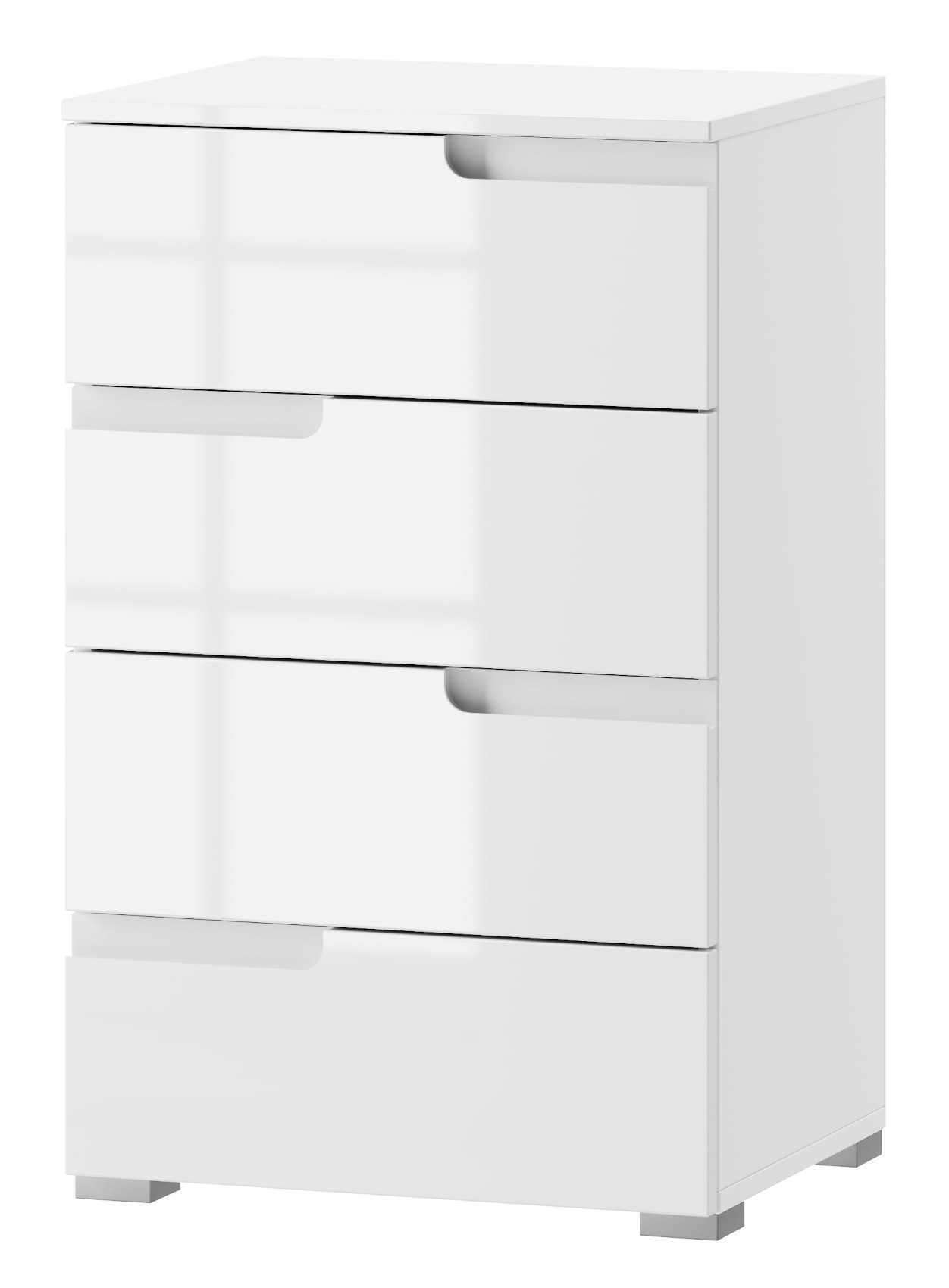 Moderní komoda Selene 2 vás zaujme svým luxusním designem. Je vyrobena z MDF dřevotřísky s tenkou vrstvou masivního dřeva v kombinaci s kvalitním laminem potaženého bílou fólií. Přední část je v lesku a korpus je matný. Komoda stojí na nízkých plastových nožkách ve stříbrném odstínu