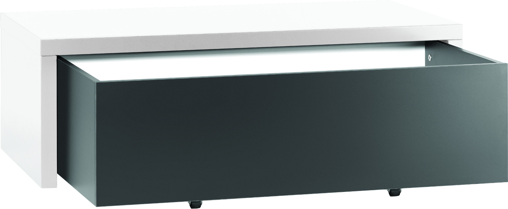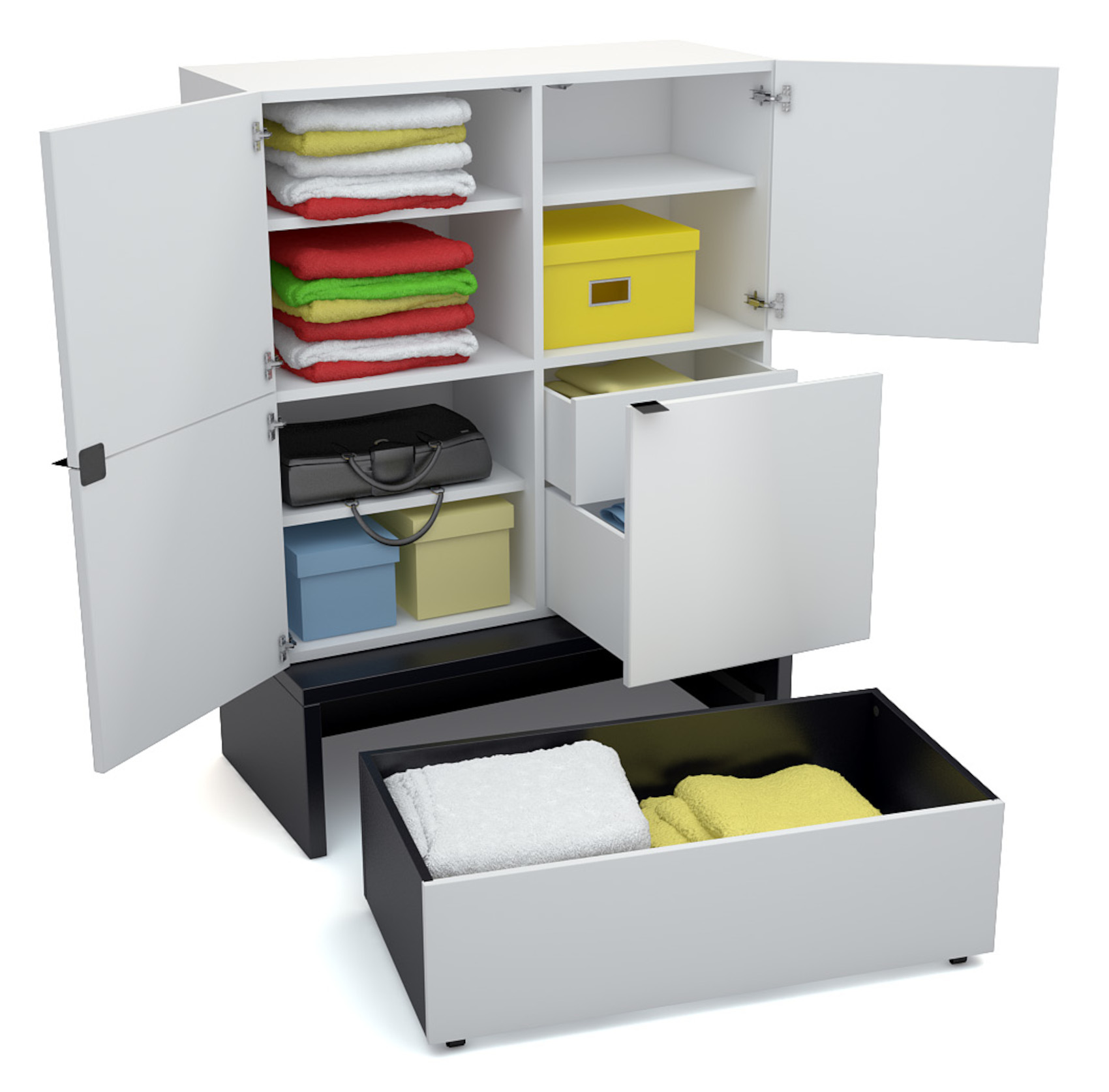 Komoda má 3 dvířka a 2 zásuvky na kovových pojezdech. Za dvířky jsou vloženy 3 police s libovolně nastavitelnou výškou. Součástí podesty je další zásuvka k uložení ložního prádla nebo přikrývky. Zásuvka je oboustranná, tudíž si lze zvolit barevnou variantu přední strany - černá nebo bílá.