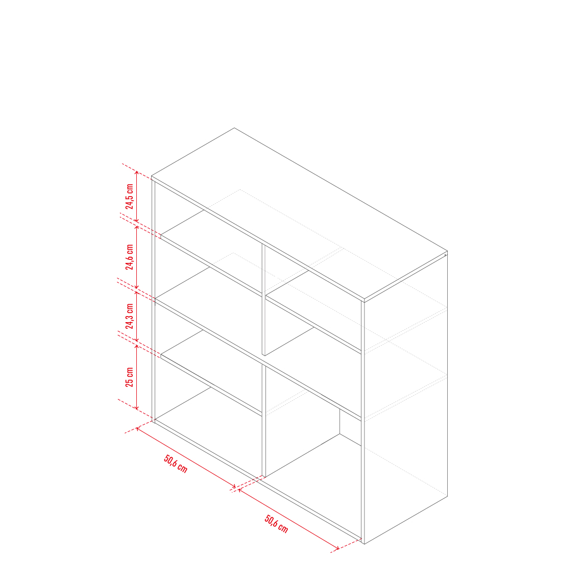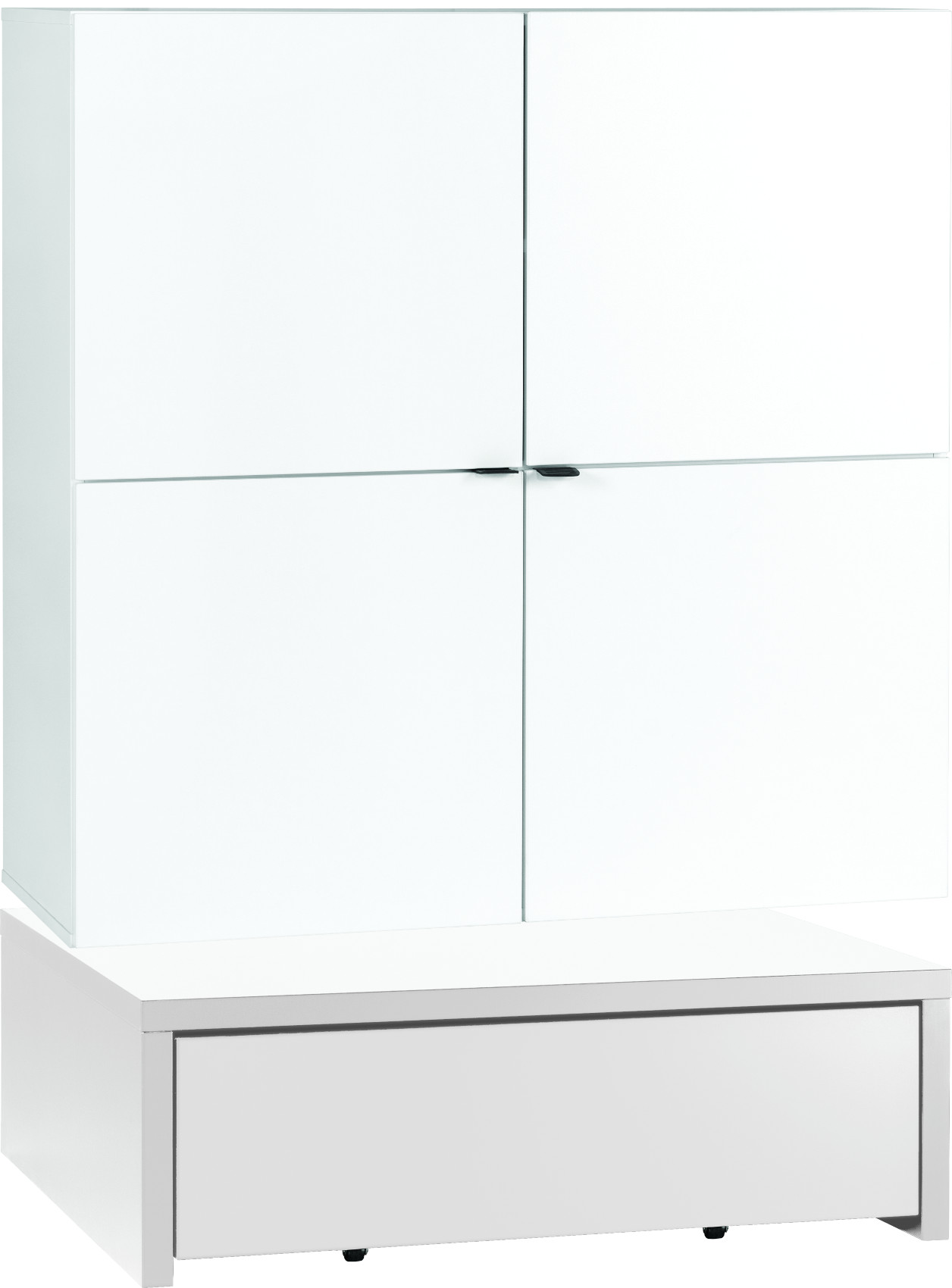 Komoda má 3 dvířka a 2 zásuvky na kovových pojezdech. Za dvířky jsou vloženy 3 police s libovolně nastavitelnou výškou. Součástí podesty je další zásuvka k uložení ložního prádla nebo přikrývky. Zásuvka je oboustranná, tudíž si lze zvolit barevnou variantu přední strany - černá nebo bílá.