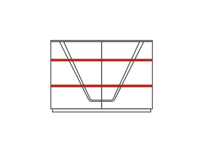 Komoda má 2 plná dvířka, za kterými jsou vloženy 4 lakované police.