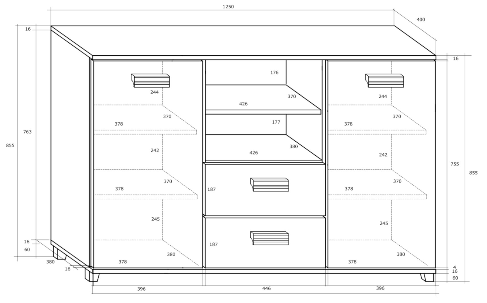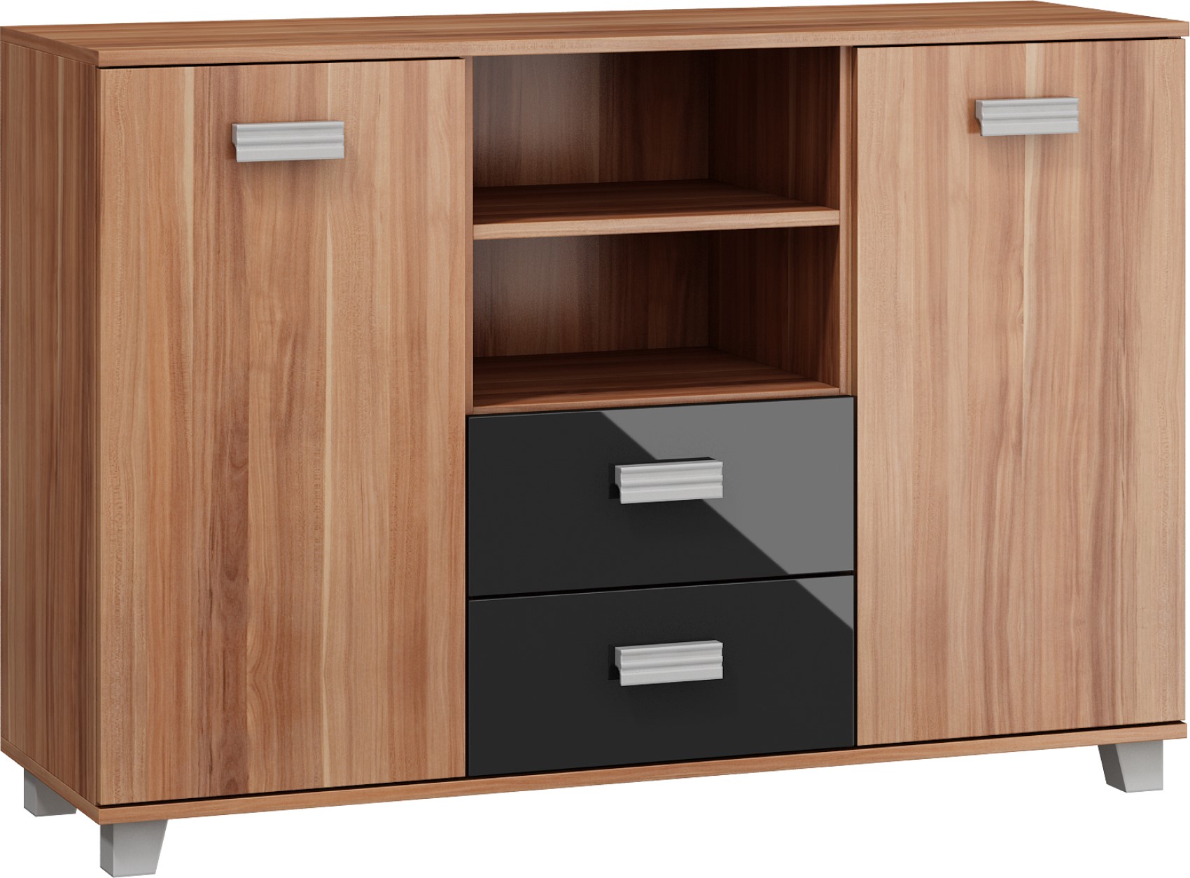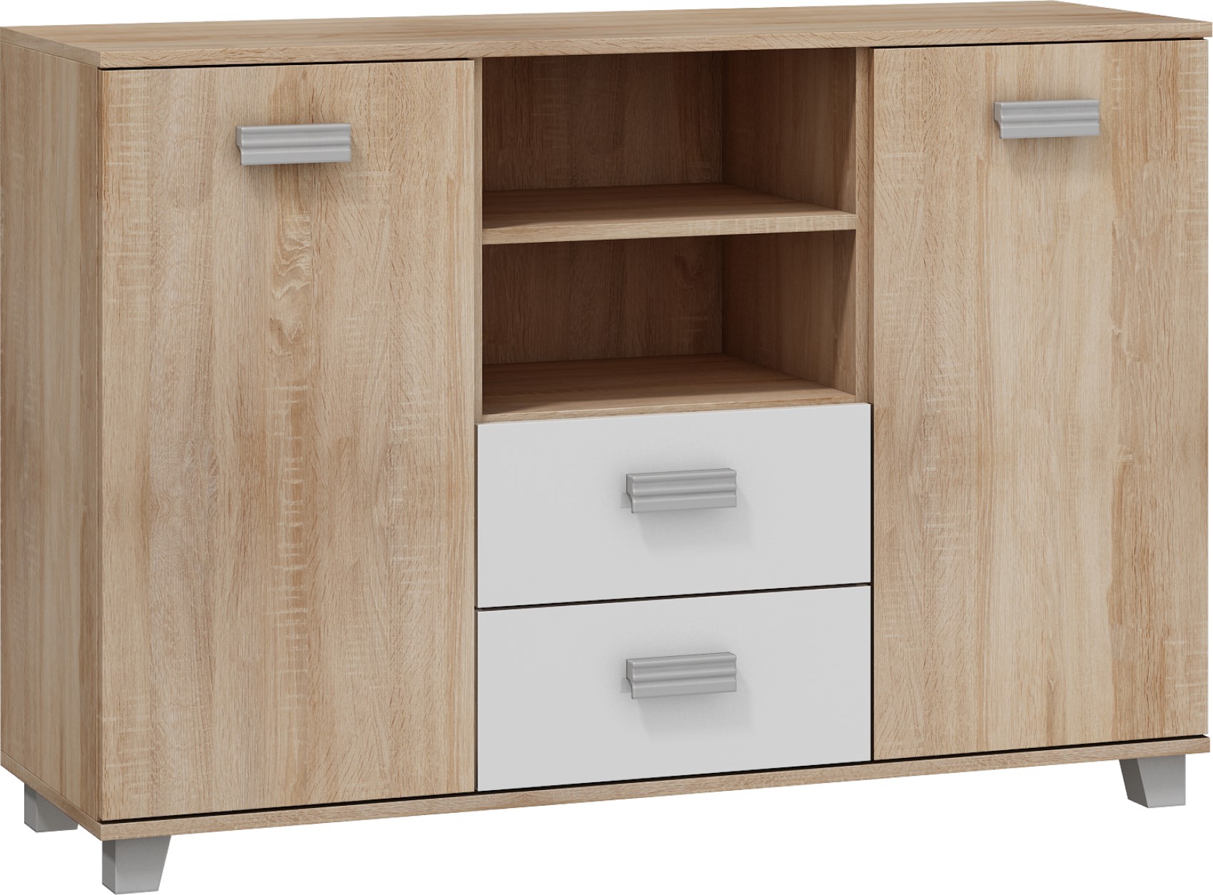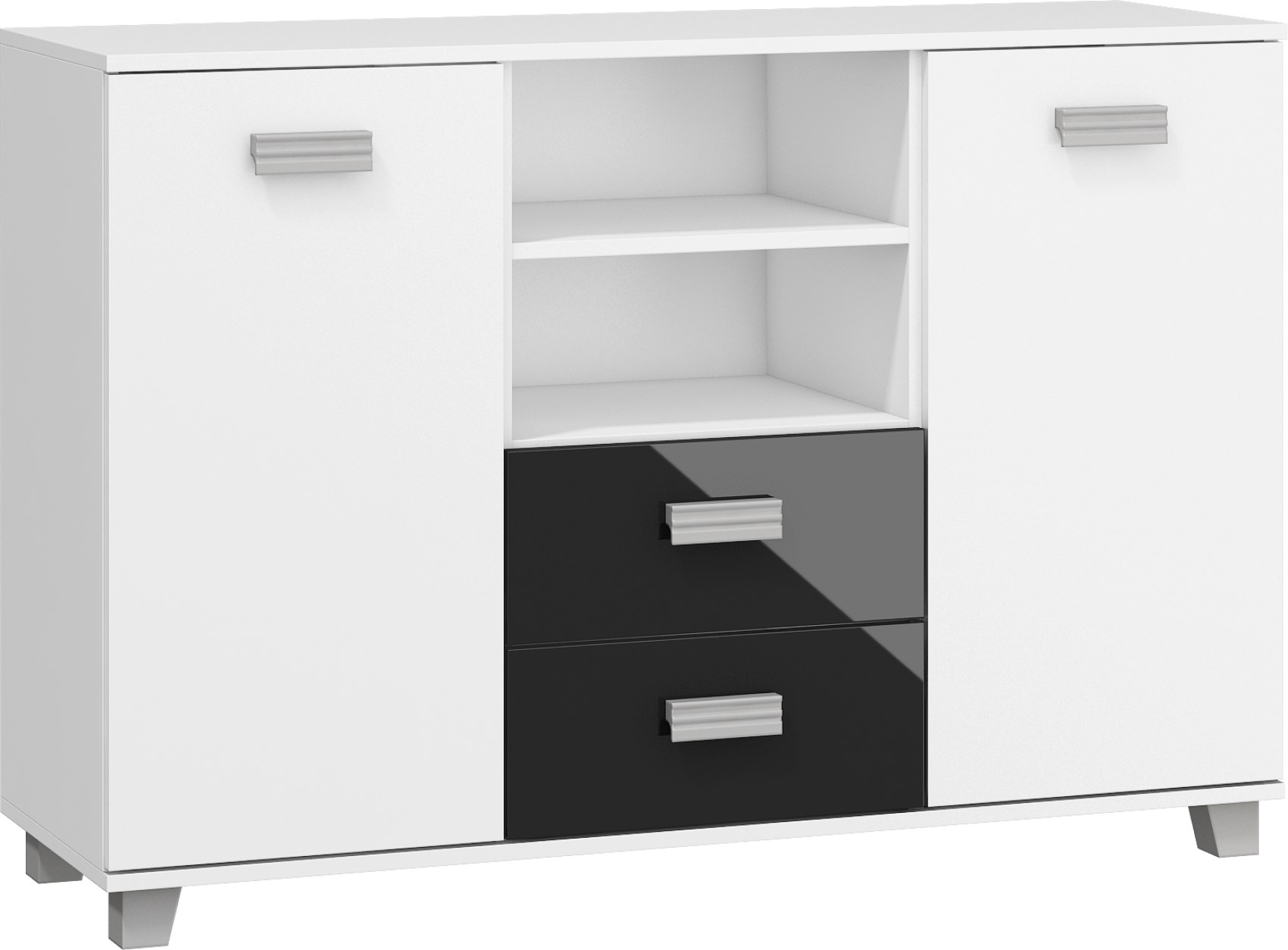 Součástí komody jsou 2 dvířka, za kterými jsou vloženy 4 lakované police. Ve spodní prostřední části jsou 2 zásuvky na kovových pojezdech. V horní části jsou 2 otevřené niky k vystavení vašich oblíbených knih, dekorací, rámečků s fotografiemi či jiných nezbytností.