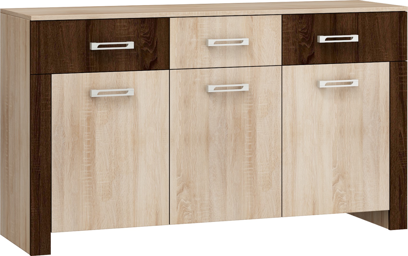 Komoda střední Hugo 04 se skvěle hodí do moderně zařízených interiérů. Zaujme vás svým neobvyklým avšak moderním designem a přírodním provedením. Je vyrobena z kvalitních lamino desek o síle 16 mm. Příjemný design nábytku doplňují stříbrné úchytky z odolného tvrzeného plastu. Nabízíme vám několik barevných variant. Zajímavý design barev dodává komodě ještě více na luxusu a nadčasovosti. Jednotlivé díly jsou variabilní, lze je navzájem kombinovat a vytvořit si tak pracovnu či studentský pokoj podle svých představ.