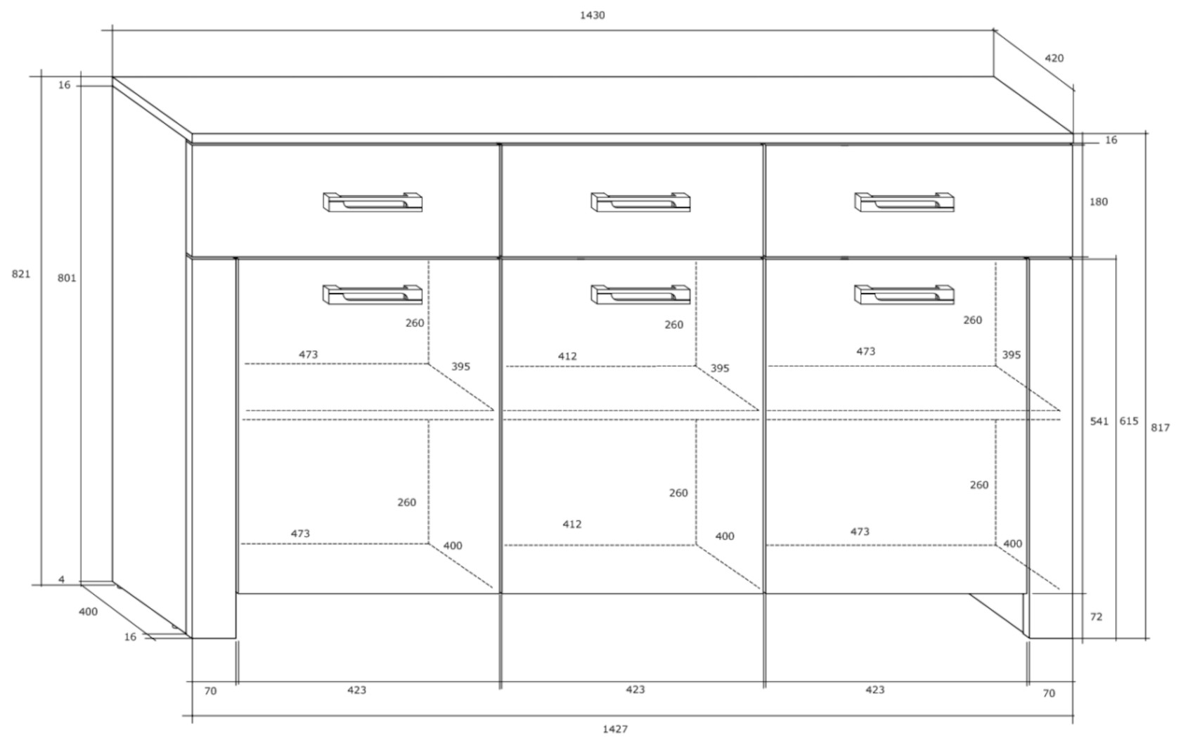 Součástí jsou 3 dvířka, za kterými jsou vloženy 3 lakované police. V horní části jsou 3 zásuvky na kovových pojezdech.