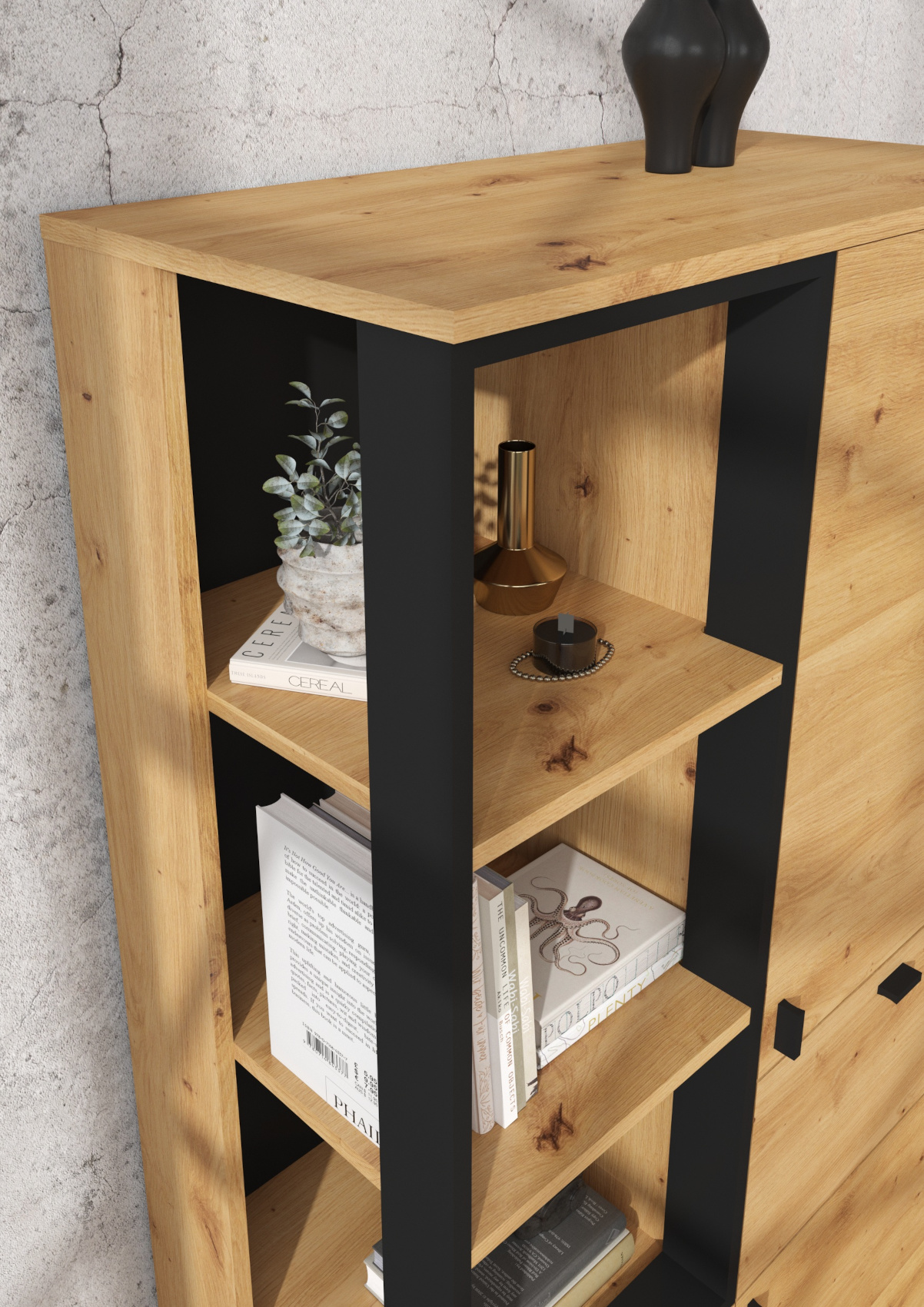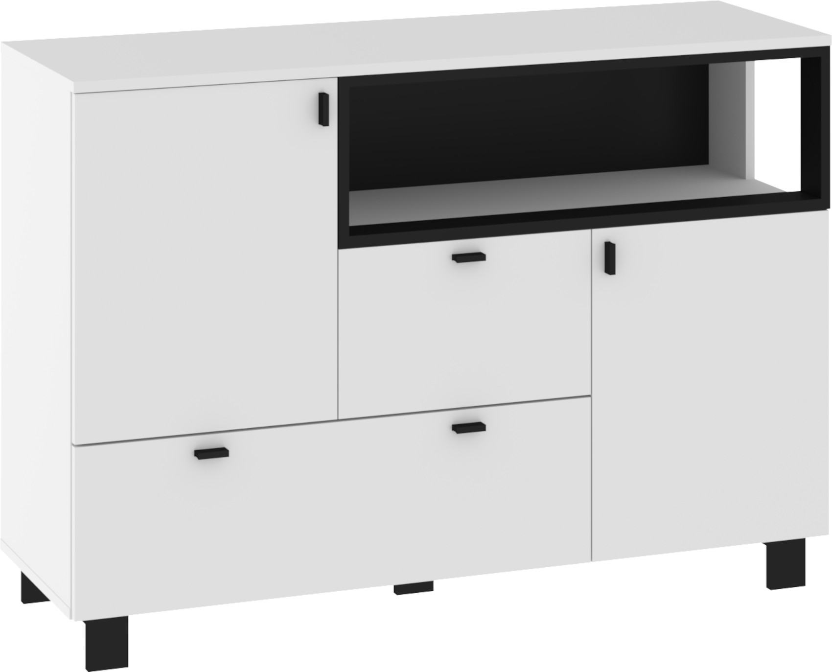 Součástí komody jsou 2 dvířka, za kterými je vložena vždy 1 lakovaná police. Ve spodní a prostřední části jsou 2 zásuvky na kovových pojezdech. Nad zásuvkou je otevřené nika k vystavení vašich oblíbených dekorací, knih či fotografií.