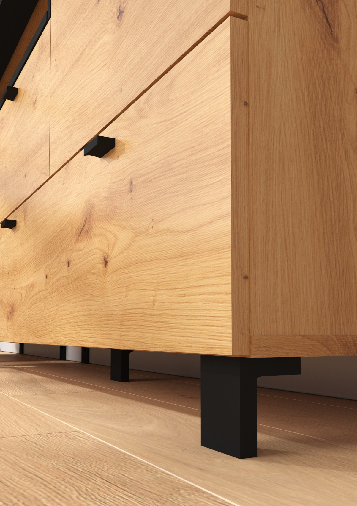 Komoda Vegas 02 vás zaujme svým moderním designem a přírodním provedením v kombinaci s černými či bílými detaily. Je vyrobena z kvalitních lamino desek o síle 16 mm. Desky mají ABS hranění, které zvyšuje odolnost pro odštípnutí hran. Součástí zásuvek a dvířek jsou jednoduché černé kovové úchyty, zároveň mají zabudovaný systém tichého dovírání. Nábytek stojí na černých kovových nožkách o velikosti 8 cm, které provzdušní váš celkový prostor. Nabízíme vám několik barevných variant.