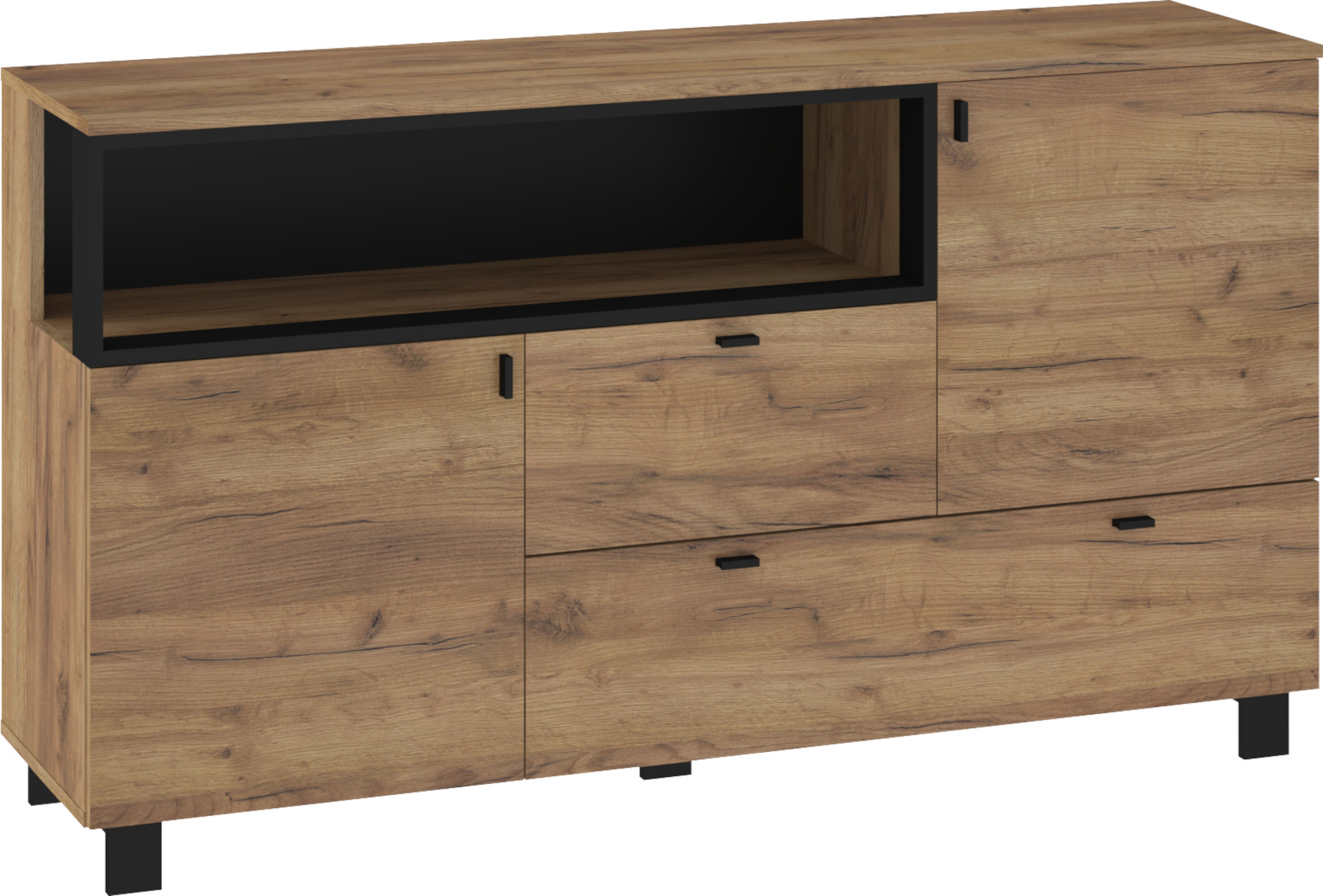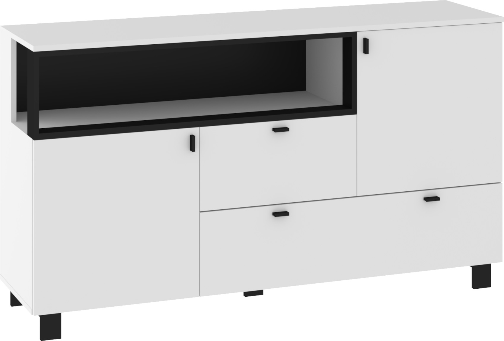 Součástí komody jsou 2 dvířka, za kterými je vložena vždy 1 lakovaná police. Ve spodní a prostřední části jsou 2 zásuvky na kovových pojezdech. Nad zásuvkou je otevřené nika k vystavení vašich oblíbených dekorací, knih či fotografií.