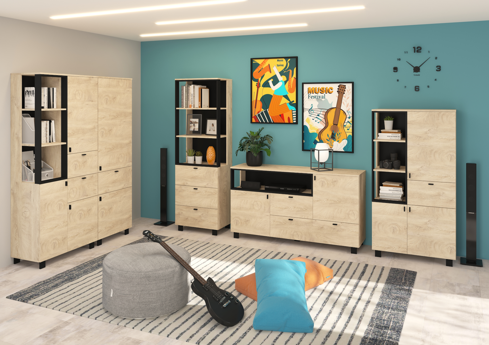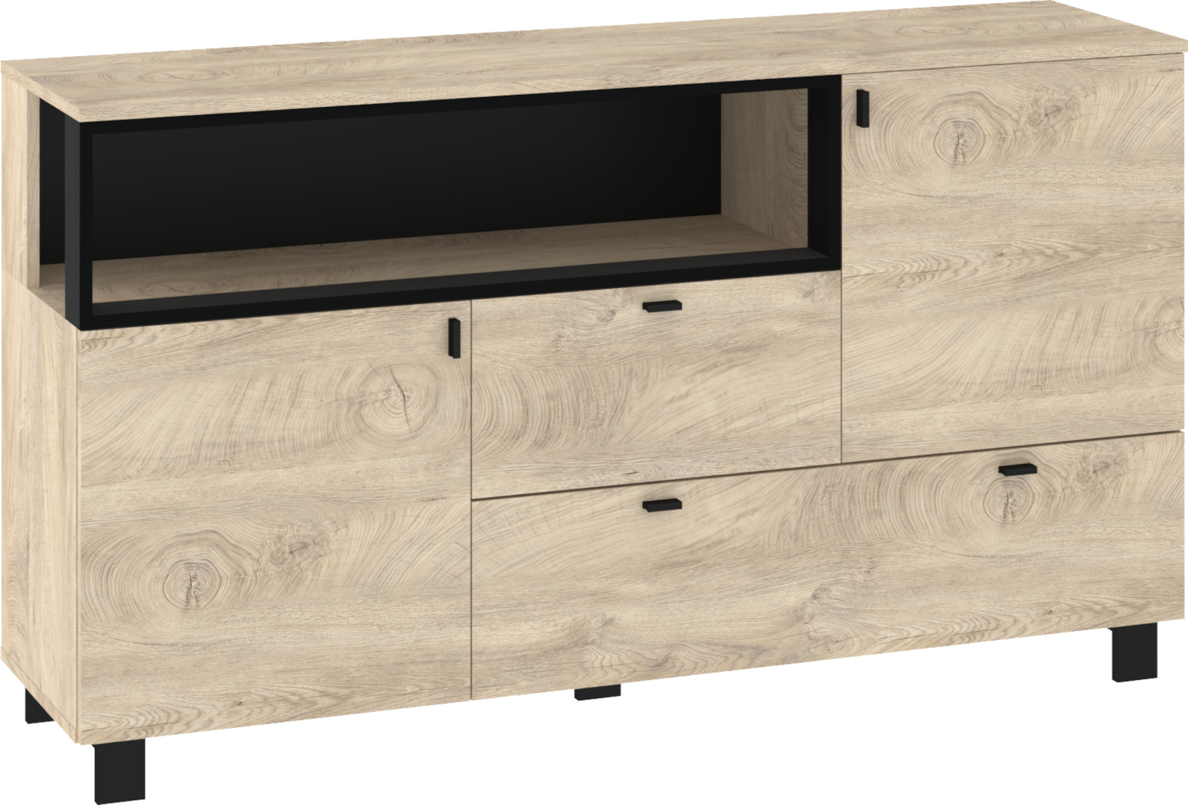 Komoda Vegas 03 vás zaujme svým moderním designem a přírodním provedením v kombinaci s černými či bílými detaily. Je vyrobena z kvalitních lamino desek o síle 16 mm. Desky mají ABS hranění, které zvyšuje odolnost pro odštípnutí hran. Součástí zásuvek a dvířek jsou jednoduché černé kovové úchyty, zároveň mají zabudovaný systém tichého dovírání. Nábytek stojí na černých kovových nožkách o velikosti 8 cm, které provzdušní váš celkový prostor. Nabízíme vám několik barevných variant.