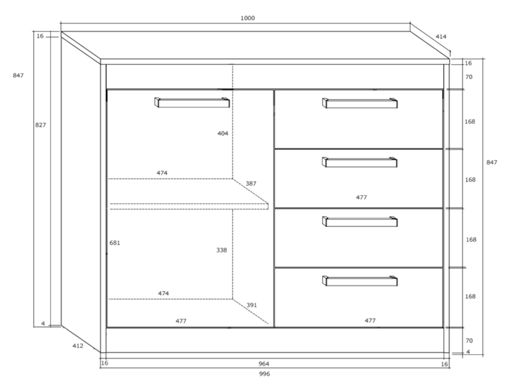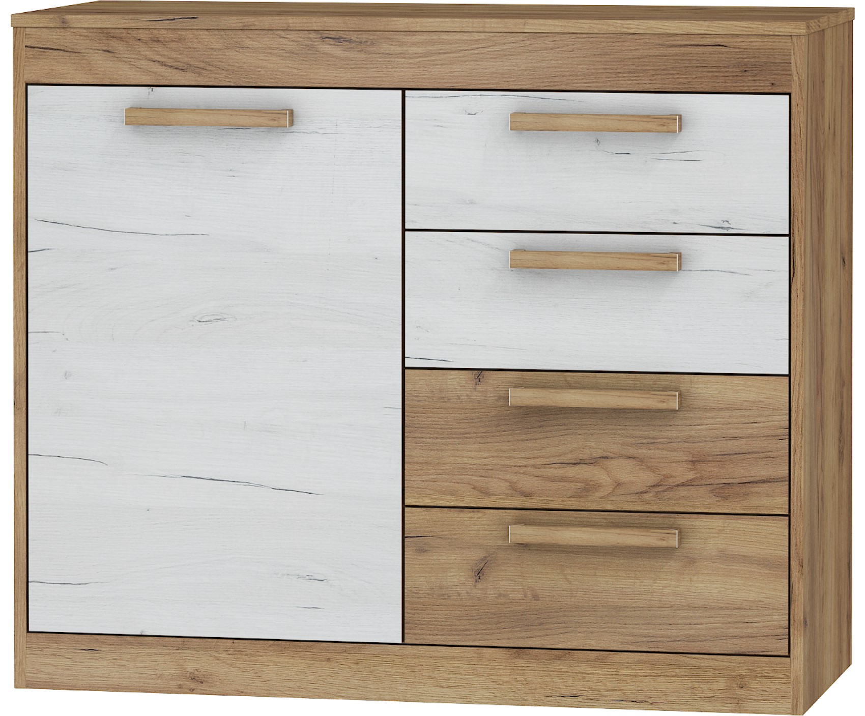 Komoda nabízí skříňku s 1 lakovanou policí a čtyři zásuvky na kovových pojezdech, které můžete využít na uskladnění různých nezbytností.