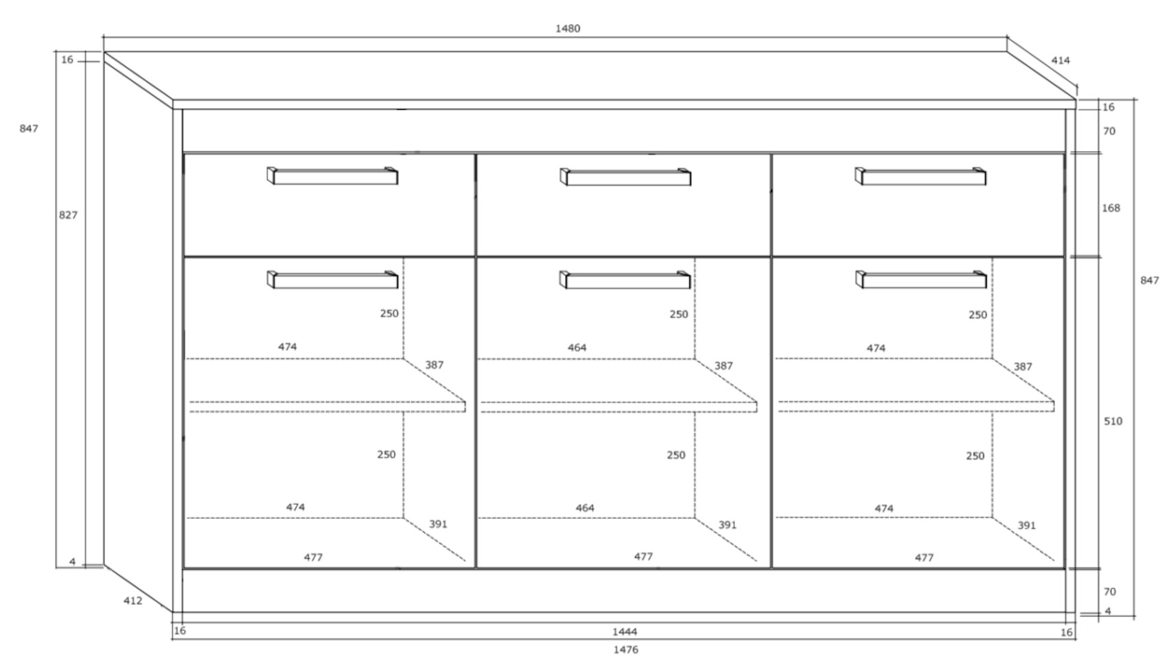 Součástí komody jsou 3 dvířka, za kterými jsou vloženy 3 lakované police. Nad dvířky jsou 3 zásuvky na kovových pojezdech k uložení vašich veškerých nezbytností.