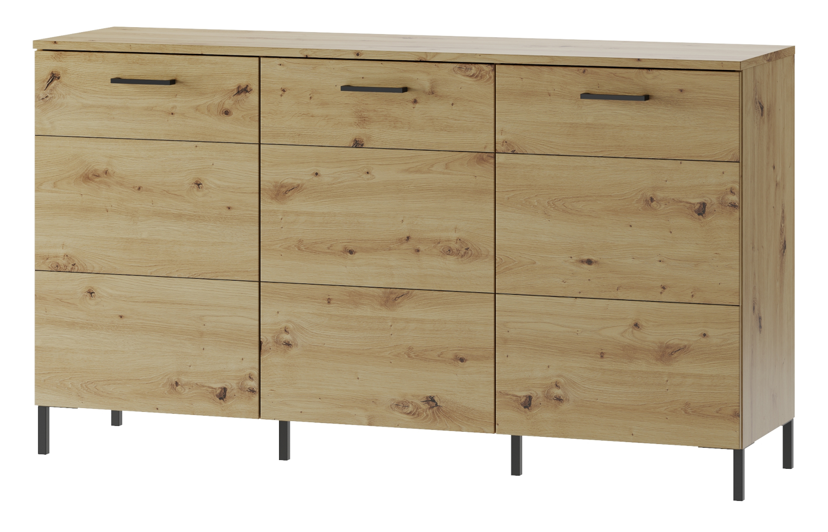 Moderní komoda Lucas 36 vás zaujme svým luxusním designem se strukturou dřevěných lét. Je vyrobena z lamina potaženého fólií, která navodí dojem přírodního dřeva. Jedinečnými prvky jsou černé plastové úchyty. Komoda stojí na černých kovových nožkách, které provzdušní váš celý interiér.