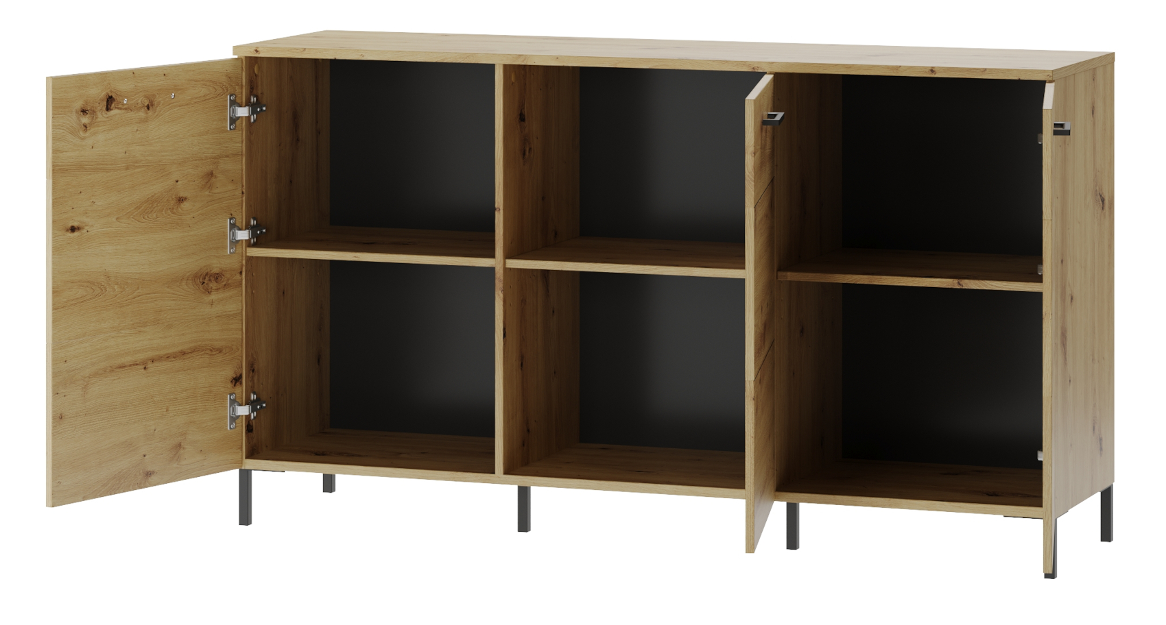 Komoda má 3 plná dvířka, která mají systém tichého dovírání. Ve vnitřním prostoru jsou vloženy 3 police z lamina.