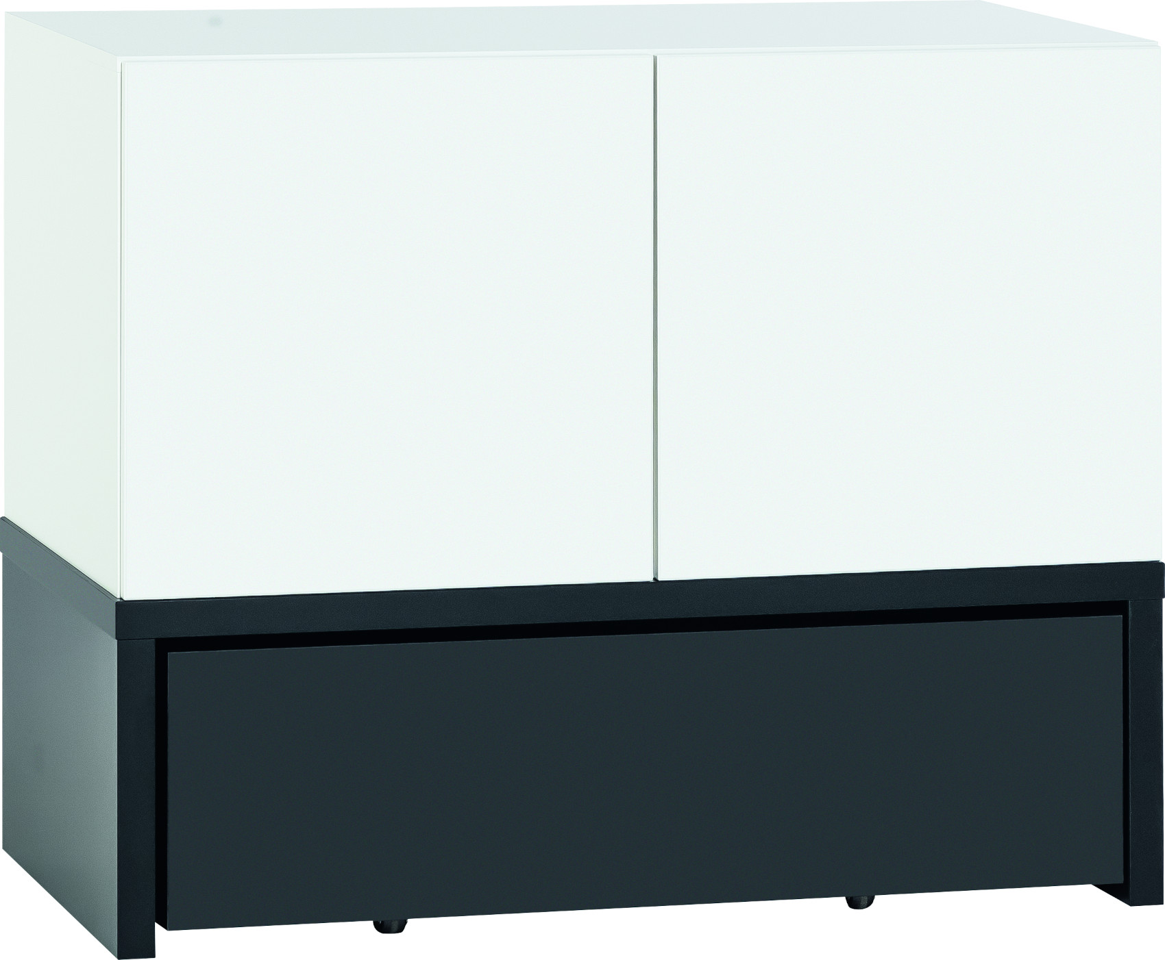 Komoda má 4 zásuvky na kovových pojezdech. Součástí podesty je zásuvka k uložení ložního prádla nebo přikrývky. Zásuvka je oboustranná, tudíž si lze zvolit barevnou variantu přední strany - černá nebo bílá.