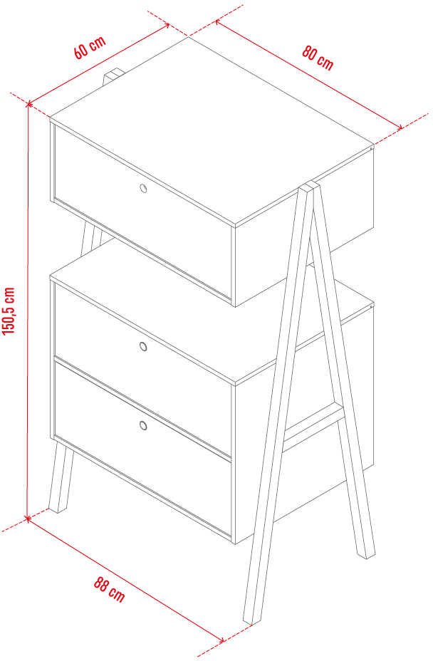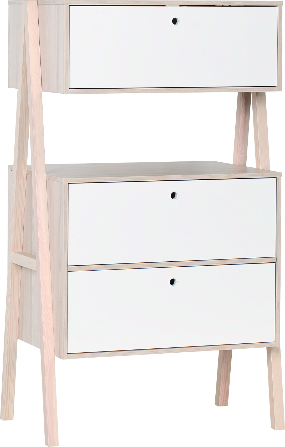 Třípatrová komoda Spot vás zaujme svým prostým designem v odstínu akátového dřeva v kombinaci s bílým lakem. Je vyroben z kvalitního lamina o síle 16 mm odolného vůči nečistotám a poškrábání. Úzké vysoké nožky, které dodají nábytku nádech elegance a provzdušní váš interiér, jsou z masivního borovicového dřeva.