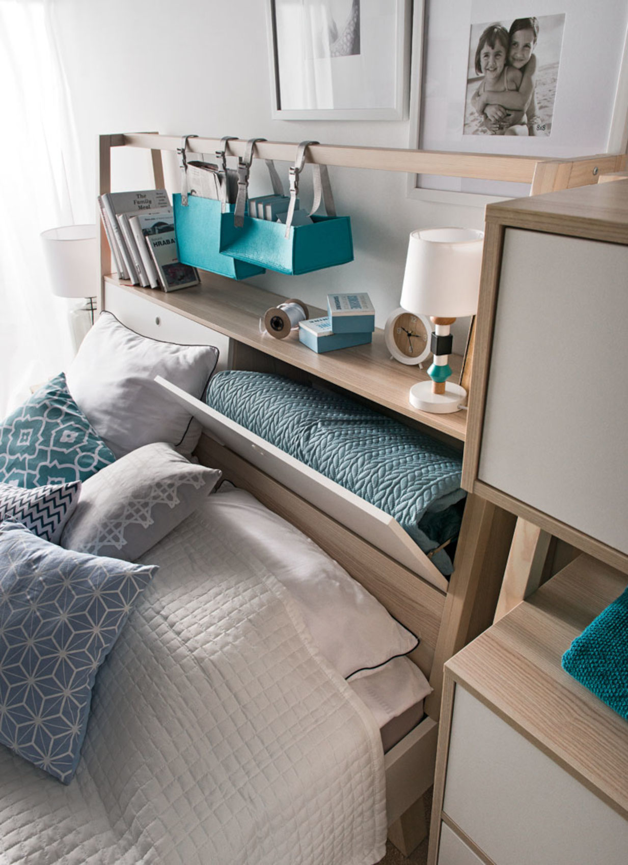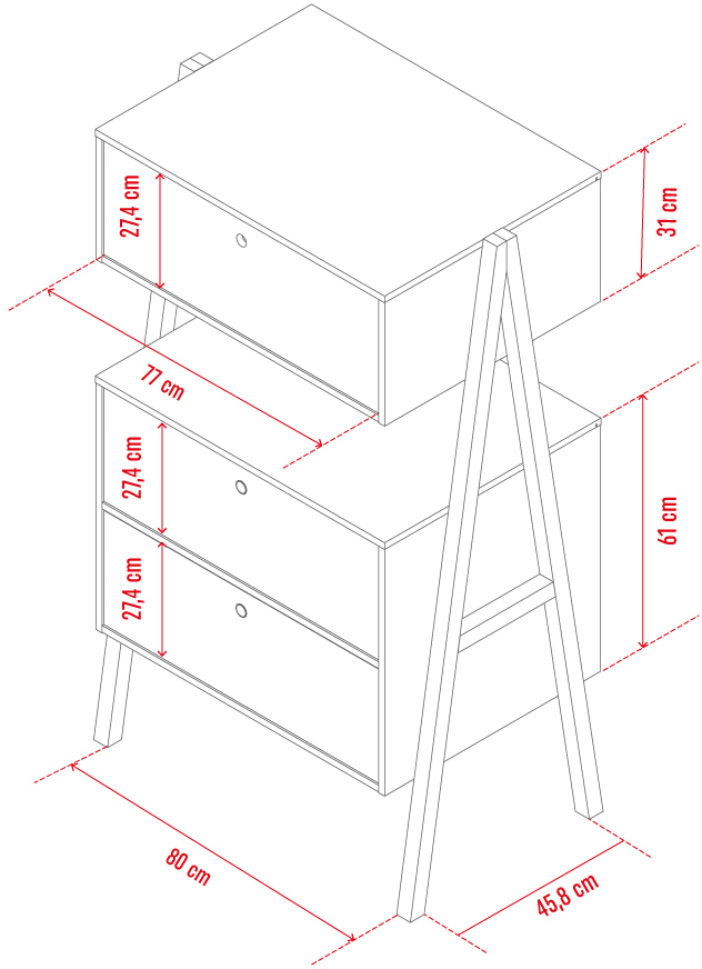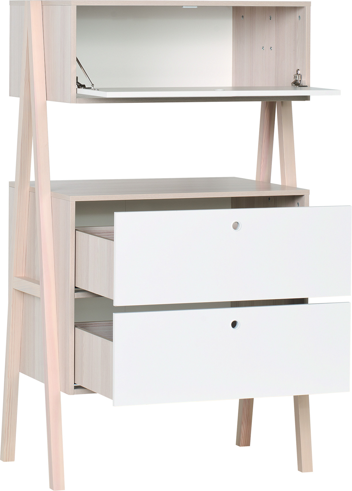 Ve spodní části komody jsou 2 hluboké zásuvky na kovových pojezdech se systémem tichého dovírání a v horní části jsou 1 sklopná dvířka.