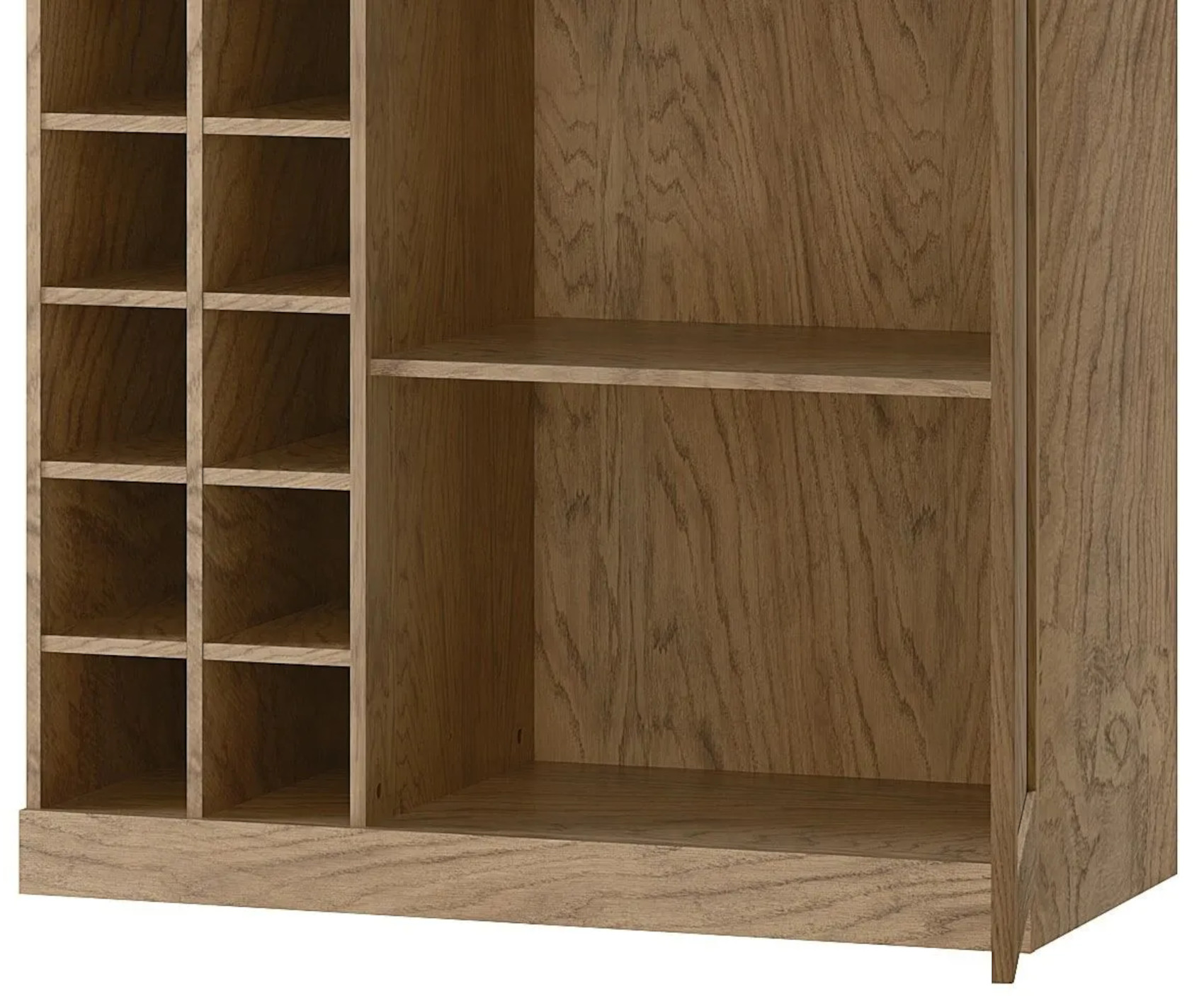 Moderní barová komoda Cozy 15 vás zaujme svým přírodním designem s viditelnou strukturou dřevěných lét. Přední dvířka, se systémem tichého dovírání, jsou vyrobena z masivního dubového dřeva a korpus z přírodní dubové dýhy, která je potažena fólií. Součástí komody jsou kovové úchyty v odstínu černý mat, které dodají nábytku nádech elegance.