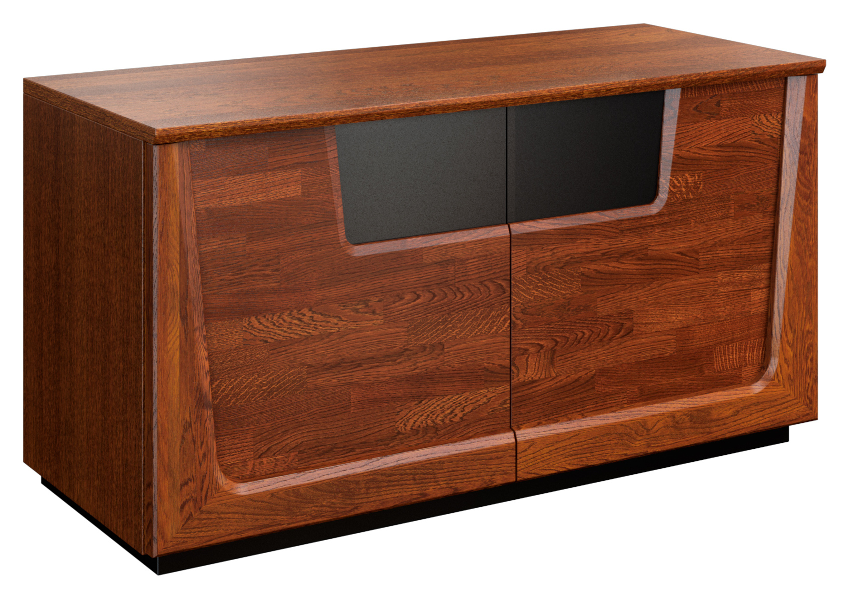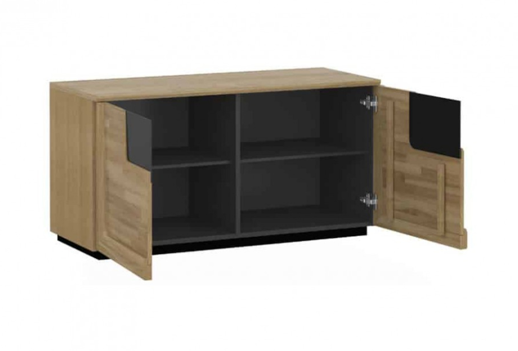 Komoda má 2 plná dvířka, za kterými jsou vloženy 2 lakované police.