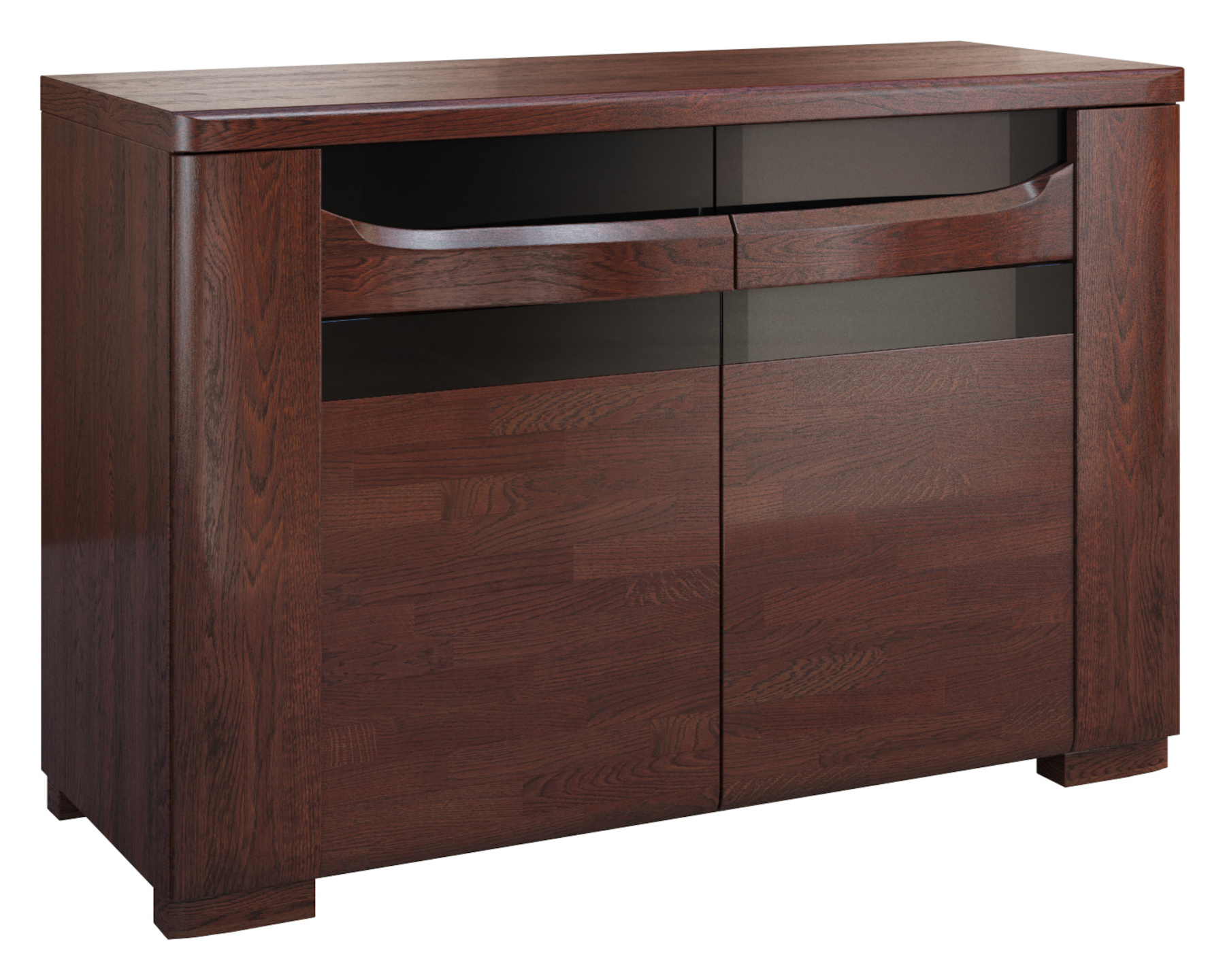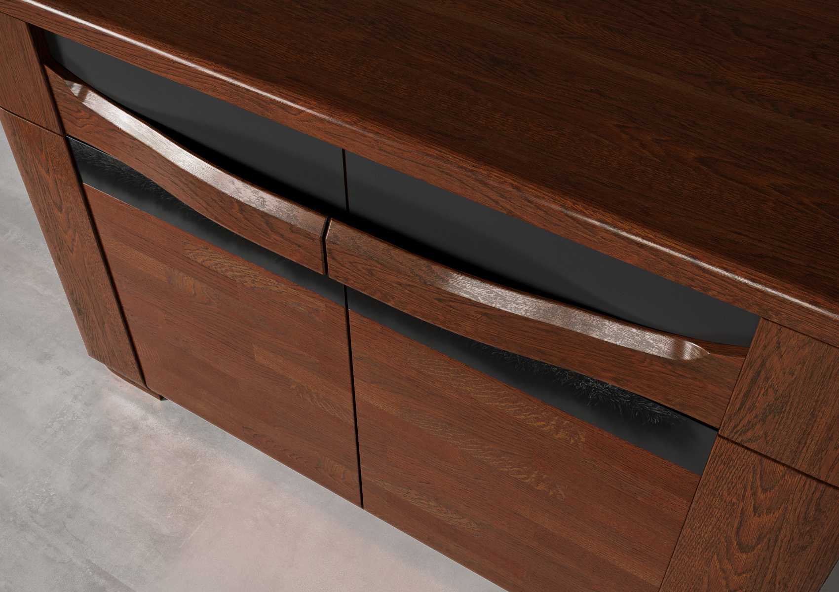 Luxusní komoda Riva 2D je vyrobena z masivního dubového dřeva a přírodní dubové dýhy s černými prvky ze skla Lacobel. Vzhledem k použitému materiálu se jedná o velmi kvalitní a stabilní nábytek. Čtyřvrstvá technologie povrchového moření a lakování dává nábytku jedinečný design s výraznou strukturou lét masivního přírodního dřeva. Úchyty komody jsou z přírodního masivu.