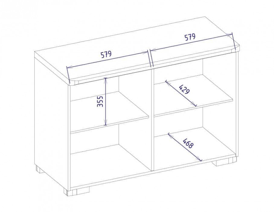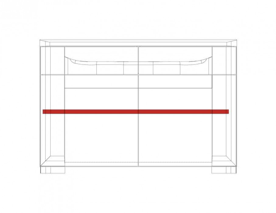 Komoda má 2 plná dvířka, za kterými jsou vloženy 2 lakované police.