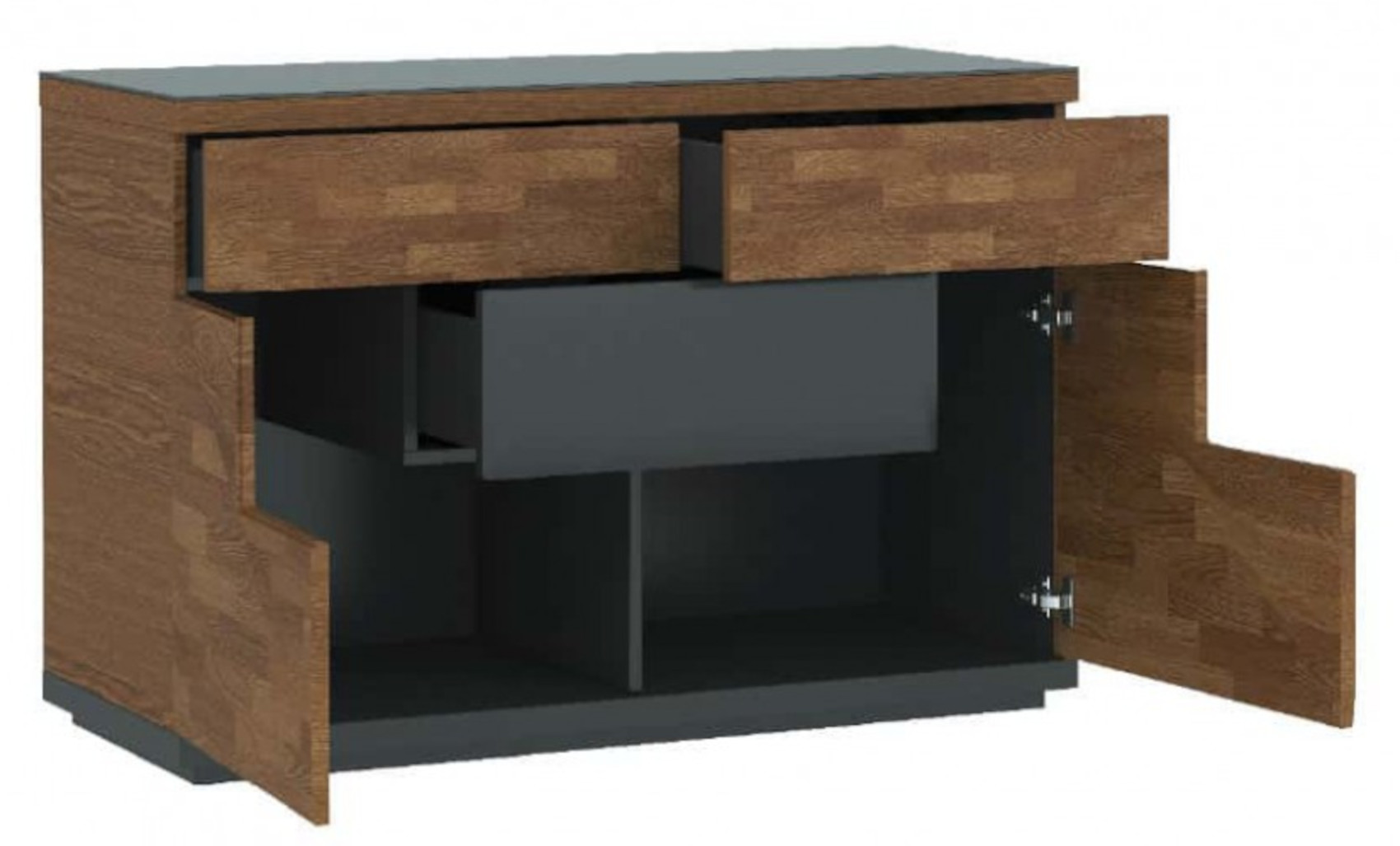 Luxusní komoda Verano 2D3SZ je vyrobena z masivního dubového dřeva a přírodní dubové dýhy. Čtyřvrstvá technologie povrchového moření a lakování dává nábytku jedinečný design s výraznou strukturou lét masivního přírodního dřeva. Součástí komody je sklo Lacobel, které je možné volně položit na jeho horní desku.